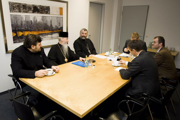 On January 16, 2008, the documents on the purchase are signed (from left to right: Warden of the community Igor Metzger; Rector of the Church of the Protection of the Most-Holy Mother of God, His Eminence Archbishop Mark of Berlin and Germany; Priest Andrej Sikojev; a notary public and representatives of Liegenschaftsfonds Berlin) |