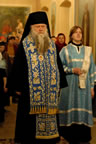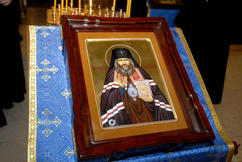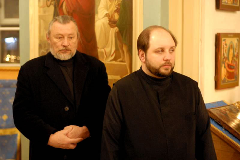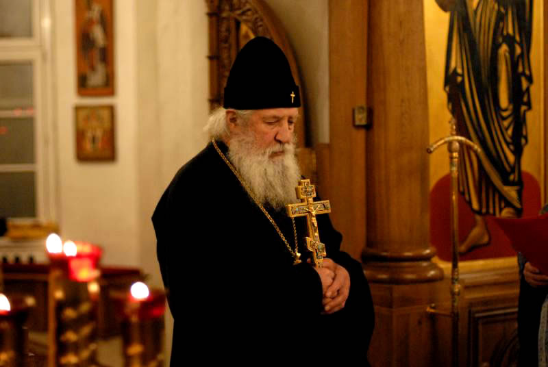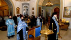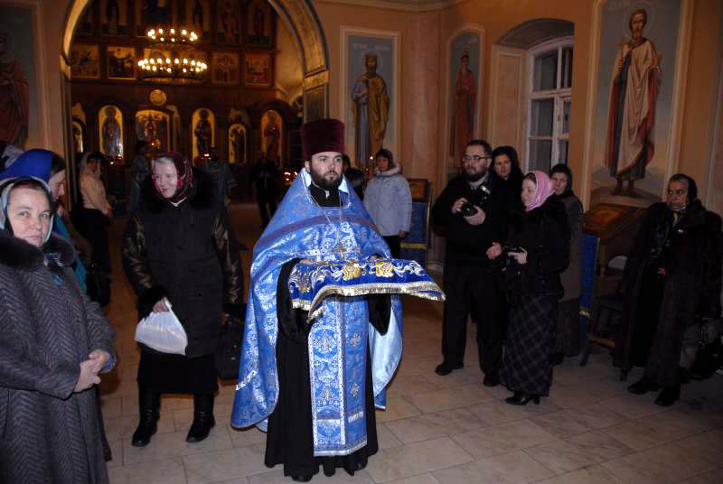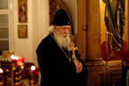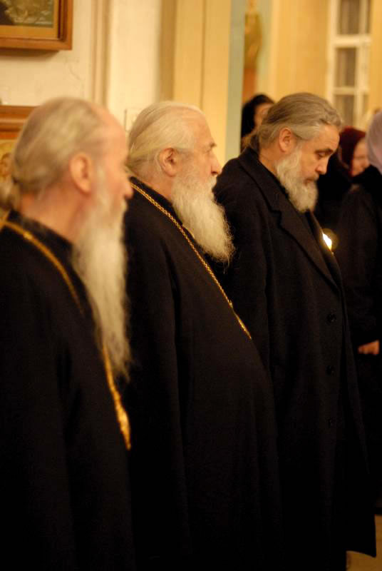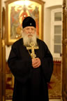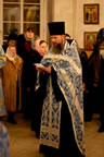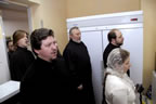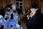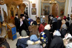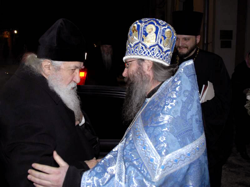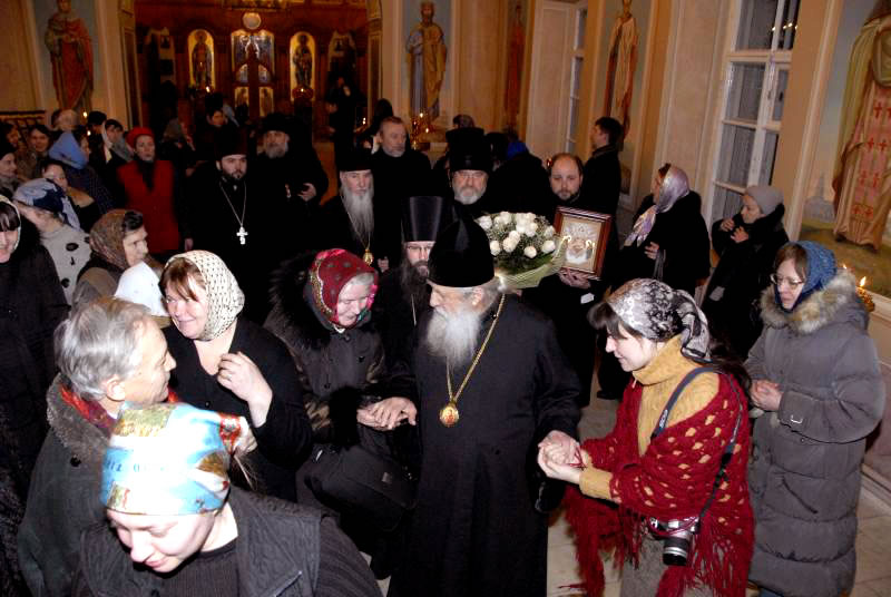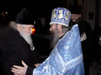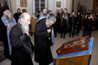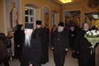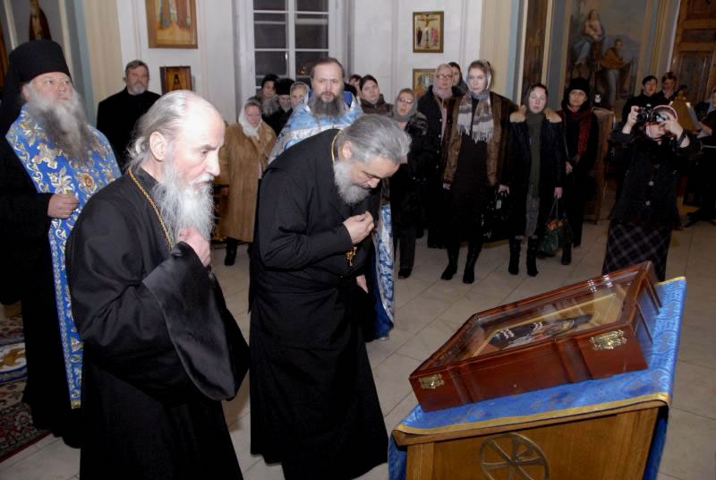 On the evening of Wednesday, February 20, 2008, His Eminence Metropolitan Laurus and the delegates of the Russian Orthodox Church Outside of Russia visited Moscow's St Catherine Representation Church of the Orthodox Church in America. Here His Eminence was ceremoniously greeted by Archimandrite Zacchaeus (Wood), and the clergy and parishioners of St Catherine. His Grace Bishop Peter of Cleveland then, together with the church clergymen, performed a moleben to the Most-Holy Mother of God, St Catherine the Great Martyr and St John (Maximovich) of Shanghai and San Francisco before an icon of the holy bishop, which recently had a relic of his uncorrupt and healing relics installed. This icon was given as a gift to Fr Zacchaeus by His Eminence Archbishop Kyrill of San Francisco and Western America. A moleben is performed here weekly to St John, who is more and more venerated by the Muscovite faithful.