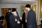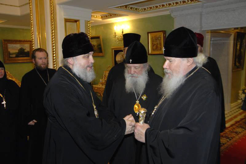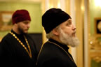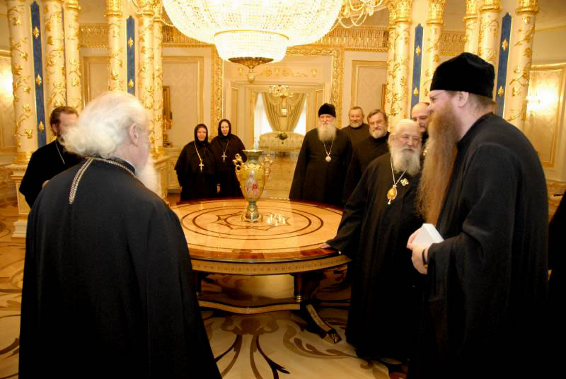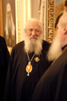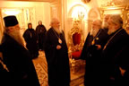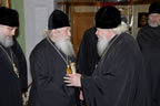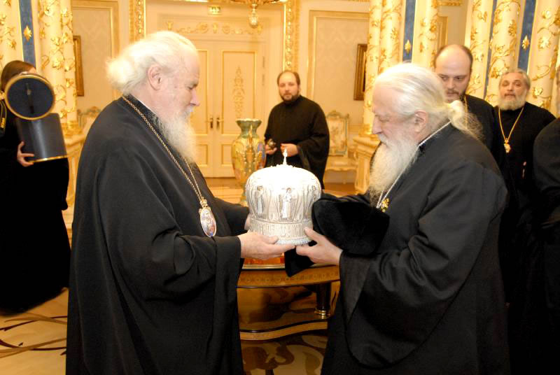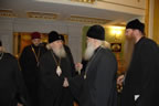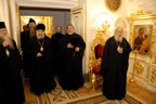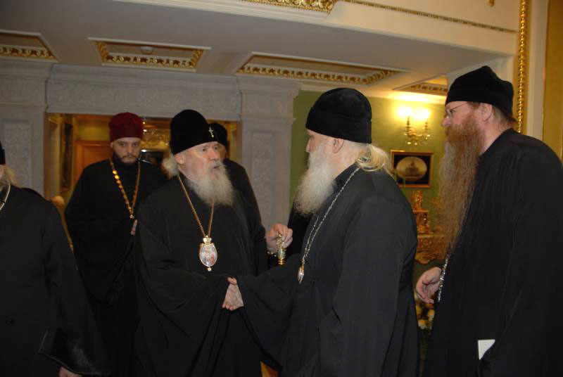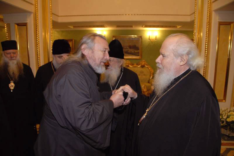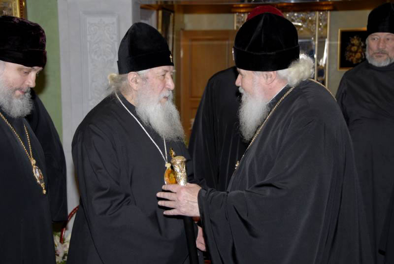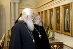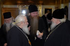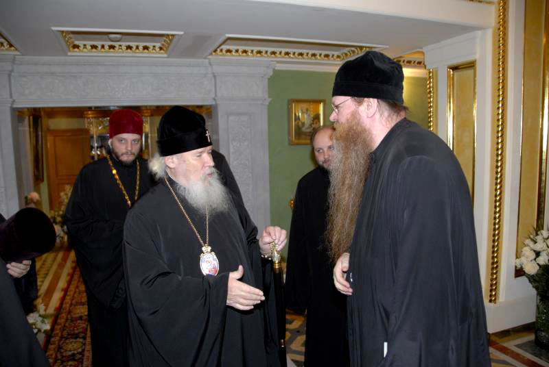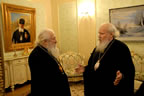 Then, Metropolitan Laurus and the members of the ROCOR delegation were received by His Holiness Patriarch Alexy II at his private residence, where His Holiness hosted a reception in honor of the Primate of the Russian Church Abroad. During the fraternal trapeza, His Holiness talked about church life in Russia, about his patriarchal travels, and answered questions. As he bid farewell to His Eminence, the Patriarch gave him an archpastoral mitre, and to the bishops who did not participate in the ceremonial signing of the Act of Canonical Communion, commemorative panaghias for the May 17, 2007, event.