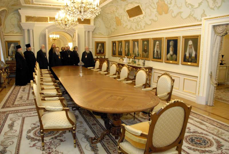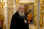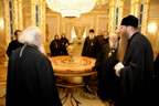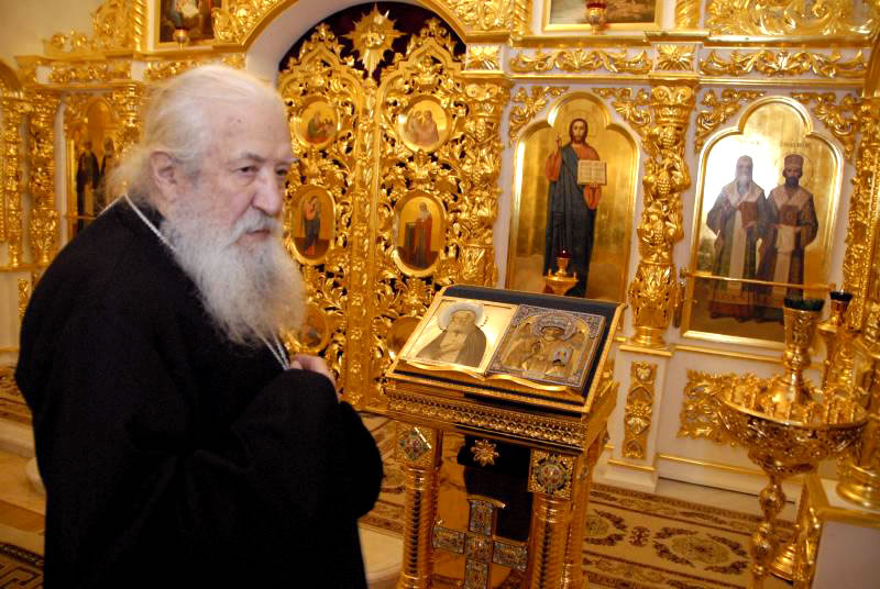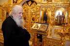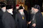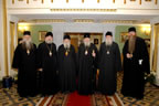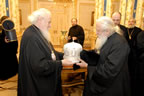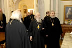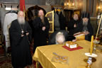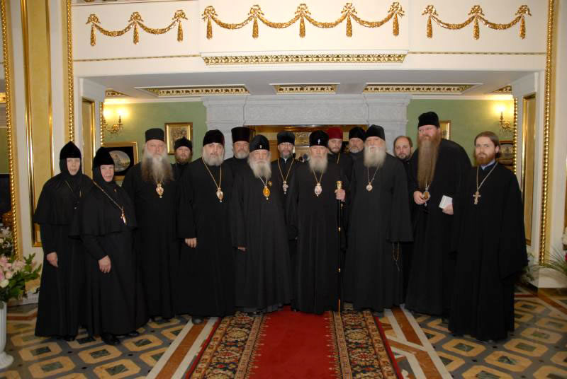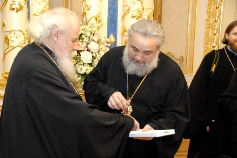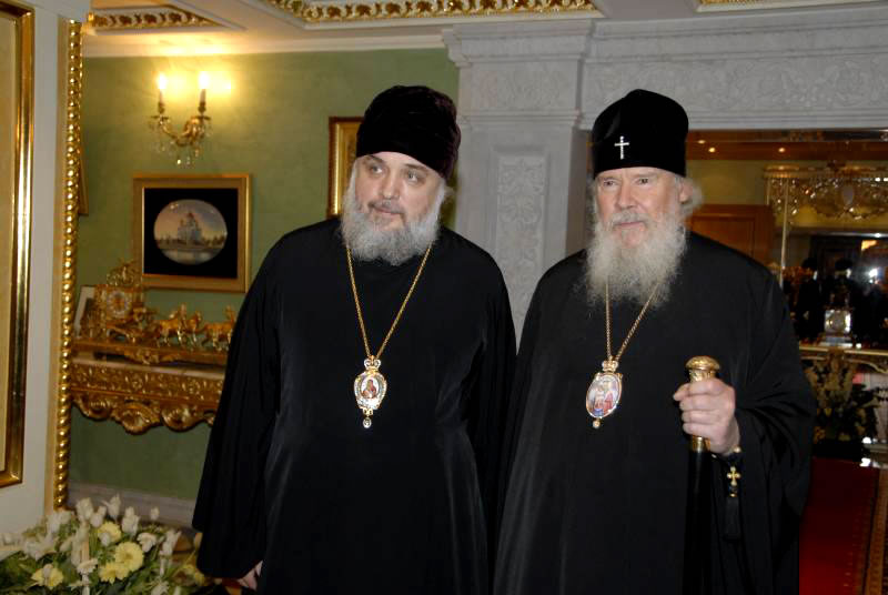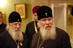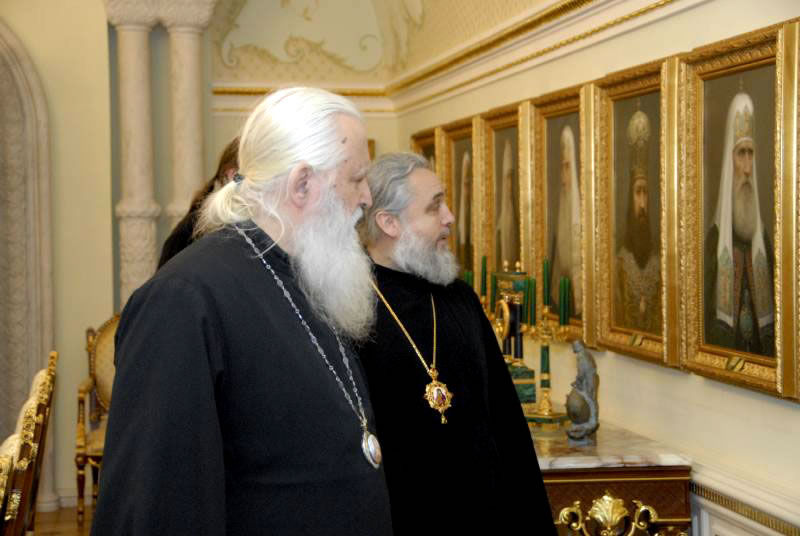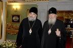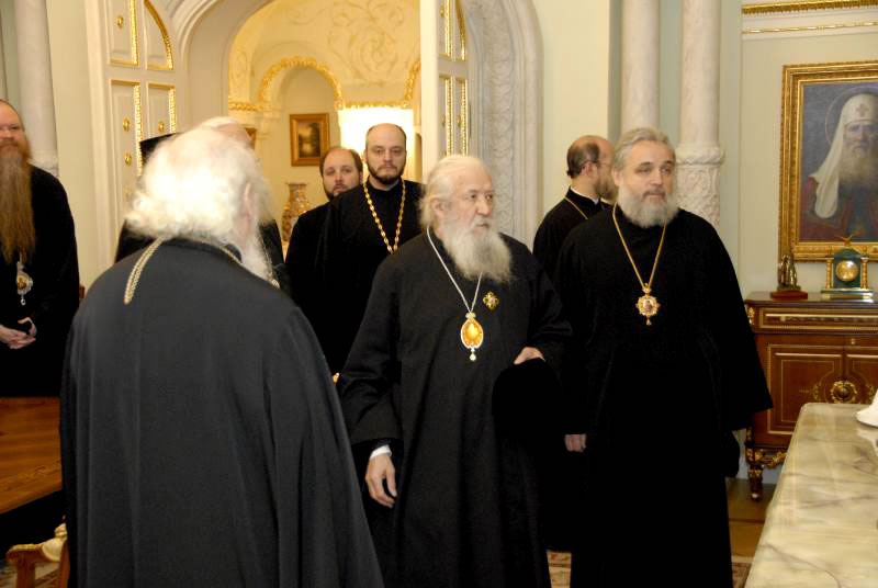 Then, Metropolitan Laurus and the members of the ROCOR delegation were received by His Holiness Patriarch Alexy II at his private residence, where His Holiness hosted a reception in honor of the Primate of the Russian Church Abroad. During the fraternal trapeza, His Holiness talked about church life in Russia, about his patriarchal travels, and answered questions. As he bid farewell to His Eminence, the Patriarch gave him an archpastoral mitre, and to the bishops who did not participate in the ceremonial signing of the Act of Canonical Communion, commemorative panaghias for the May 17, 2007, event.
