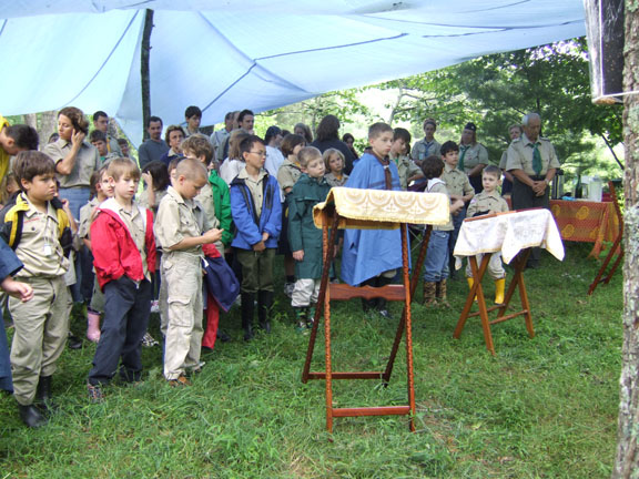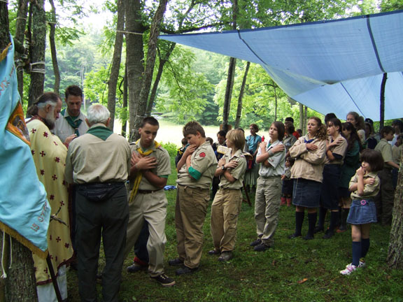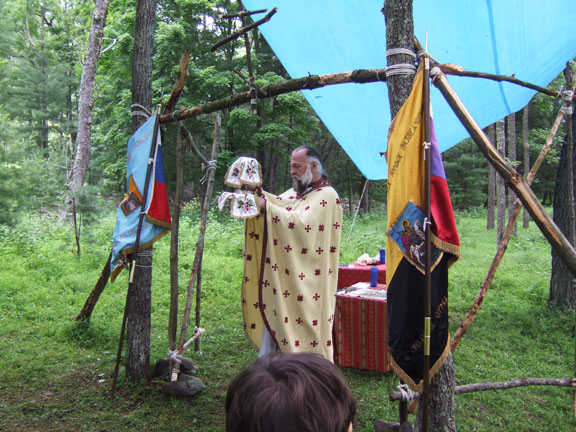 On July 3-4, Protopriest Victor Potapov, rector of the Cathedral of St John the Baptist in Washington, DC, visited the camp. There, amid the wooded hills an open-air chapel was erected, and Divine Liturgy was served. Almost all of the campers went to confession and took Communion. In his homily, Fr Victor emphasized the importance of obeying Christ's commandment to love both God and man, and he mentioned as examples of such love ORYuR's heavenly patron, Great Martyr and Trophy-bearer St George, and also Holy Hierarch St John of Shanghai and San Francisco, who was celebrated on the dates of Fr Victor's visit to camp.