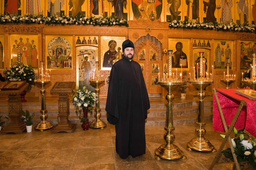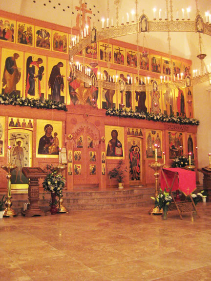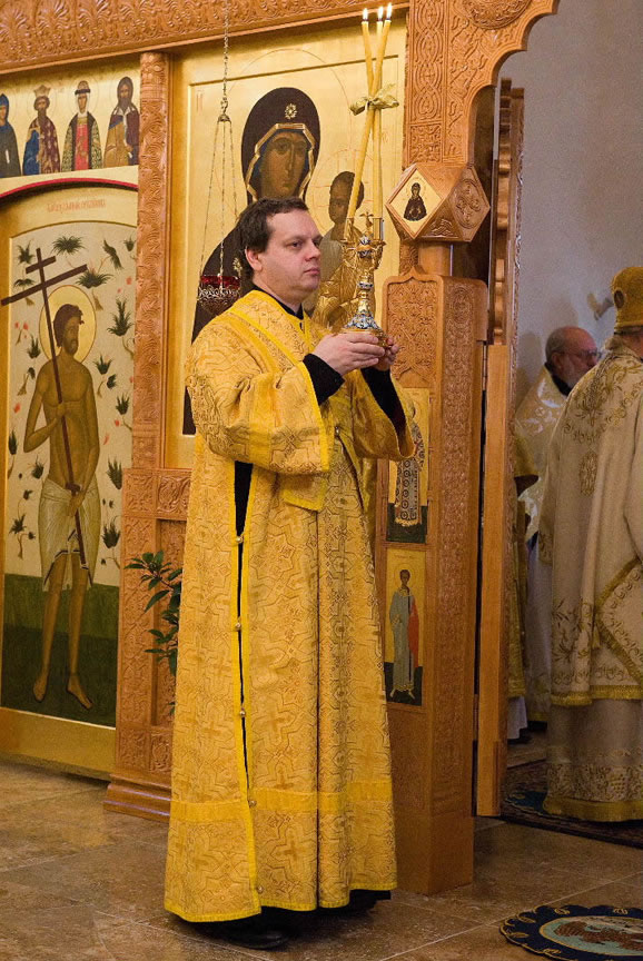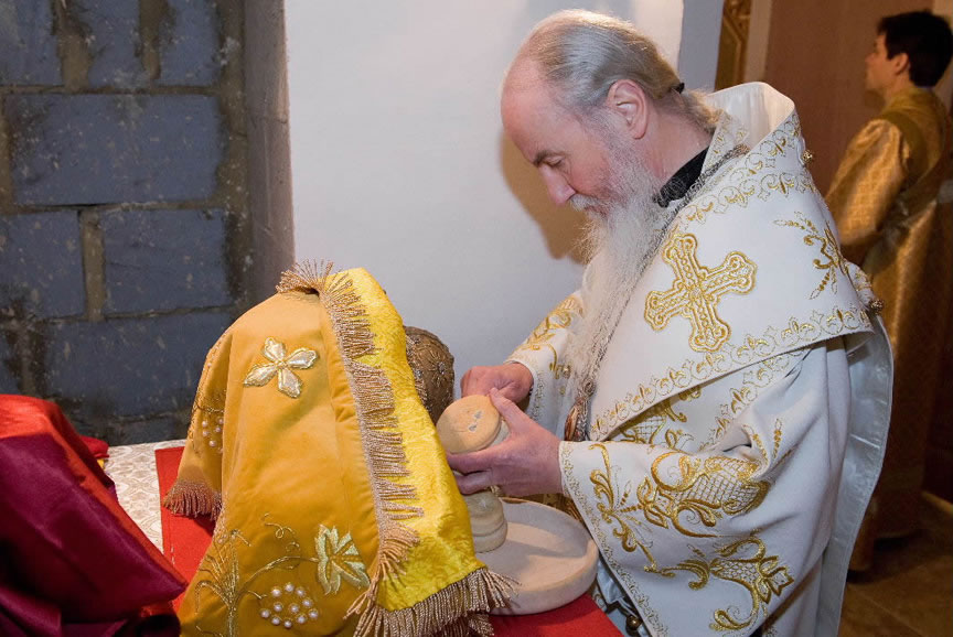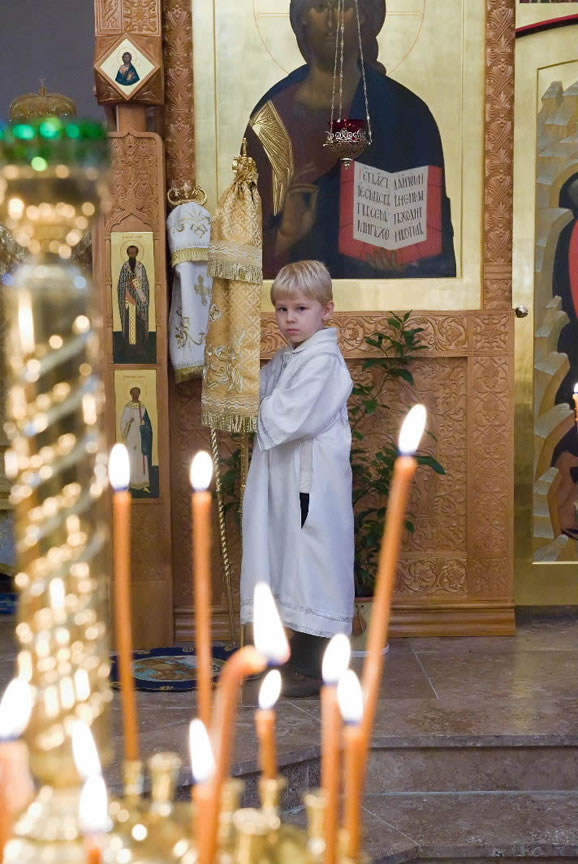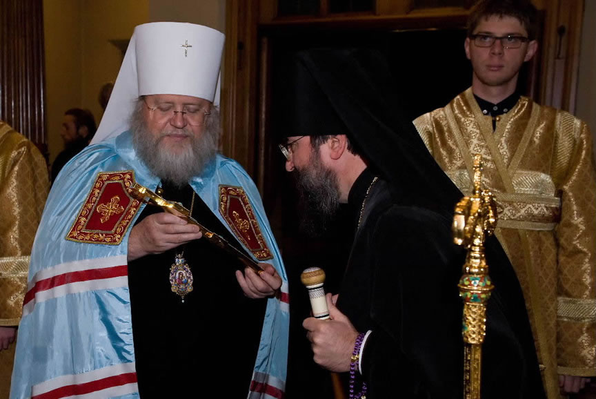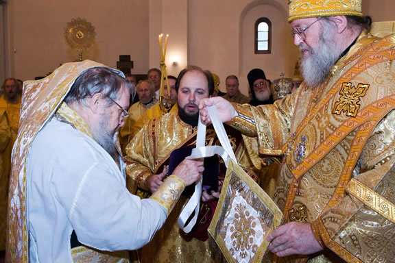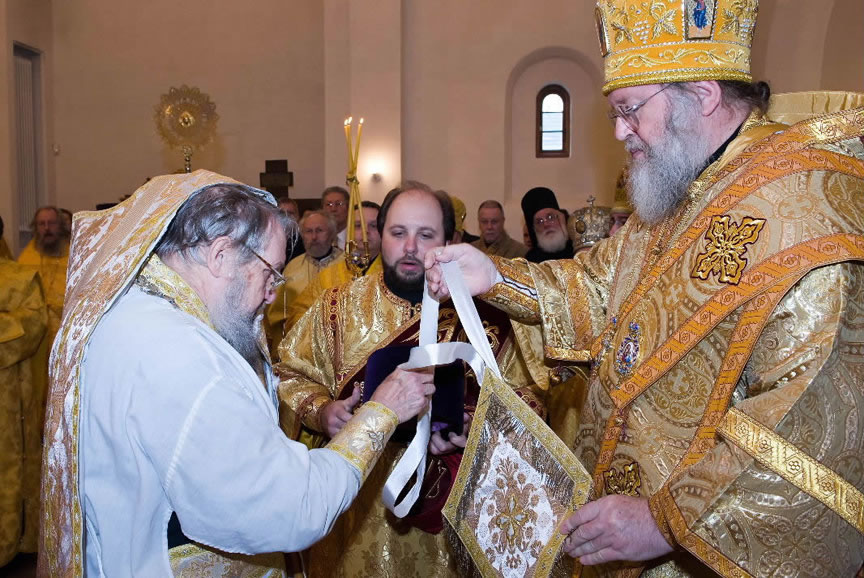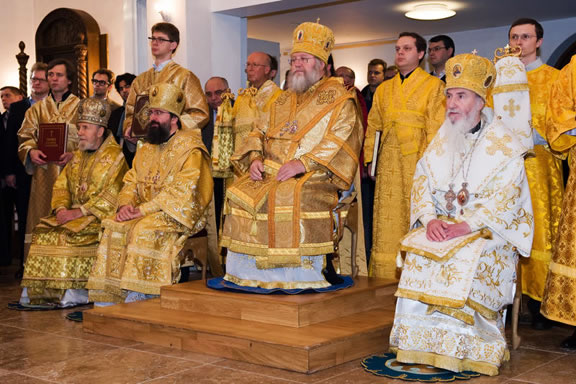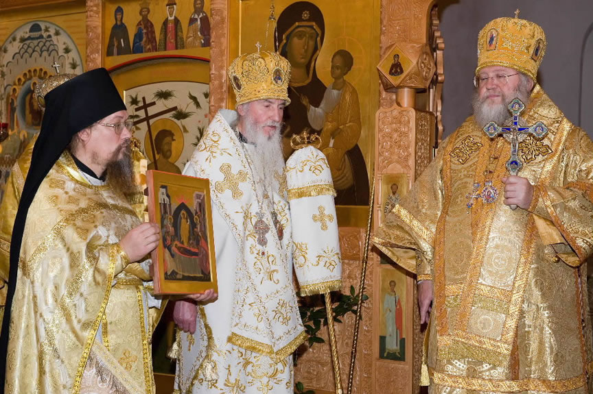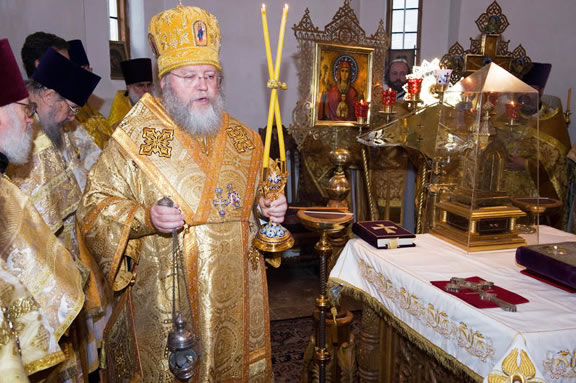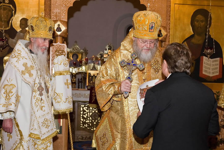 On November 14, His Eminence officiated at Divine Liturgy at Nativity of the Mother of God Cathedral in London along with His Eminence Archbishop Mark of Berlin and Germany, Administrator of the Parishes of the Russian Church Abroad in Great Britain; His Grace Bishop Elisei of Sourozh; and His Eminence Archbishop Anatoly of Kerchensk, and many local clergymen. After the end of Divine Liturgy, His Eminence consecrated the new iconostasis and panikadilo (chandelier) in the upper church. Then His Eminence gave a gramata (decree of blessing) from the President of the Synod of Bishops to SD Kondrashov "in view of his earnest labors, generosity and active participation in church life."