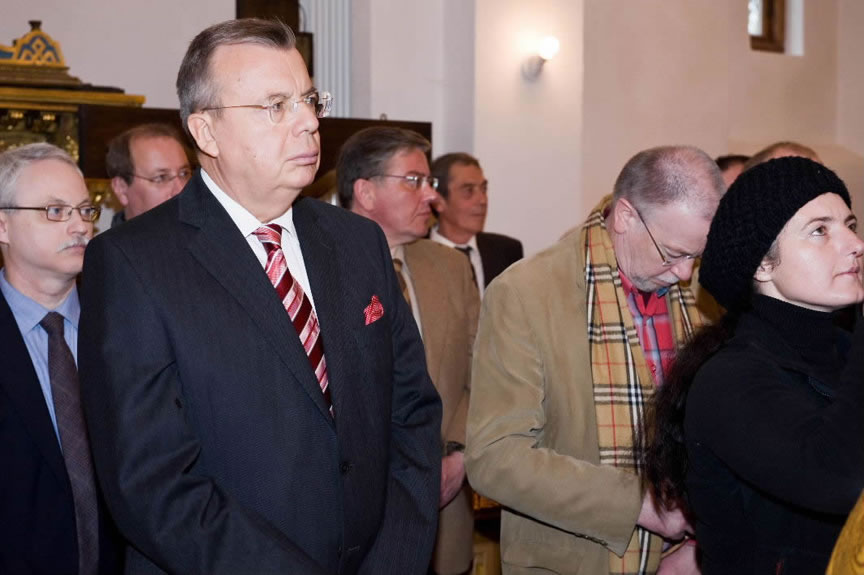 From November 9-15, 2009, His Eminence Metropolitan Hilarion visited the parishes of the Russian Orthodox Church Outside of Russia in Liverpool, Mattingham and Colchester, and performed a moleben at the relics of St Alban the Martyr. His Eminence's schedule in London included meetings with Metropolitan Kallistos (Ware) of Diokleia and Orthodox students of Oxford University. Metropolitan Hilarion also met with the Archbishop of Canterbury, Rowan Williams, and visited Westminster Abbey. Later, Yuri Fedotov, Russian Ambassador to the United Kingdom, hosted a reception in honor of the high guest.