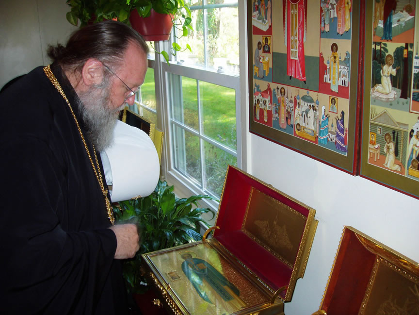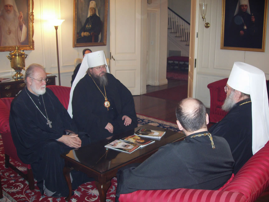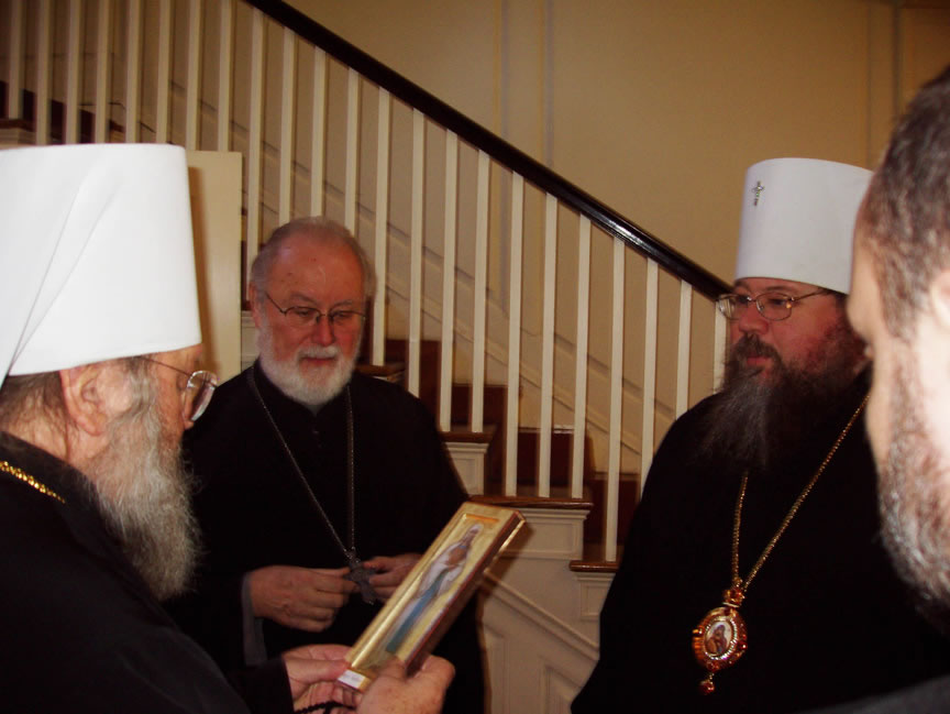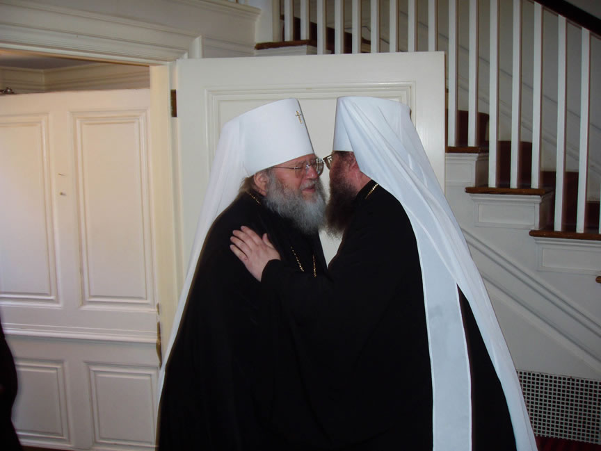 After venerating the cross, the two Primates discussed questions relating to establishing official dialog between the two Churches to study the origins of their division and correcting the problems which hinder the fullness of ecclesiastical communion. Also participating on behalf of the Orthodox Church in America were Archpriest Alexander Garklavs, Chancellor of the OCA; Archpriest Leonid Kishkovsky, Director of External Affairs and Interchurch Relations, and Archpriest Eric Tosi, Secretary of the OCA. Representing the Russian Orthodox Church Outside of Russia were also Archimandrite John (Magramm) and Protopriest Serafim Gan, Chancellor of the Synod of Bishops and Personal Secretary of the First Hierarch.