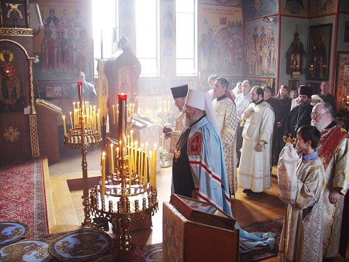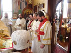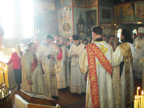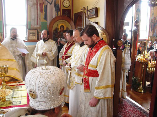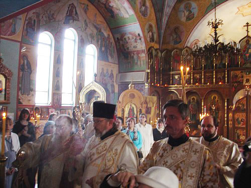 On Saturday evening, His Eminence officiated at all-night vigil, and on Sunday, he led the celebration of Divine Liturgy. Vladyka was joined by Priest Victor Boldewskul, Rector of Epiphany Church; Priest Alexei Aedo of Chile; Priest Brendan Crowley (during vigil); along with Protodeacon Joseph Jarostchuk; Protodeacon Thomas Reske; Protodeacon Nicholas Drobot; Deacon Alexander Jarostchuk; Deacon Nicholas Olhovsky andDeacon Eugene Kallaur. During the minor entrance, Deacon Alexander was elevated to the rank of protodeacon. His Eminence also performed two ordinations: after the Great Entrance, Protodeacon Thomas Reske was ordained to the priesthood, and after the Eucharistic Canon, Vladyka Hilarion ordained Subdeacon Victor Ganson to the deaconate. It is interesting that on this same day, Hieromonk Joasaph (MacLellan), who grew up in Epiphany Church and was a reader and choir director at the parish, was elevated to the rank of archimandrite in Munich.