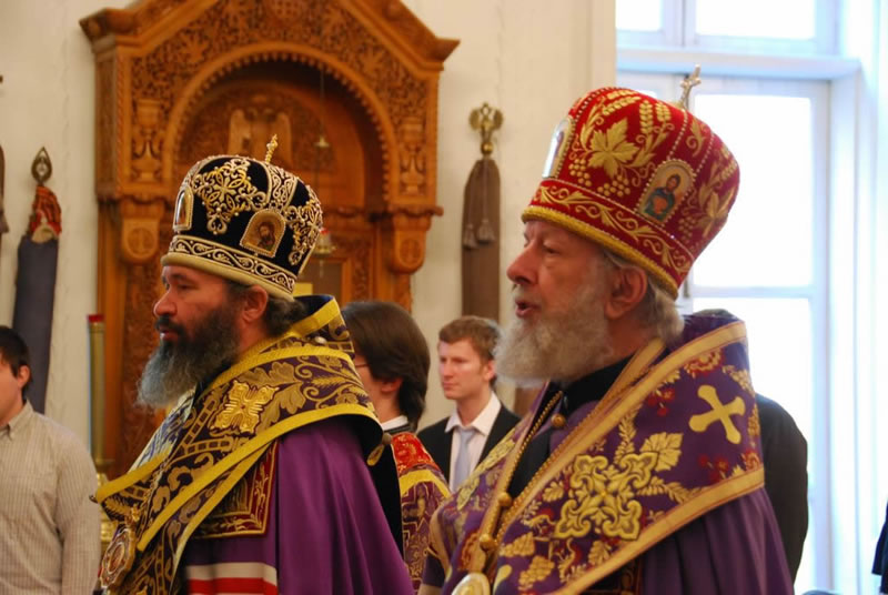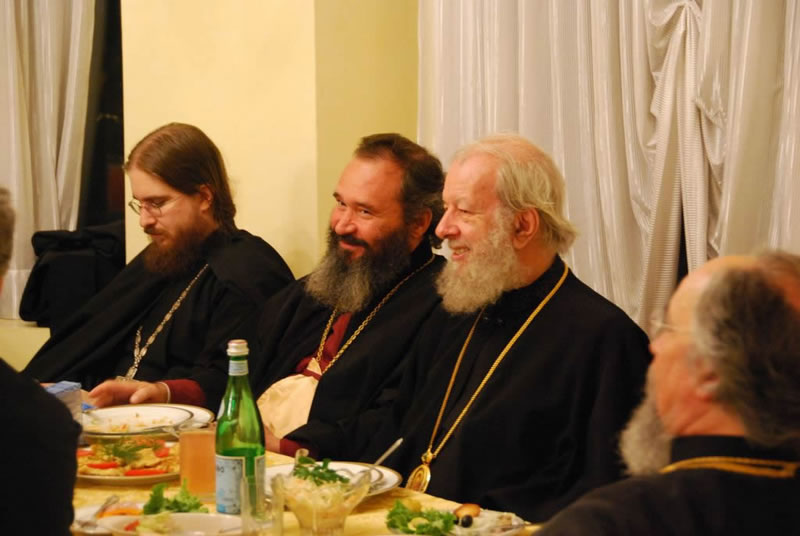 Later that day the symposium members prayed at all-night vigil at St Nicholas Patriarchal Cathedral, where the Pochaev Icon of the Mother of God was brought from Holy Trinity Monastery in Jordanville This icon was brought out of Russia in 1920. After the service, the ROCOR and Patriarchal clergymen and youth, along with Vladyka Justinian and Vladyka Jerome, continued their discussions at a trapeza.