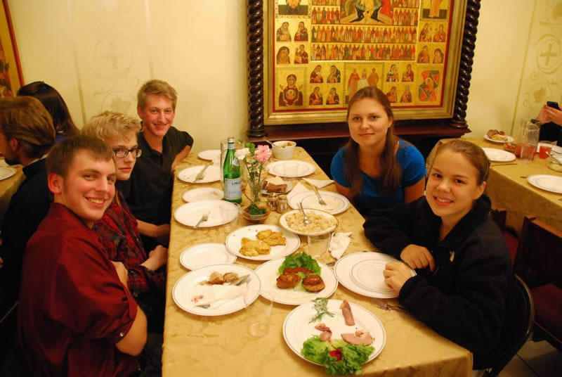 The central event of the second day of the symposium was Divine Liturgy, at which Archbishop Justinian and Bishop Jerome officiated. After the service, the young people were treated to a trapeza prepared by the Synodal Cathedral Sisterhood.
