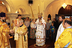 On June 23, 2012, His Eminence Metropolitan Ilarion of Volokolamsk, President of the Department of External Church Relations of the Moscow Patriarchate, visiting China with the blessing of His Holiness Patriarch Kirill of Moscow and All Russia, and at the invitation of the State Administration on Religious Affairts of the People’s Republic of China (PRC), celebrated Divine Liturgy at St Nicholas Church in Shanghai. As he entered the church, flowers were presented to him by students of the Sunday school, and Mr M Drozdov, President of the Russian Club, welcomed him on behalf of the local Orthodox community.