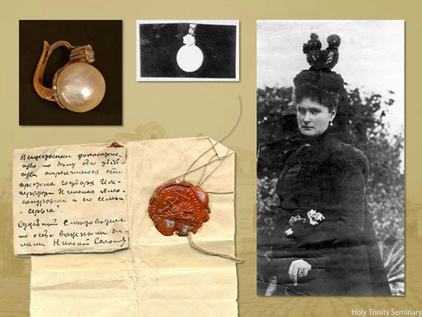 Fr Vladimir concluded his presentation by announcing that another item had been added to the collection of objects from Ekaterinburg just the previous day. A pearl-and-diamond earring belonging to Empress Alexandra Fedorovna was received from His Eminence Metropolitan Hilarion on behalf of the Synod of Bishops of the Russian Orthodox Church Abroad. The earring was found in 1918 near the village of Koptiaki where the Bolsheviks attempted to destroy the bodies of the murdered Royal family. It should be noted that an envelope with Nikolai Sokolov’s handwritten description of the earring was among the objects and documents donated by Archbishop Kyrill. Now, after a period of several decades, the earring and the envelope that once contained it will be reunited.