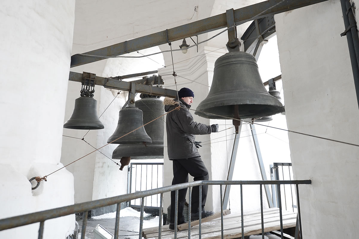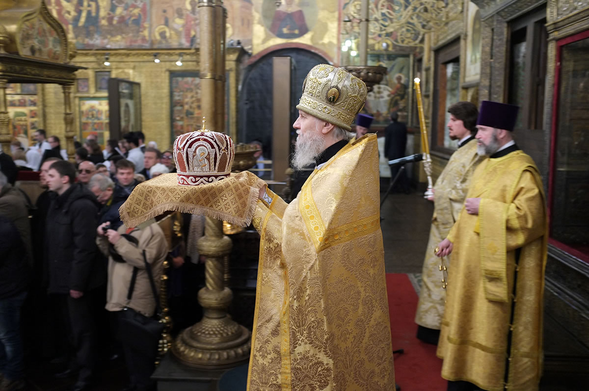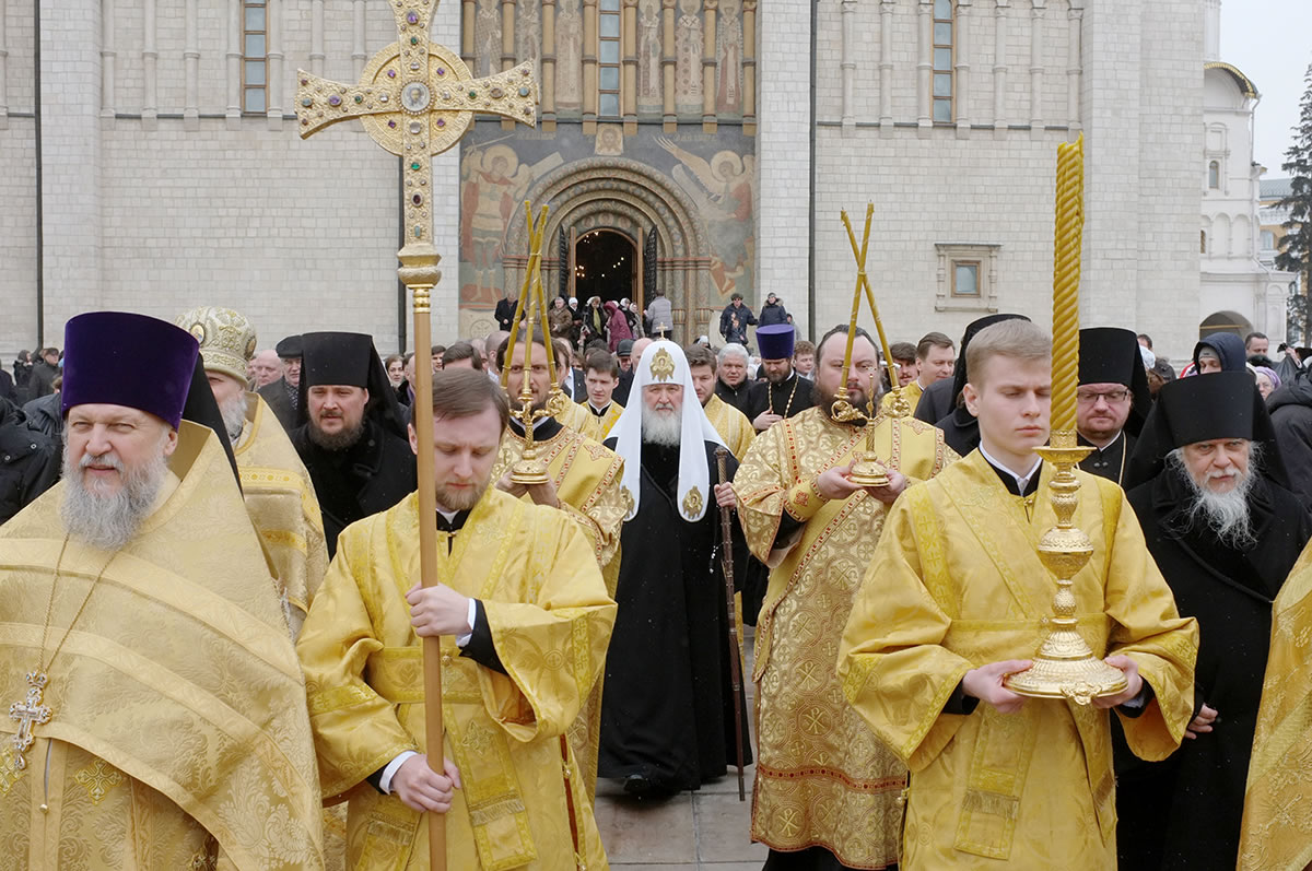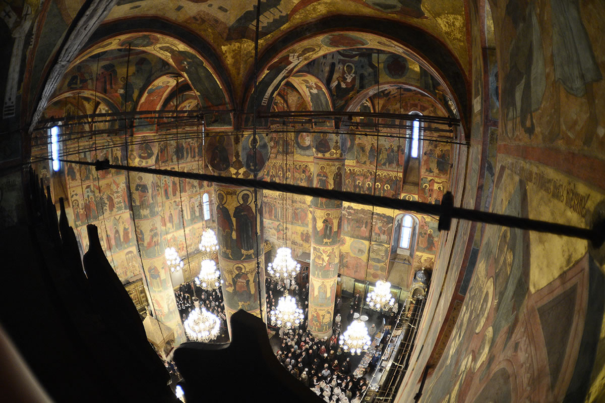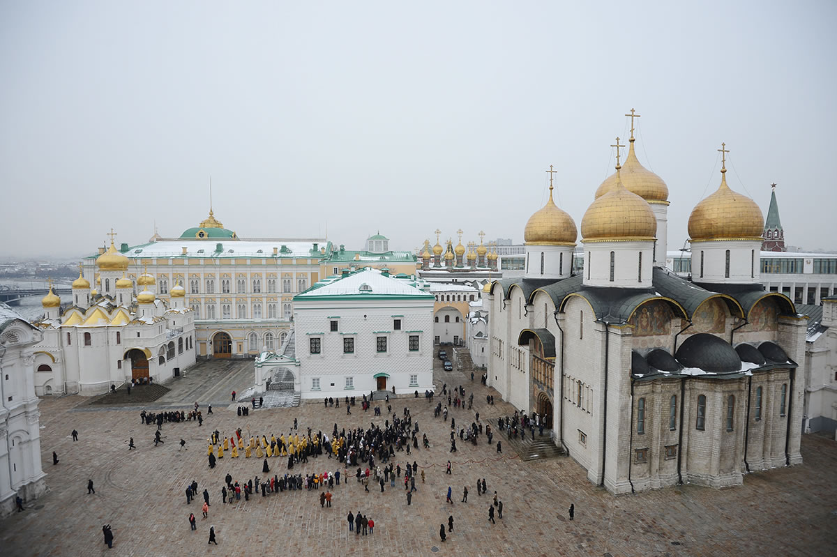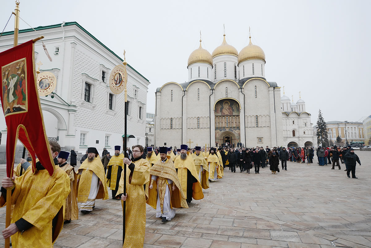 The procession of the cross was accompanied by ringing of the bells in accordance with the “solemn processional” manner. After the litiya, the “royal victorious ringing” resounded, a melody resurrected by the bell-ringers of the Kremlin and Christ the Savior Cathedral on the basis of the coronation theme in Mussorgksy’s opera “Boris Godunov.” It was rung on the first, second and third levels of the Ivan the Great Bell Tower, as well as the “Reut” bell hanging in Uspensky’s bell tower. This bell is the oldest thousand-pud (36,000+ pound) bell created by the master Andrei Chokhov in 1622. The bell’s inscription mentions Tsar Mikhail Feodorovich Romanov and his father, Patriarch Philaret Nikitich Romanov.