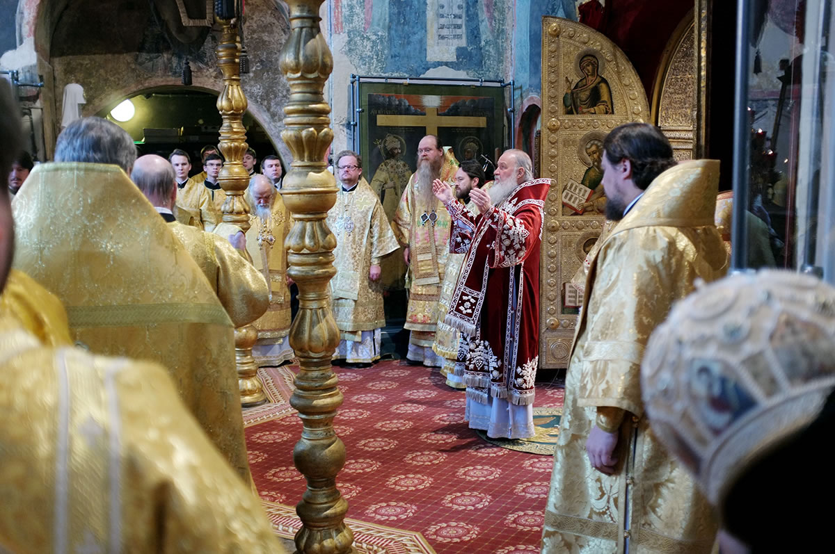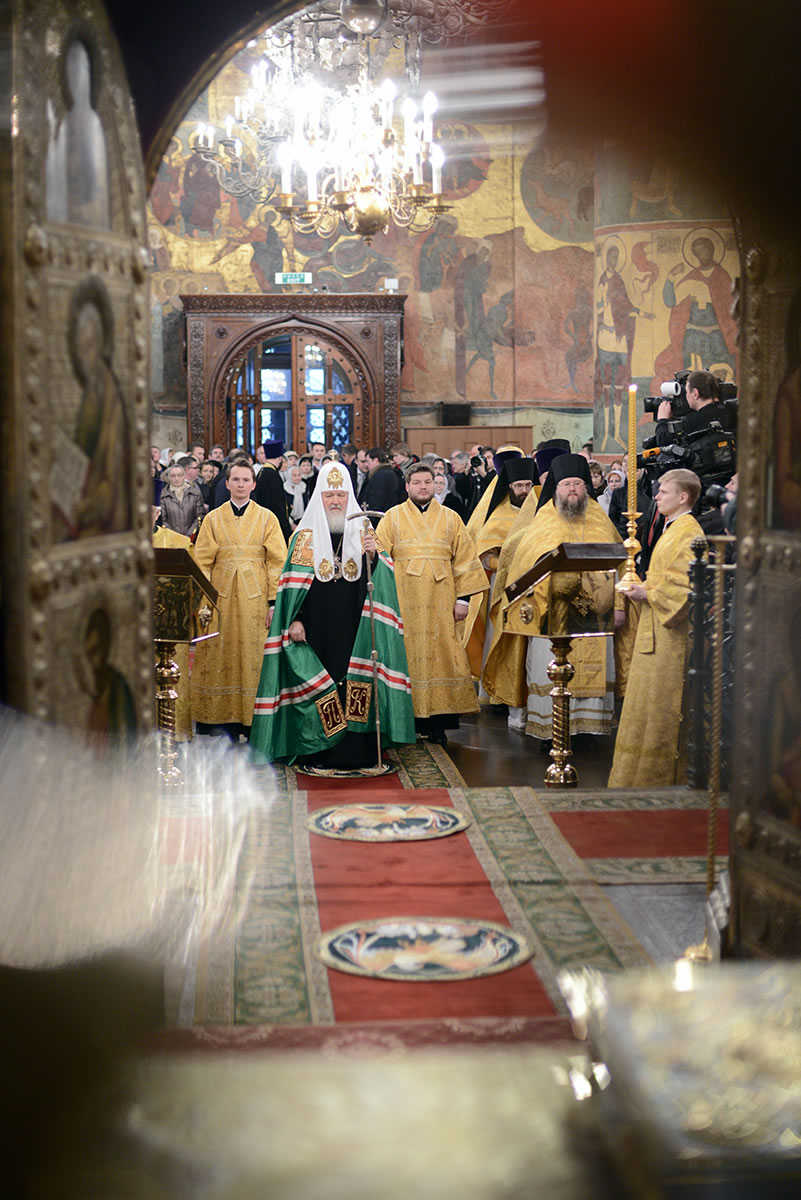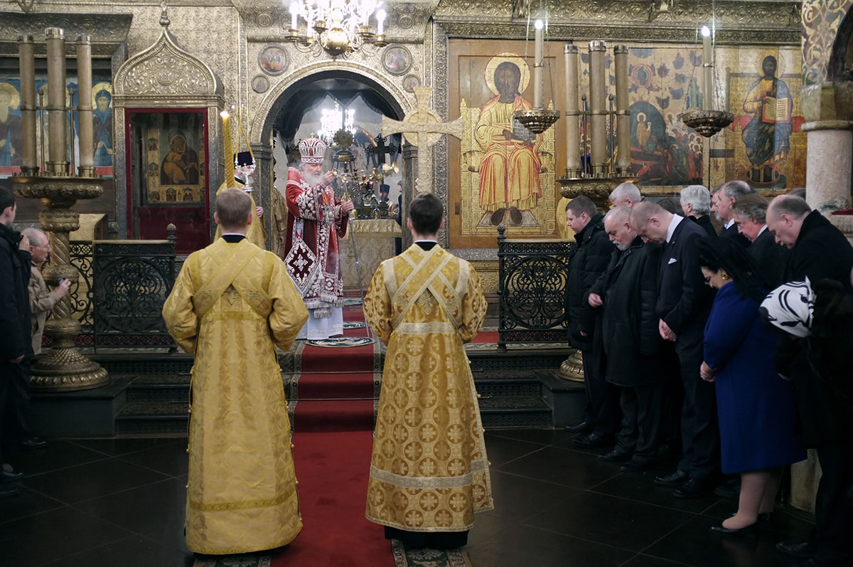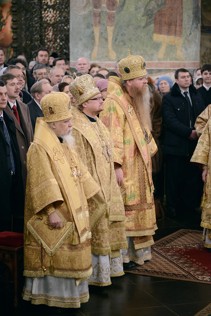 His Holiness was joined in the service by: His Eminence Metropolitan Ilarion of Volokolamsk, President of the Department of External Church Relations; His Eminence Archbishop Mark of Egorievsk, Head of the Moscow Patriarchate’s Administration for Institutions Abroad; His Grace Bishop Agapit of Stuttgart of the Russian Orthodox Church Outside of Russia; His Grace Bishop Feofilakt of Dmitrovsk; His Grace Bishop Ignaty of Bronnitsk, President of the Synodal Department on Youth Ministry; His Grace Bishop Sergi of Solnechnogorsk, Head of the Administrative Secretariat of the Moscow Patriarchate; His Grace Bishop Panteleimon of Smolensk and Vyazemsk, President of the Synodal Department of Church Philanthropy and Social Service; Protopriest Vladimir Divakov, Moscow Secretary of the Patriarch of Moscow and All Russia; Archimandrite Tikhon (Shevkunov), Prior of Sretensky Stavropighial Monastery; Archimandrite Savva (Tutunov), Deputy Chancellor of the Moscow Patriarchate; Protopriest Vsevolod Chaplin, Chairman of the Synodal Department of Church-Social Relations; Protopriest Vladimir Siloviev, Editor-in-Chief of the Publishing Arm of the Moscow Patriarchate; Protopriest Mikhail Ryazantsev, Senior Priest of Christ the Savior Cathedral; Protopriest Alexander Dasaev, Dean of Moscow’s Voskresensky Deanery; Protopriest Anatoly Kozha, Deano of Moscow’s Paraskeva Pyatnitsa Deanery; Protopriest Anatoly Rodionov, Dean of Vlachersky Deanery of Moscow; Protopriest Oleg Korytko, Head of the Office of the Moscow Patriarchate; Hieromonk Nikon (Belavenets) and other clergymen of Moscow.