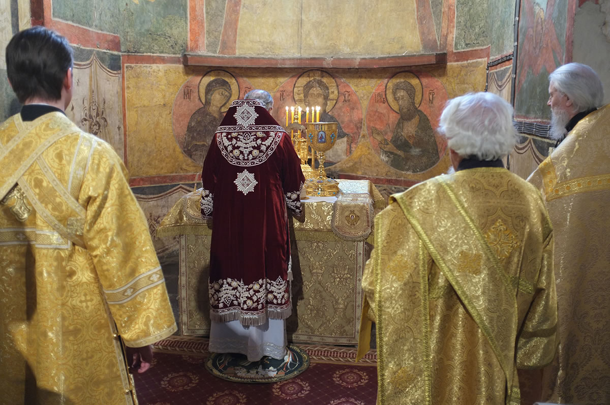 A procession of the cross then headed for Archangelsky Cathedral, which contains the crypts of many Russian rulers, including those of the House of Romanovs. A litiya was performed in the cathedral for the repose of the souls of the Russian rulers, “laid to rest here and elsewhere,” as the names of the members of the Romanov Dynasty were read.