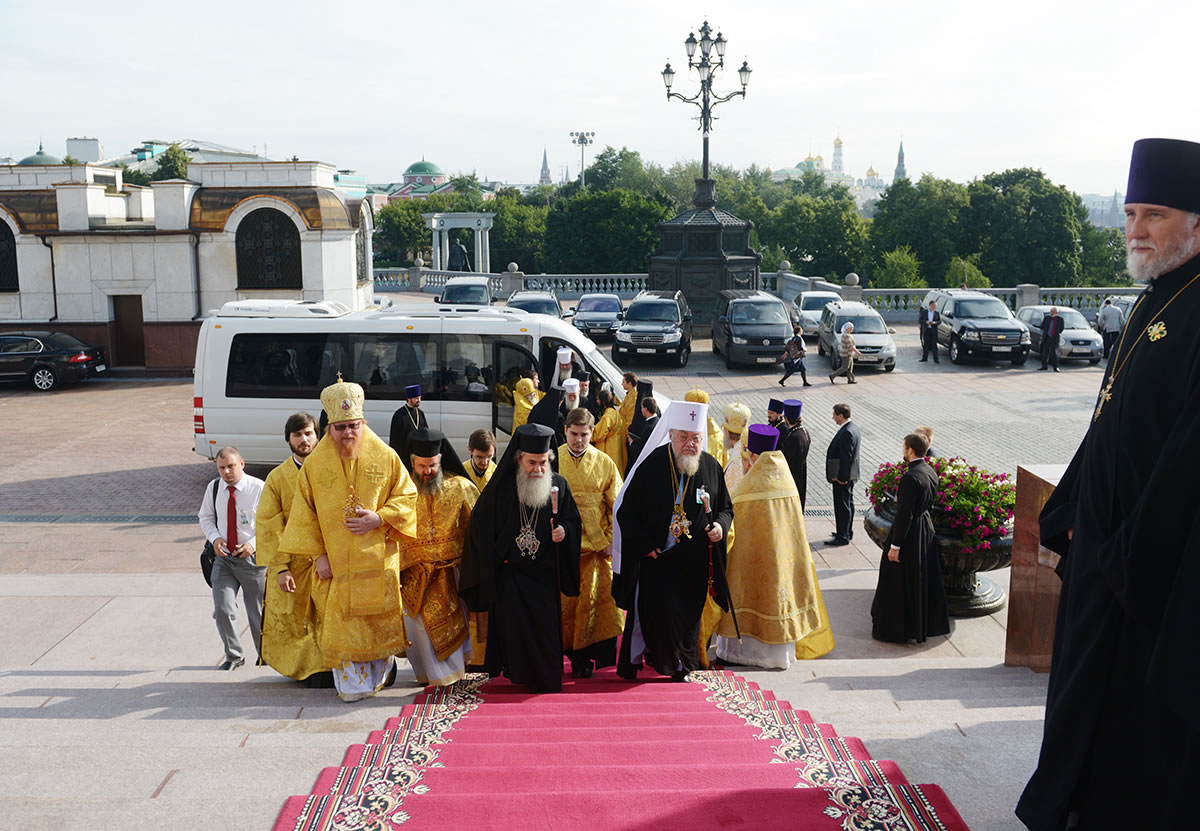 The service was celebrated by His Beatitude Patriarch Theodore of Alexandria and All Africa; His Beatitude Patriarch Theophilos III of the Holy City of Jerusalem and All Palestine; His Holiness Patriarch Kirill of Moscow and All Russia; His Holiness and Beatitude Katolokos-Patriarch Ilia II of All Georgia; His Holiness Patriarch Irenej of Serbia; His Holiness Patriarch Neofit of Bulgaria; His Beatitude Archbishop Chrysostomos II of New Justiniana and All Cyprus; His Beatitude Metropolitan Savva of Warsaw and All Poland, and His Beatitude Metropolitan Tikhon of All America and Canada of the Orthodox Church in America, who all came to the territory of the Russian Orthodox Church to participate in the celebration of the 1025th anniversary of the Baptism of Russia.