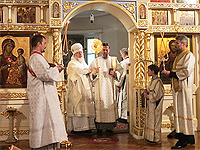 On Monday, August 19, 2013, the feast day of Transfiguration of Our Lord and Savior Jesus Christ, His Eminence Metropolitan Hilarion led Divine Liturgy in the Synodal Cathedral of Our Lady "of the Sign." The First Hierarch of the Russian Church Abroad was joined by the cathedral's clergy: Protopriest Andrei Sommer, Priest Nicholas Olhovsky - the caretaker of the Kursk-Rook Icon of the Mother of God "of the Sign," Hieromonk Tikhon (Gaifudinov) and Protodeacon Nicolas Mokhoff. During Liturgy, Subdeacon Nizariy Fataliyeff was ordained to the diaconate by His Eminence. After Liturgy, Metropolitan Hilarion blessed the newly-harvested fruits in accordance to tradition. The clergy and the parishioners enjoyed a bountiful festal meal prepared by the Sisterhood of the cathedral.