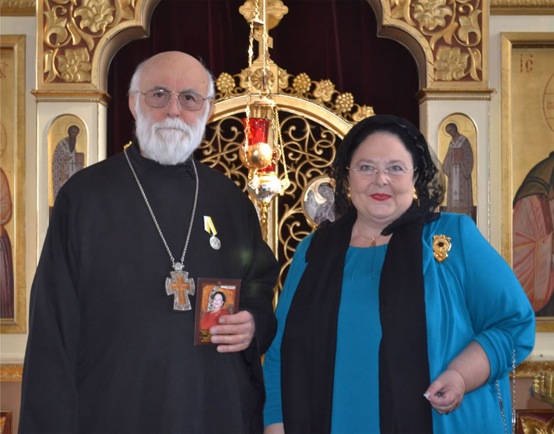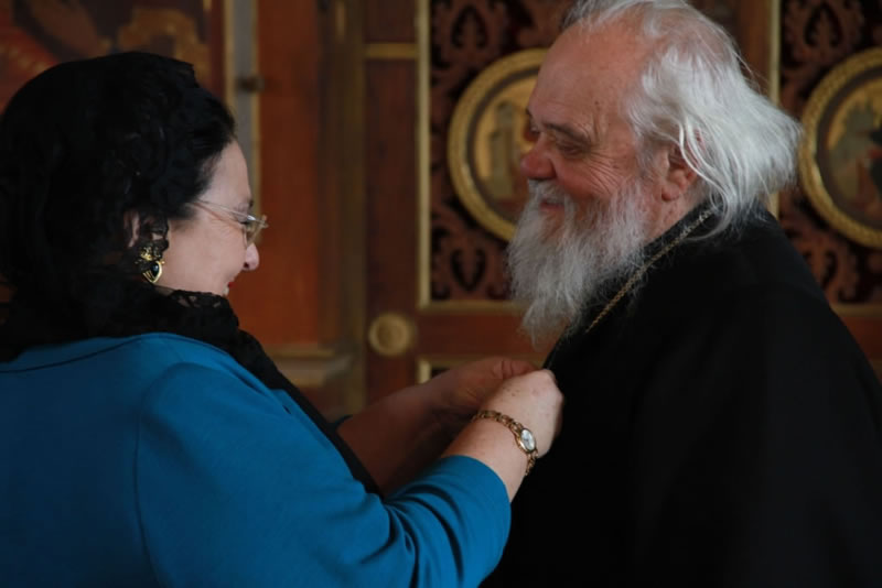 On her part, the Grand Duchess awarded Metropolitan Hilarion with the Medal of the All-Russian Podvig , 1613-2013. The other bishops were likewise given medals, as the staff members of the Synodal Administration: Fr Serafim, Chancellor of the Synod of Bishops; Protopriest Andrei Sommer, Senior Priest of the cathedral; Priest Nicholas Olhovsky, caretaker of the Kursk-Root Icon; Protodeacon Eugene Kallaur, webmaster of the official Synod website; Nicholas A. Ohotin, Communications Director/Jurisconsult; Sergey Yakushin, Warden of the cathedral, Subdeacon George Schatiloff, Building Manager, and Eugene Grigoriak, Assistant Treasurer. Her Imperial Highness also gave a three-tome collection published in memory of the occasion to Holy Trinity Seminary: Holy Mt Athos, the Orthodox Church and the Romanov Dynasty in Exile, along with a book on the history of present situation of the Romanov Dynasty in Russian and English, By God’s Mercy.