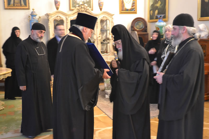 After venerating the holy image, His Holiness blessed Protopriest John Sorochka and Protopriest Vladimir Deriugin, Nectarios Yangson, keeper of the icon, and their colleagues, wishing them a successful visit and Divine aid. It is expected that the icon will visit many parishes and monasteries in Georgia.