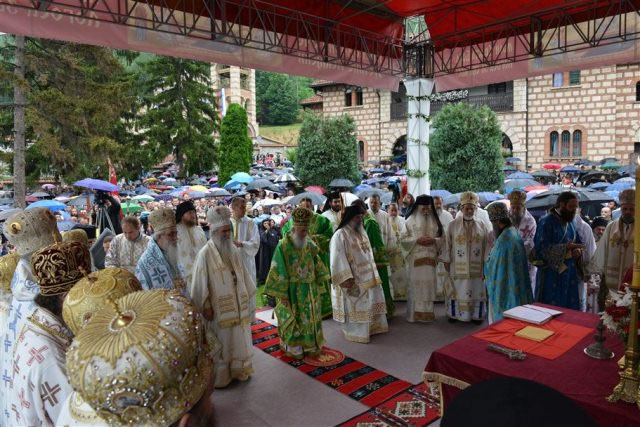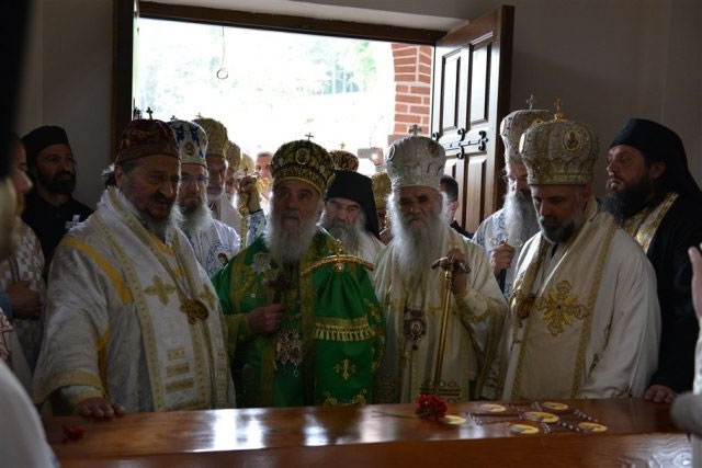 His Holiness Patriarch Irinej of Serbia officiated at the celebrations. He was joined by the monastery’s Bishop Milutin of Celije; His Eminence Metropolitan Athanasios of Limassol (Church of Cyprus); His Eminence Metropolitan Nikolaos of Messogea and Lavreotik i (Church of Cyprus); His Eminence Archbishop Mark of Berlin and Germany (Russian Orthodox Church Outside of Russia), as well as 15 other hierarchs of the Serbian Orthodox Church, including His Eminence Metropolitan Amphilohije of Montenegro, His Grace Bishop Afanasij (Evtic) and others.