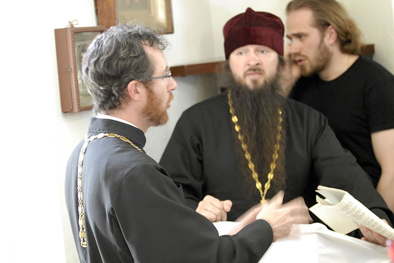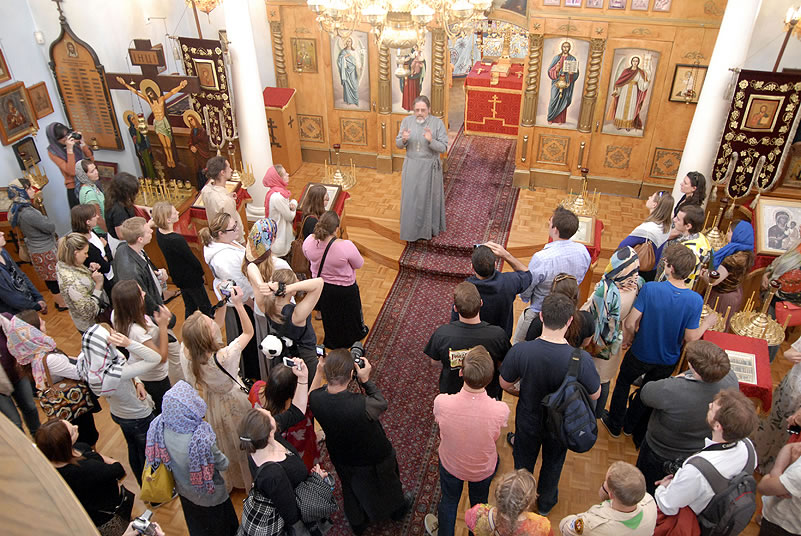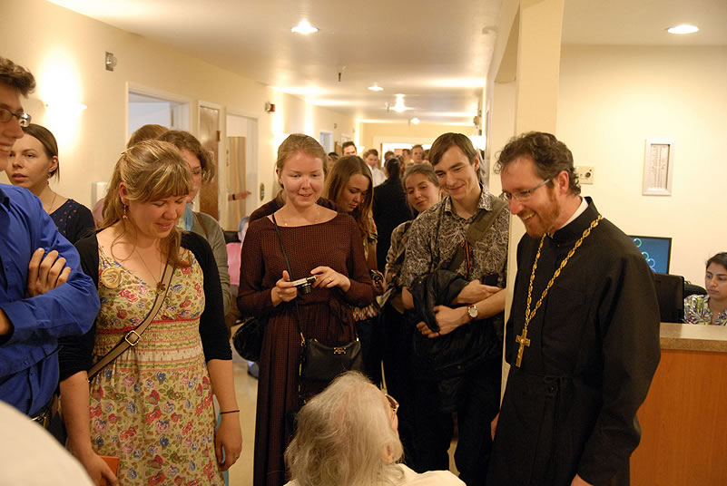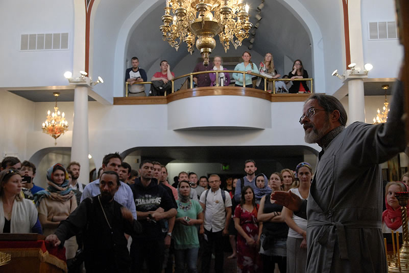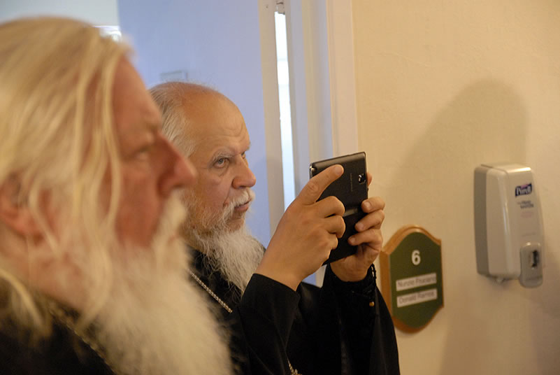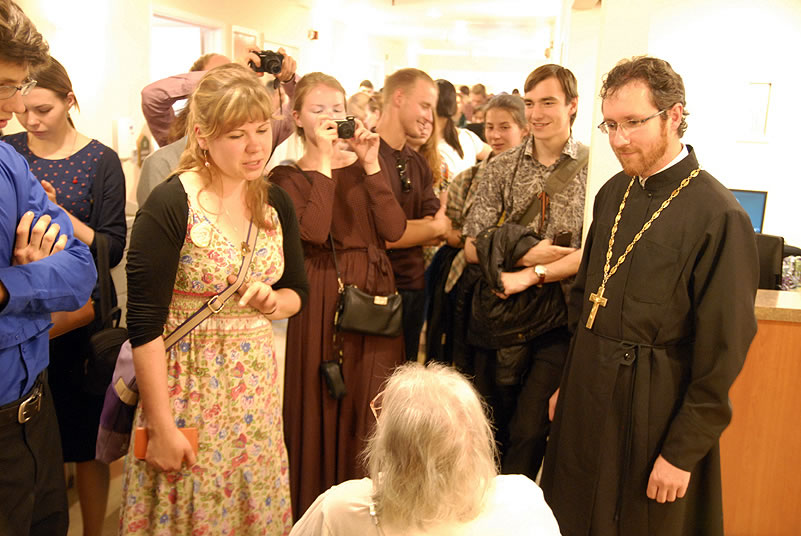 After Liturgy, the conferees heard a lecture by His Grace Bishop Panteleimon of Orekhovo-Zuevsk, President of the Synodal Department on Charity and Social Service of the Moscow Patriarchate, after which they broke up into groups and visited two charitable institutions to view their operations. The first was St Anthony’s Kitchen, where approximately 300 homeless people are fed daily. Then Protopriest Stefan Pavlenko gave the group (including Bishop Panteleimon) a tour of St John Kronstadt Care Center and its chapel. Vladyka Panteleimon and Fr Stefan performed a moleben service, after which the hierarch blessed the Orthodox Christian patients of the senior home. The staff took the group on a tour and answered questions, after which they offered a Russian-style lunch. That evening, the youth took a tour of the city and returned to the conference center to work in groups.