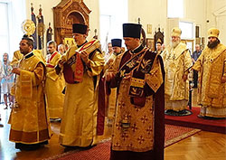 On Sunday, September 7, 2014, the 13 th Sunday of Pentecost, His Eminence Metropolitan Hilarion of Eastern America and New York, First Hierarch of the Russian Orthodox Church Outside of Russia, officiated at Divine Liturgy at the Synodal Cathedral of Our Lady �of the Sign,� together with His Grace Bishop Nicholas of Manhattan, Vice Secretary of the Synod of Bishops. The hierarchs were joined by Protopriest Andrei Sommer, Senior Priest of the cathedral, Hieromonk Evtikhy (Dovganiuk), Protodeacon Nicolas Mokhoff, Protodeacon Vadim Gan, Deacon Nathan Mousselli, Deacon Nazary Fataliev, Deacon Dionisy Lvov and Deacon Alexei Zhukov.