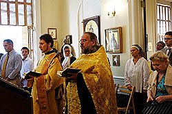 Later, Fr Andrei performed a moleben for the beginning of the school year in St Sergius Chapel on the first floor. Students, teachers and parents attended the service, performed before the Kursk-Root Icon of the Mother of God "of the Sign,� after which Fr Andrei sprinkled the worshipers with holy water. The cathedral�s sisterhood prepared a luncheon for the children.