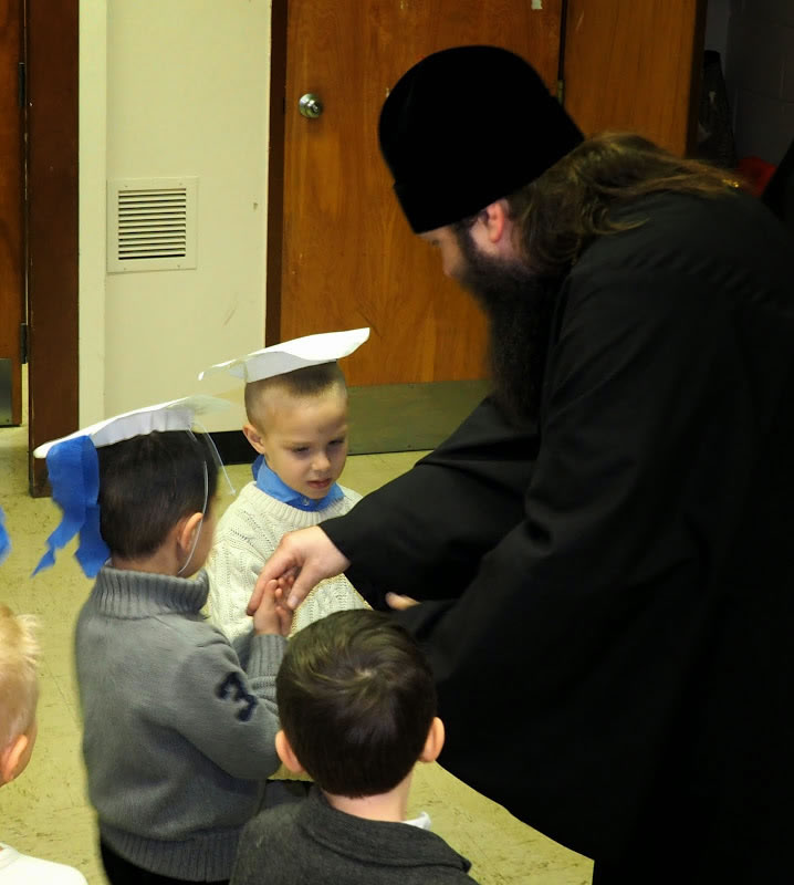 Protopriest Elias Gorsky, Deputy Principal of the Russian school and long-time teacher of the Old and New Testaments, greeted His Grace upon his arrival. Vladyka Nicholas was then welcomed by the singing of the youngest kindergarten and first-grade students of Nina Arlievsky and Alexandra Kulesha, and approached him for blessing. The preschool children in Larissa Belikov’s class recited poetry and gave him a jar of strawberry jam.