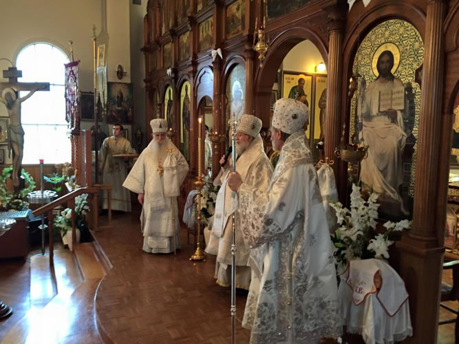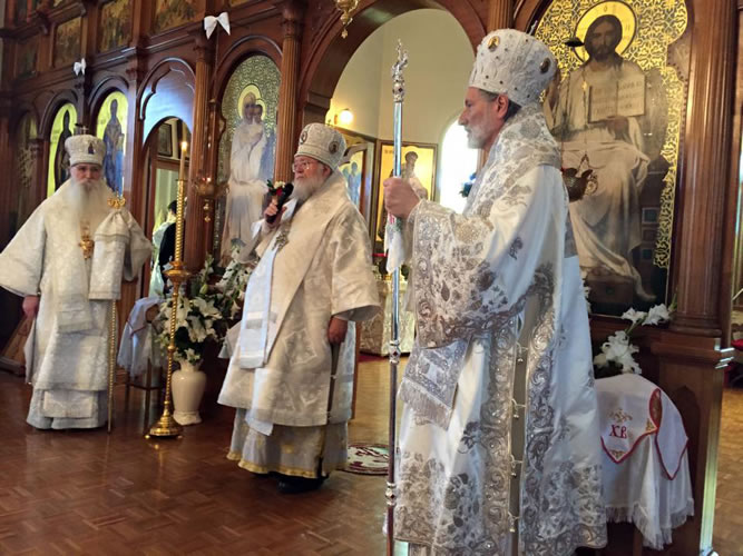 After a Paschal procession of the cross around the cathedral, Metropolitan Hilarion greeted Bishop George upon his arrival, wishing him blessed success and heavenly aid in serving at his new cathedra.