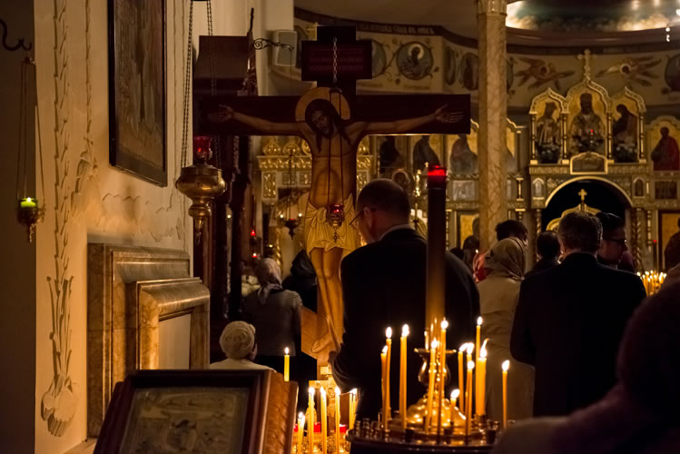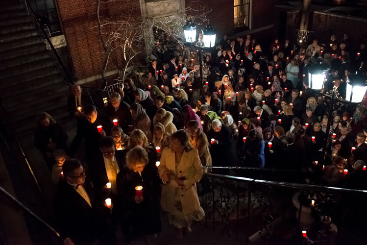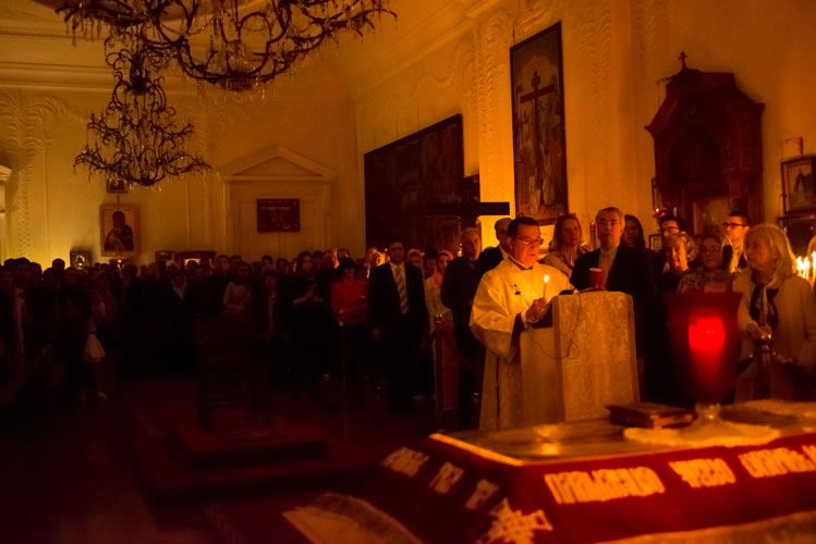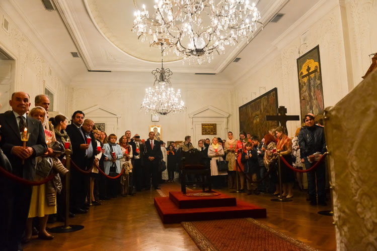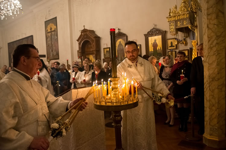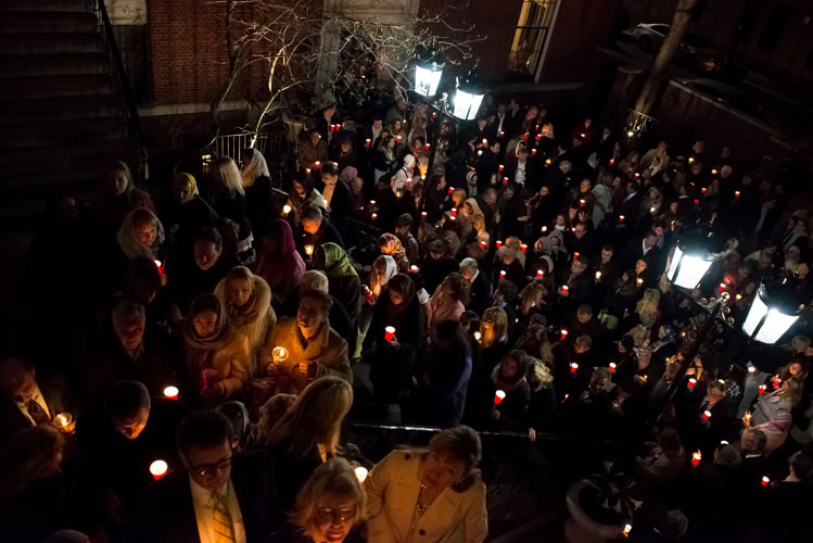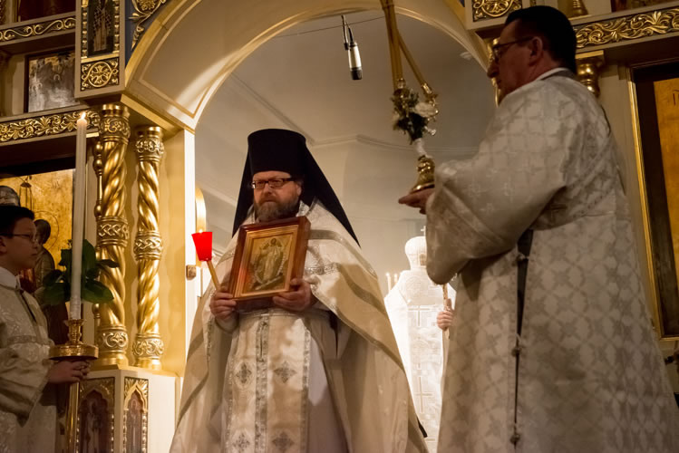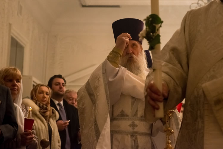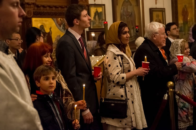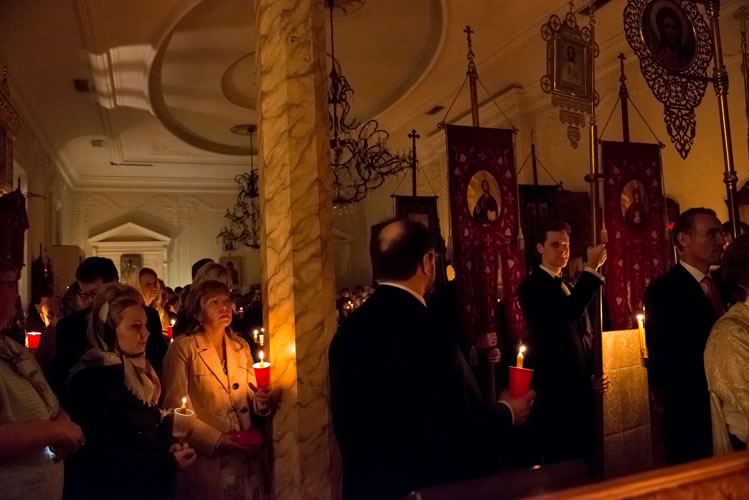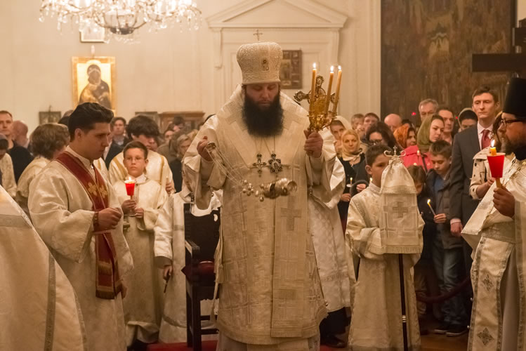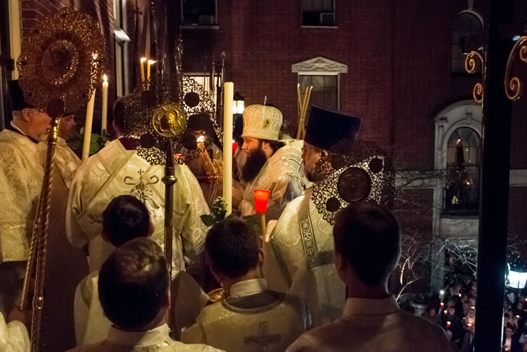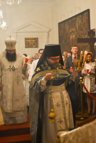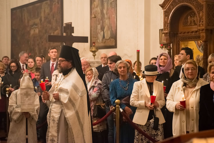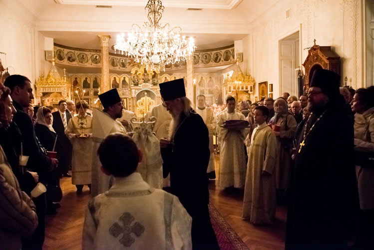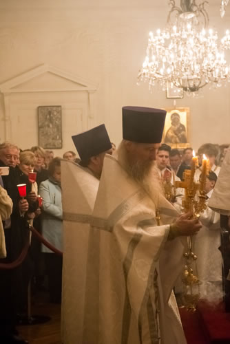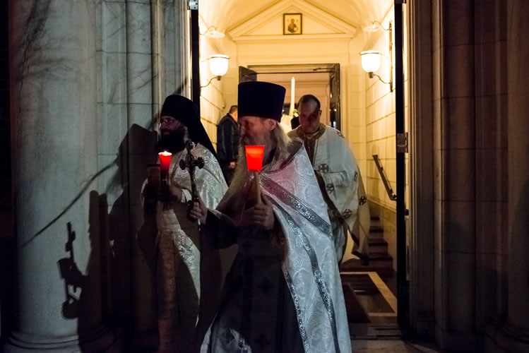 On the night of April 11-12, 2015, the "Feast Day of feast days," His Grace Bishop Nicholas of Manhattan, Deputy Secretary of the Synod of Bishops of the Russian Orthodox Church Outside of Russia, led divine services at the Synodal Cathedral of Our Lady "of the Sign" in New York. He was joined by the cathedral's clergymen, as the Cathedral Choir sang joyously under the direction of Peter Fekula to a large gathering of worshipers.