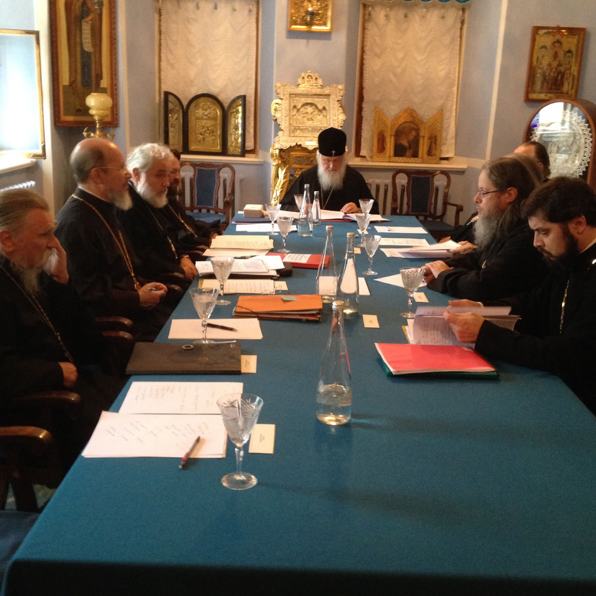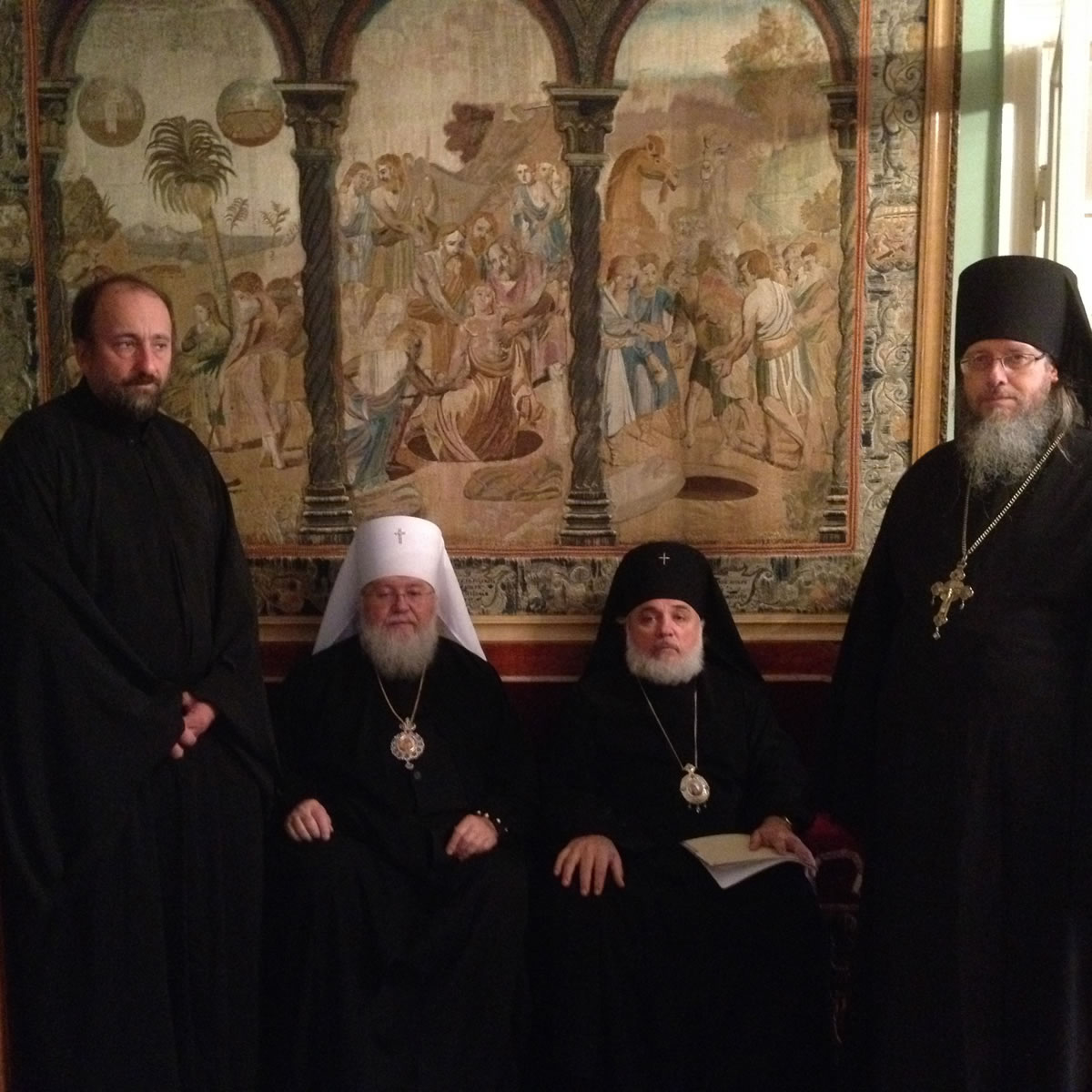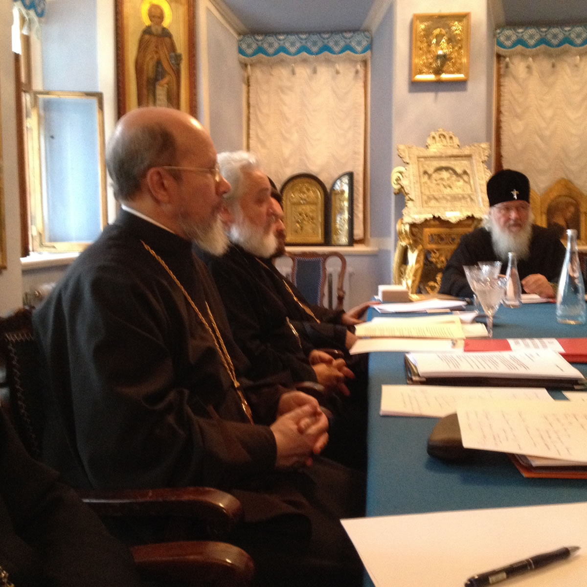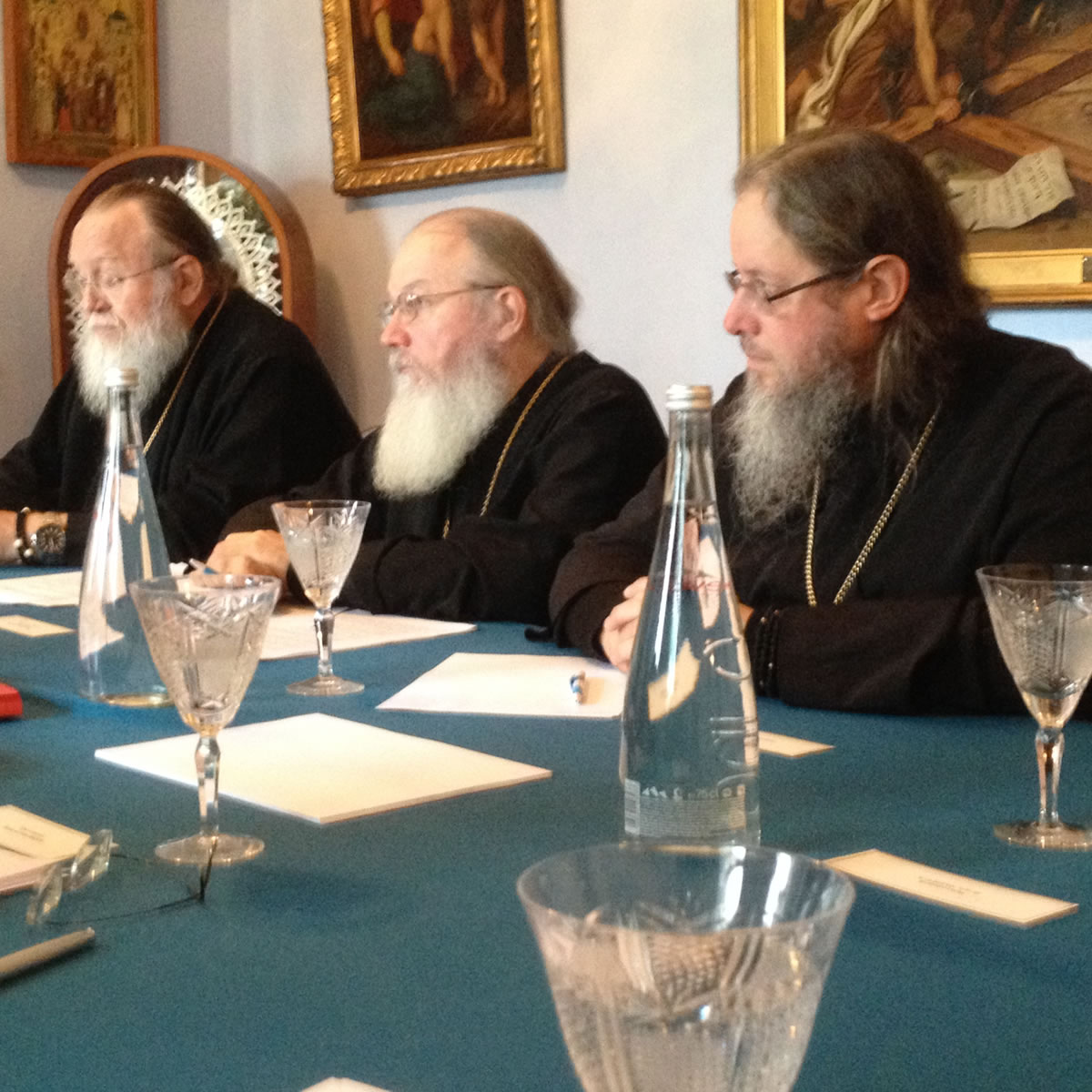 His Holiness chaired the meeting. Also participating were His Eminence Metropolitan Ilarion of Volokolamsk, President of the Department of External Church Relations of the Moscow Patriarchate; His Eminence Metropolitan Hilarion of Eastern America and New York, First Hierarch of the Russian Orthodox Church Outside of Russia; His Eminence Archbishop Gabriel of Montreal and Canada (ROCOR); His Grace Bishop Pankraty of Troitsa, Chairman of the Synodal Commission on the Glorification of Saints (MP); Protopriest Nikolai Balashov, Vice President of DECR; Archimandrite Roman (Krassovsky), Chief of the Russian Ecclesiastical Mission in Jerusalem (ROCOR); Hegumen Damaskin (Orlovsky) of the Synodal Commission on the Glorification of Saints; Protopriest Igor Yakimchuk (Secretary of Inter-Orthodox Relations of the DECR); Deacon Andrei Psarev, Instructor at Holy Trinity Seminary in Jordanville, NY (ROCOR).