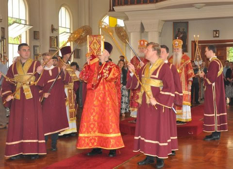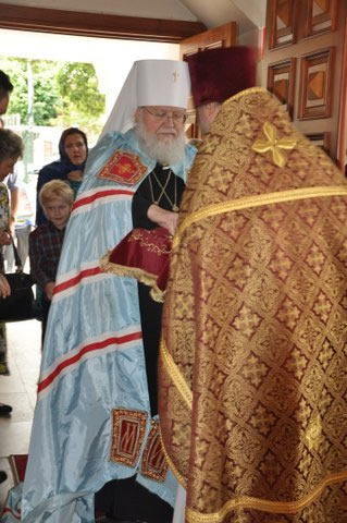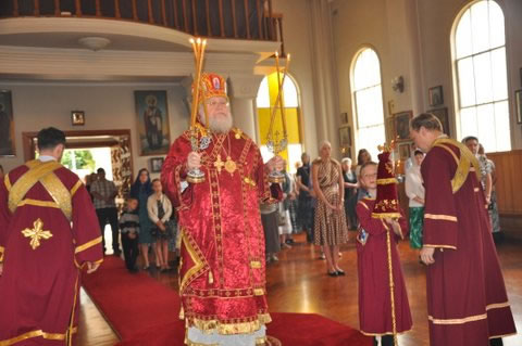 On January 2-3, 2015, His Eminence Metropolitan Hilarion of Eastern America and New York, First Hierarch of the Russian Orthodox Church Outside of Russia, headed divine services on the Sunday before the feast of the Nativity of Christ at SS Peter and Paul Cathedral in Strathfield, near Sydney, Australia. His Eminence was joined by His Grace Bishop George of Canberra, Vicar of the Diocese of Australia and New Zealand; Protopriest George Lapardin, head of the diocesan youth department and Senior Priest of the cathedral; Protodeacon Alexander Kotliaroff and Protodeacon Constantine Moshegov. After Divine Liturgy, Vladyka George welcomed the Primate of the Russian Church Abroad and expressed his joy at their joint service.