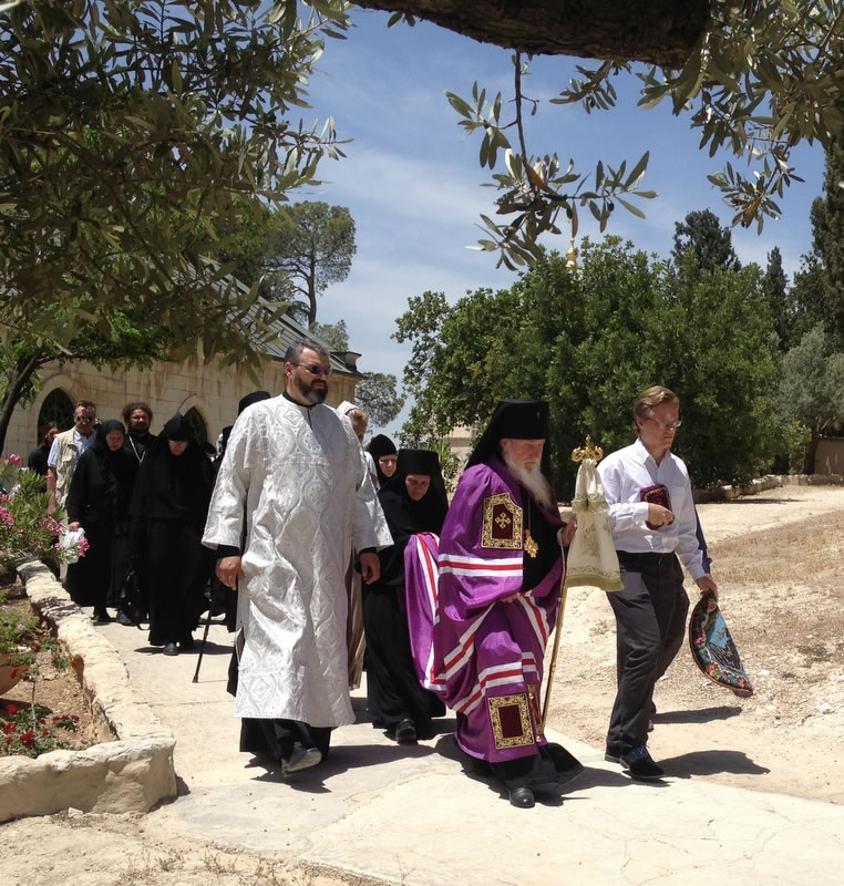 On Thursday, May 17, 2018, the great feast day of the Ascension of the Lord, festive services were held at Ascension Convent on the Mt of Olives, Jerusalem. His Eminence Archbishop Mark of Berlin and Germany led the services, accompanied by Archimandrite Roman (Krassovsky), Chief of the Russian Ecclesiastical Mission in Jerusalem, the Mission clergymen and visiting clerics.