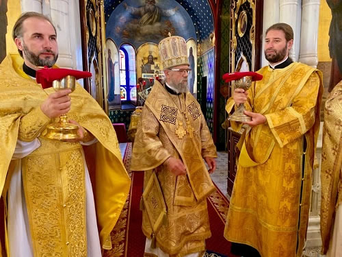 A bishop of the Ukrainian Orthodox Church officiates at Liturgy at Elevation of the Cross Cathedral