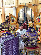 On Sunday morning, the Bishop was greeted at the door of the temple by parish representatives with the traditional greetings of bread, salt and flowers, after which the clergy greeted His Grace. The Cross was presented by the Rector, Fr Andrew, who was joined by Priest Ioan, Priest Georgy Petrovsky, and Deacon Timothy, all clerics of the Parish, together with invited guest Archpriest Leonid from the Church of Moldova, and Reader George Sultan who had accompanied His Grace from London.