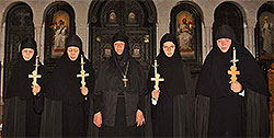 Upon assuming the holy vows, the sisters were tonsured to monasticism. They were given new names and donned monastic habits. Nun Alexandra (Pergamentseva) was given the name Andrea in honor of St Andrew of Crete, author of the Penitential Canon; Sister Justina (Kepke) was name Macaria in honor of St Macarius of Glinsk; the main singer Nun Joanna (Spirina) was named Theofania in honor of St Theophan the Chronicler and Confessor; and Sister Glafira (Obraztsova) was name in honor of St Philaret of Glinsk.