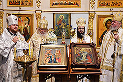 In his address, Bp Leonid noted his joy that the hierarchs were finally able to get together after many delays last year, and he presented each bishop with an icon of St Alexander Nevsky, whose 800th anniversary was celebrated by the Russian Church last year.