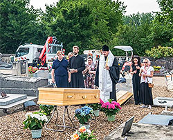 The coffin was then taken to St Alexander Nevsky Lavra, where Archbishop Feofan was met by Orthodox faithful, many of whom venerated it. It was then interred in a crypt at Holy Trinity Cathedral, where Metropolitan Antony (Melnikov) and Metropolitan (Vorontsov) are also laid to rest. A funerary litiya was performed for the hierarch from abroad by Hieromonk Alexy (Stepanov).