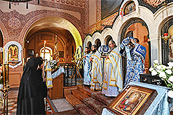 At the end of the Liturgy, the “Rite of the Panagia” was held at the trapeza, afterwards Abbess Elisabeth and her sisters went in procession to the stone where the apostles met the Mother of God and she announced to them that she was their intercessor before her Divine Son. After venerating the holy image of the Dormition the sisters and faithful departed with spiritual joy.