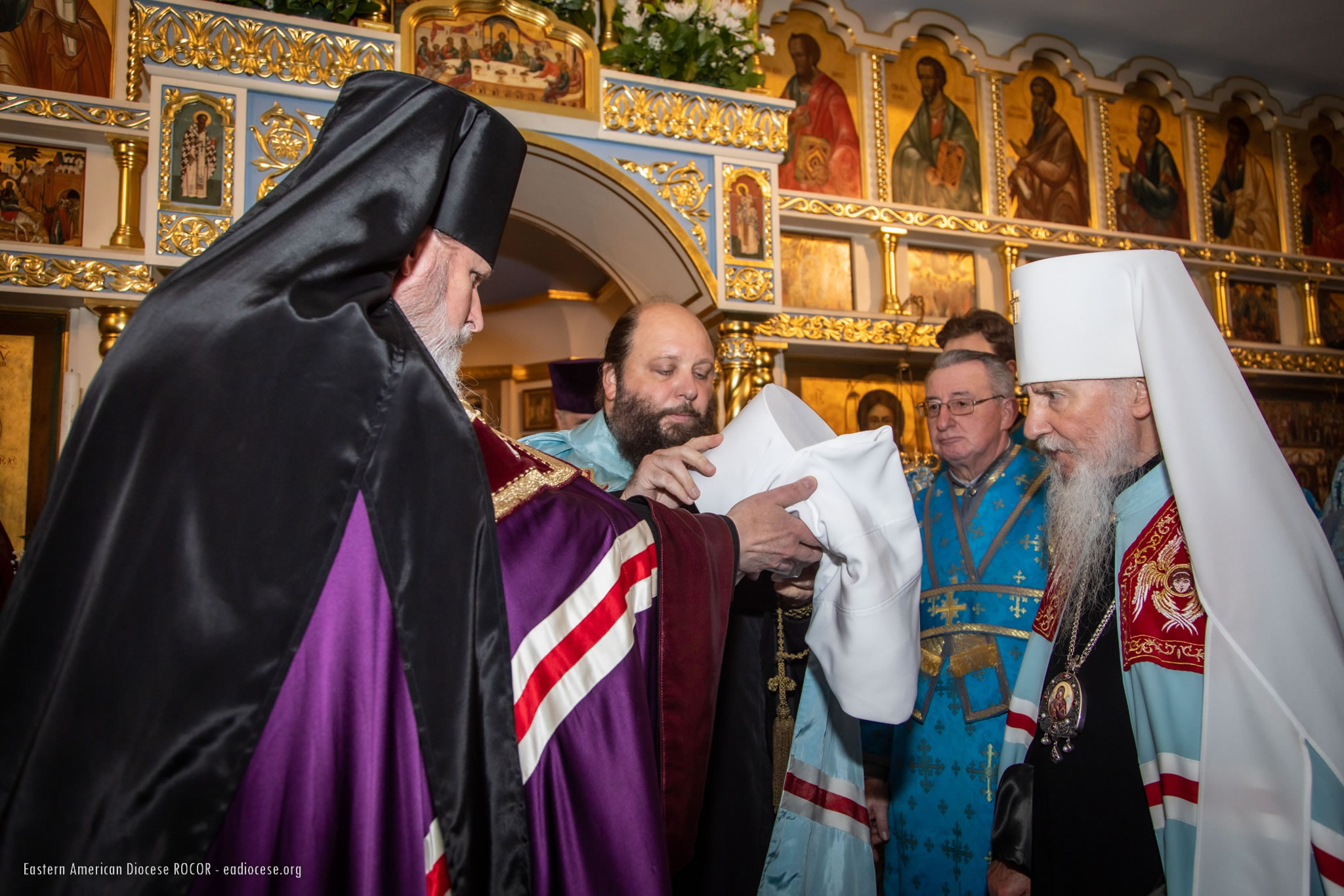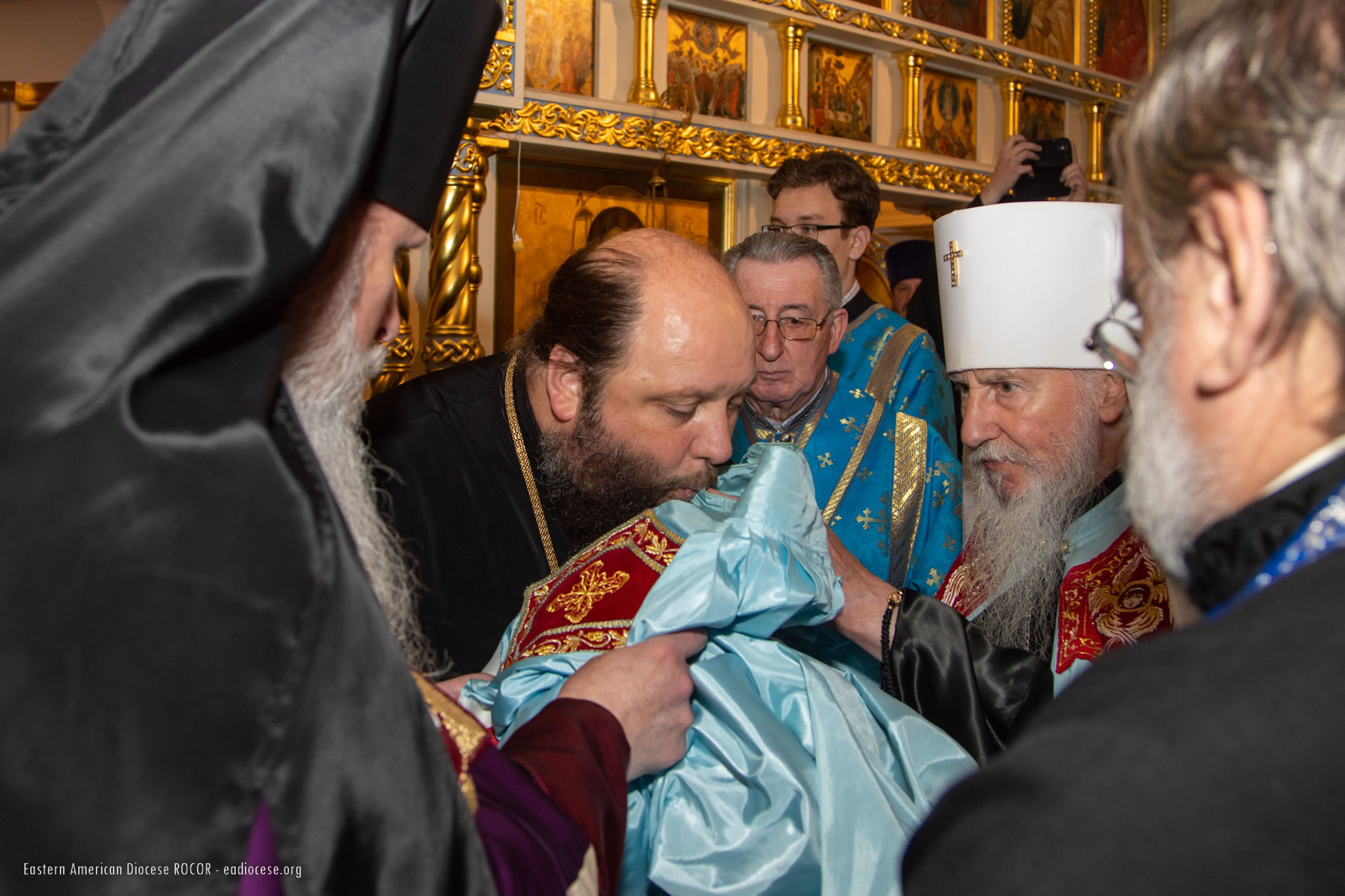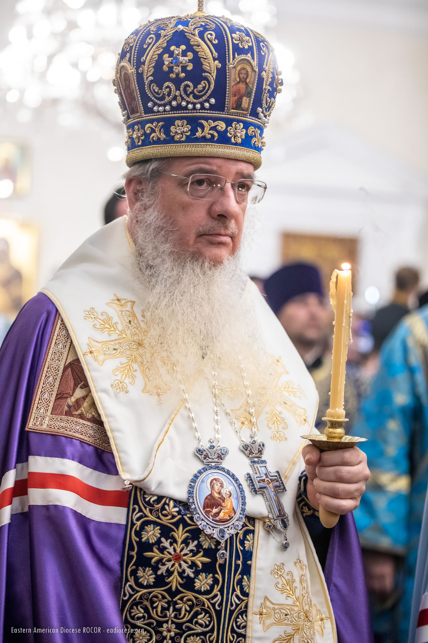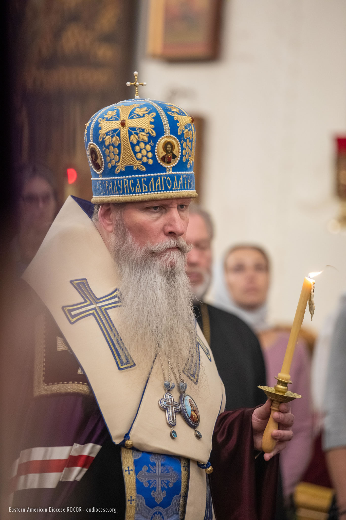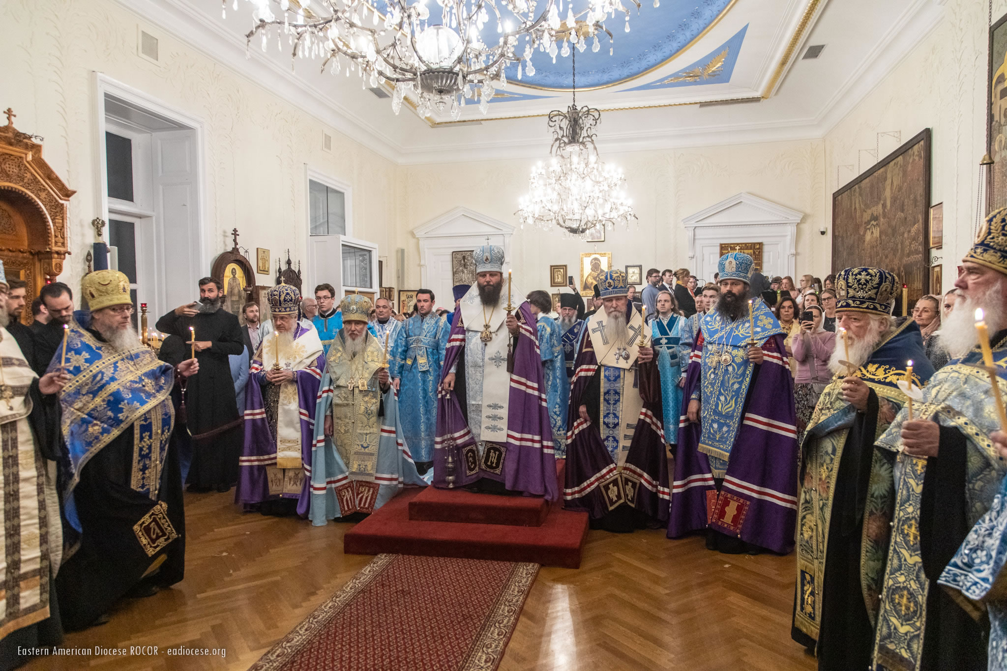 On Saturday, 17 September, 2022, at the end of all-night vigil at the Synodal Cathedral of Our Lady “of the Sign” in New York, His Grace Bishop Nicholas of Manhattan, newly-elected First Hierarch of the Russian Orthodox Church Outside of Russia, emerged through the Royal Doors to the ambo in his black klobuk and common episcopal mantle. His Eminence Metropolitan Mark of Berlin and German and His Eminence Archbishop Kyrill of San Francisco and Western America then endowed the blue mantle and white klobuk to him, which he donned with the aid of attending subdeacons.