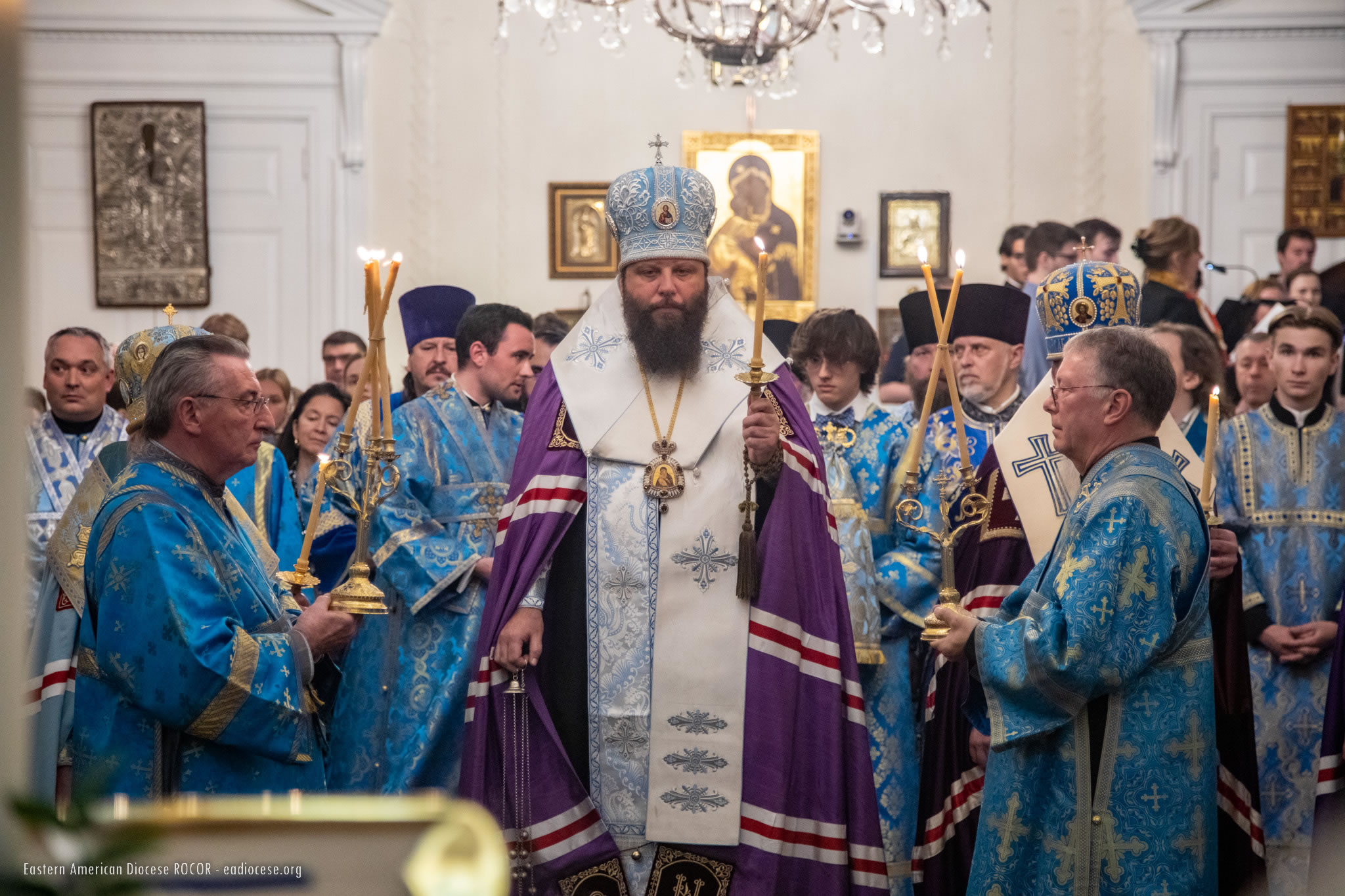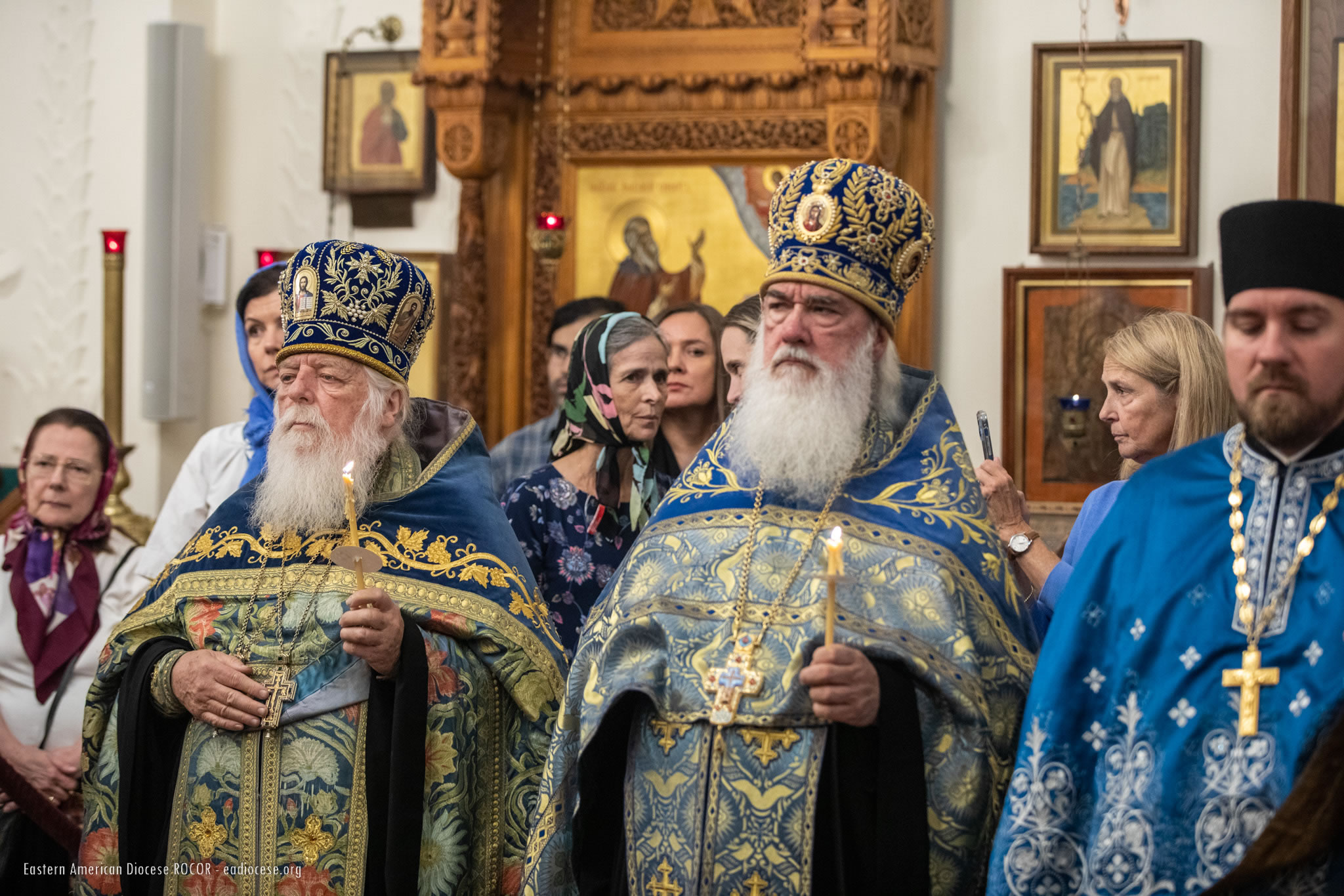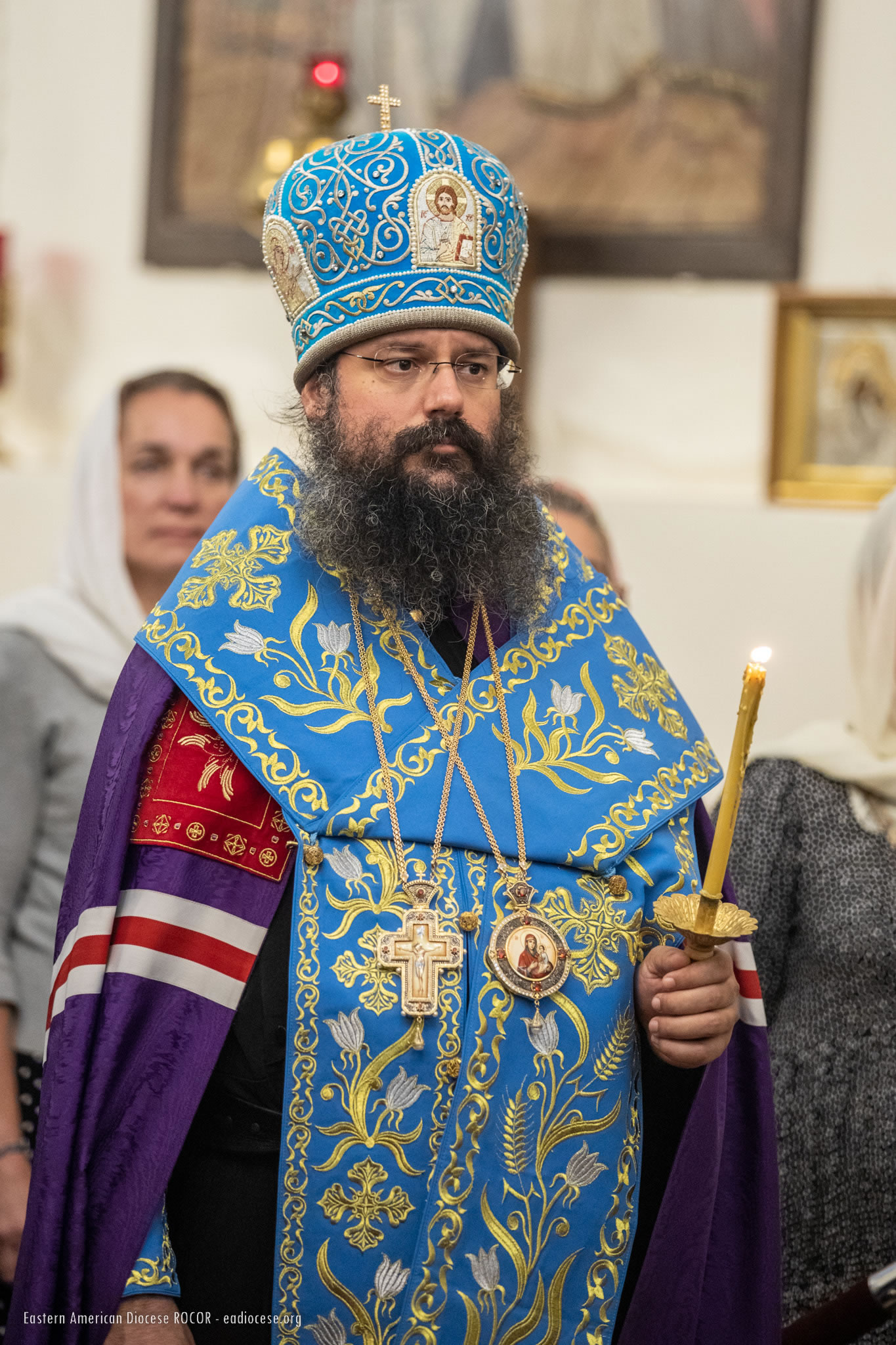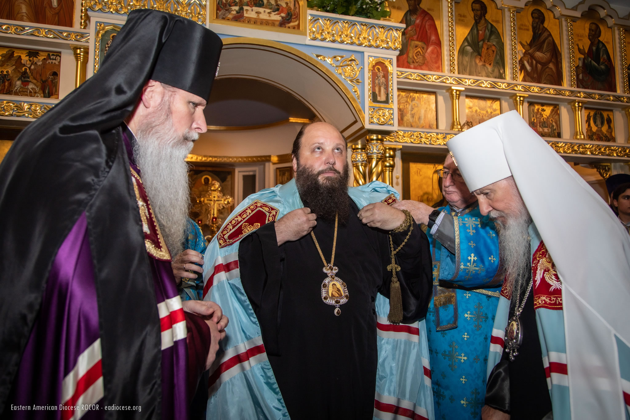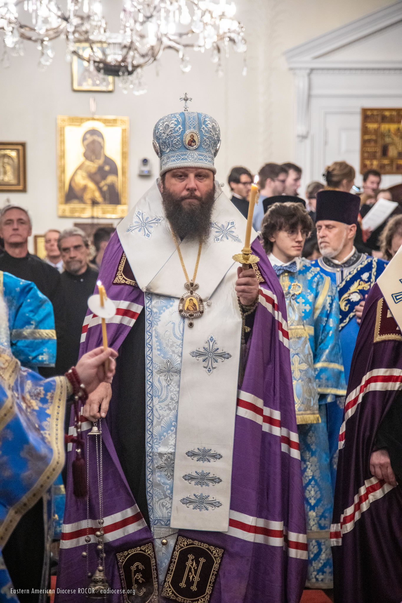 On Saturday, 17 September, 2022, at the end of all-night vigil at the Synodal Cathedral of Our Lady “of the Sign” in New York, His Grace Bishop Nicholas of Manhattan, newly-elected First Hierarch of the Russian Orthodox Church Outside of Russia, emerged through the Royal Doors to the ambo in his black klobuk and common episcopal mantle. His Eminence Metropolitan Mark of Berlin and German and His Eminence Archbishop Kyrill of San Francisco and Western America then endowed the blue mantle and white klobuk to him, which he donned with the aid of attending subdeacons.