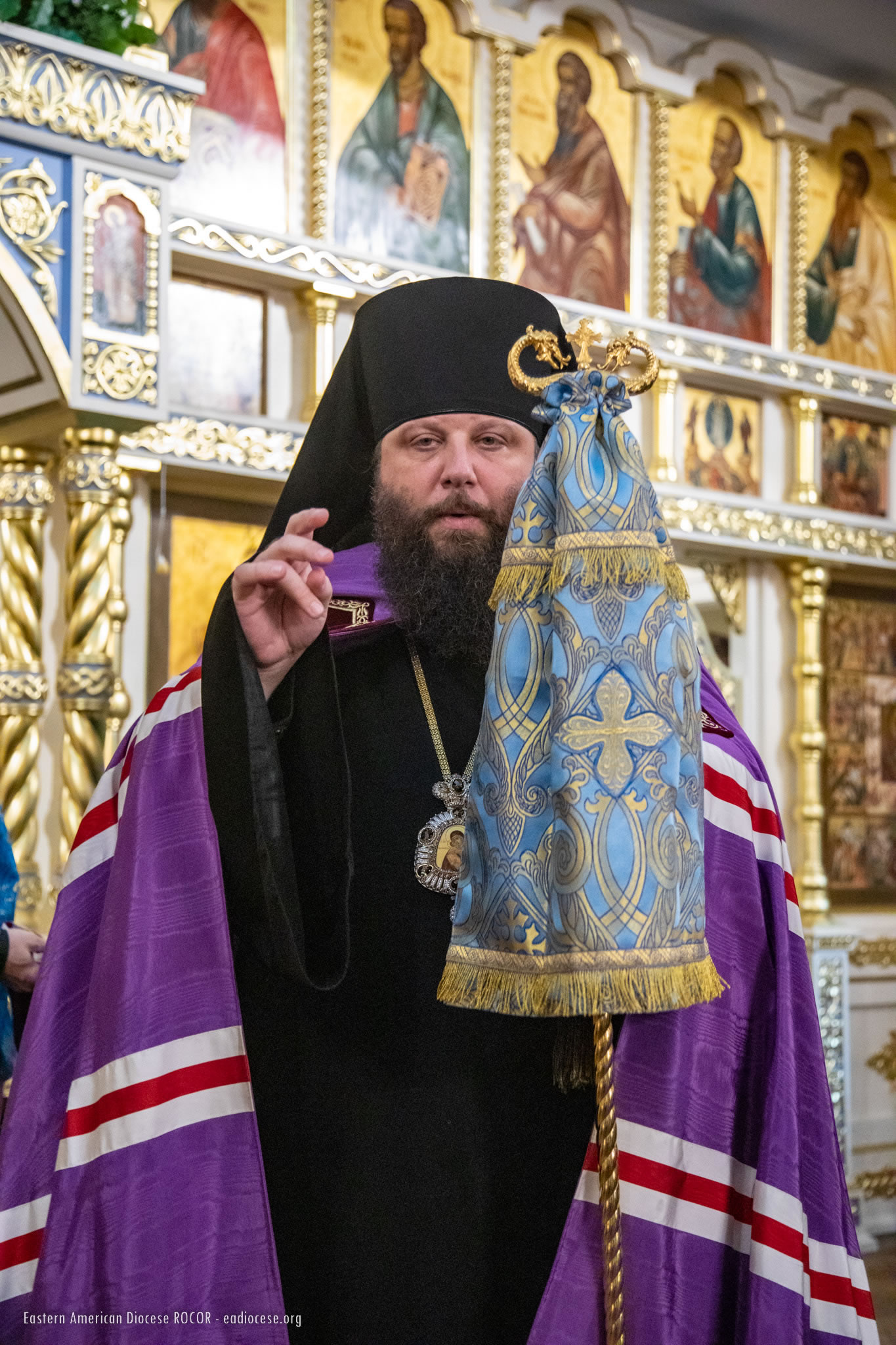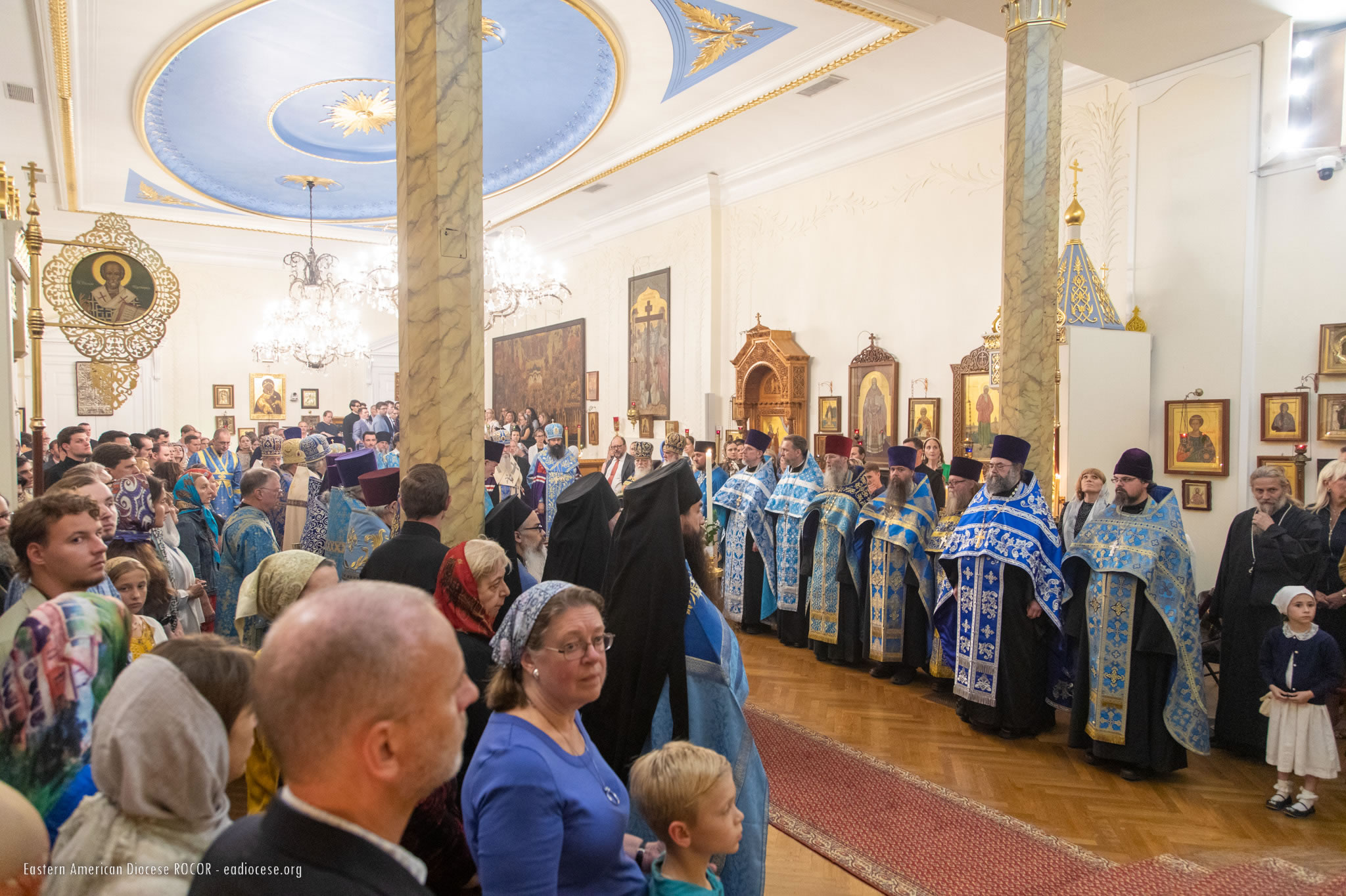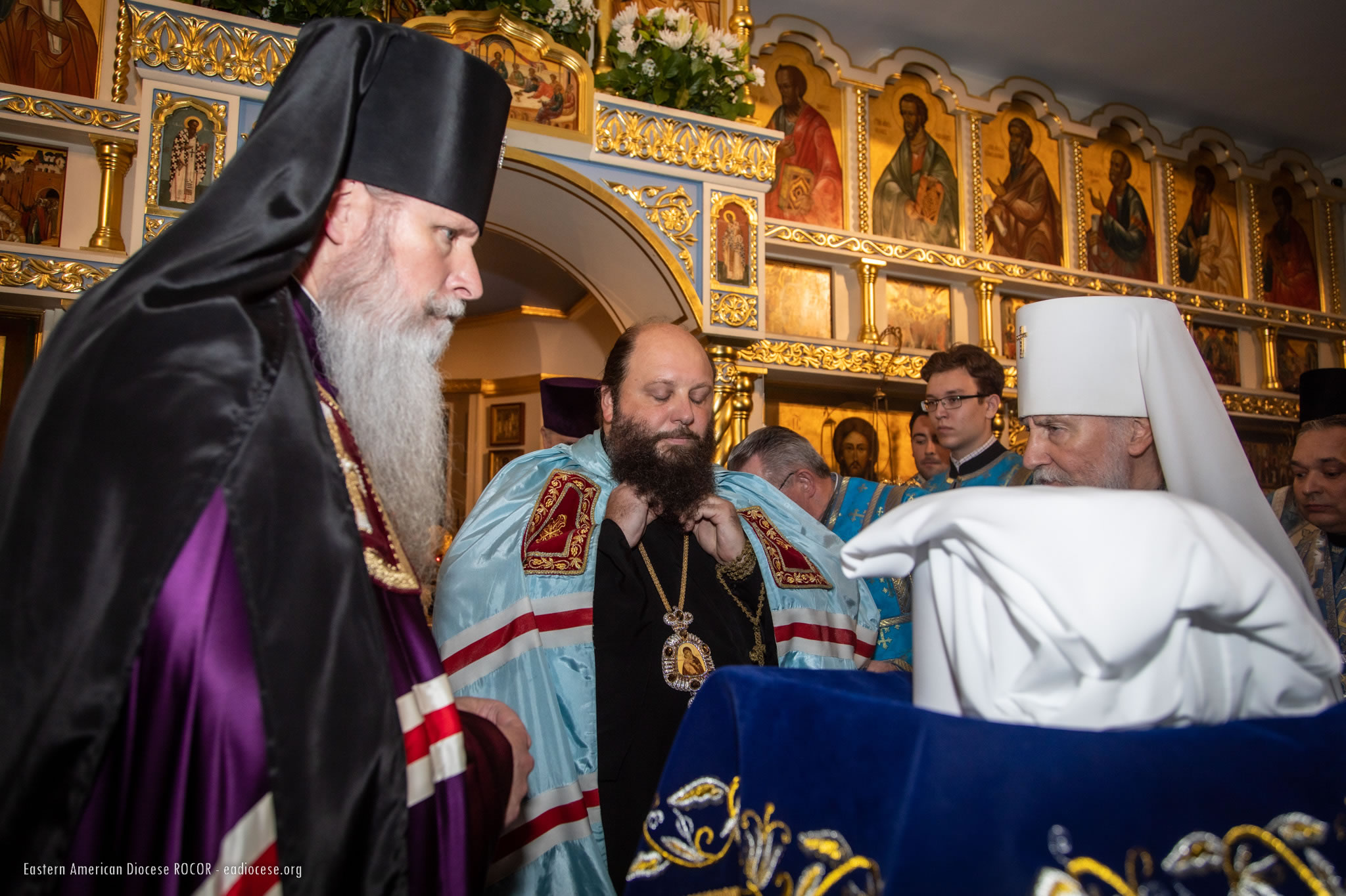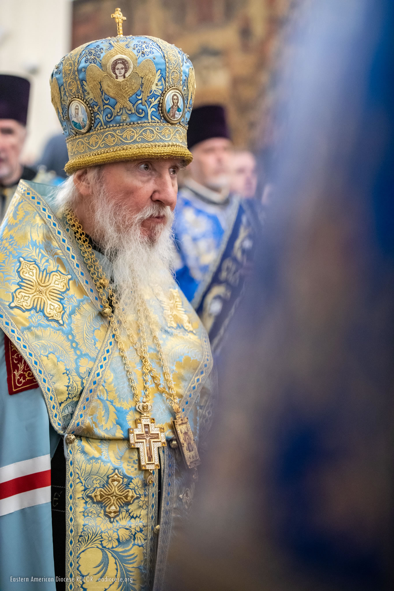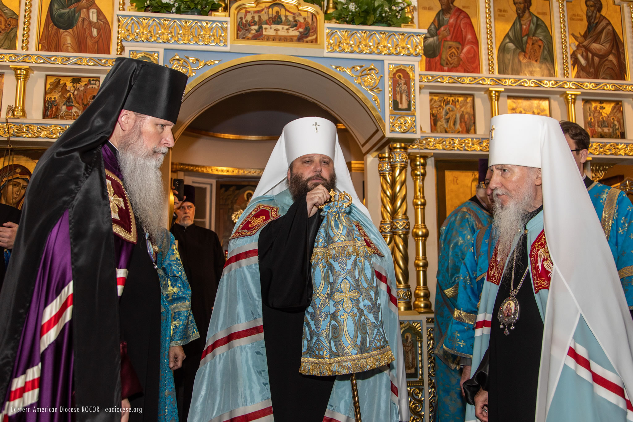 On Saturday, 17 September, 2022, at the end of all-night vigil at the Synodal Cathedral of Our Lady “of the Sign” in New York, His Grace Bishop Nicholas of Manhattan, newly-elected First Hierarch of the Russian Orthodox Church Outside of Russia, emerged through the Royal Doors to the ambo in his black klobuk and common episcopal mantle. His Eminence Metropolitan Mark of Berlin and German and His Eminence Archbishop Kyrill of San Francisco and Western America then endowed the blue mantle and white klobuk to him, which he donned with the aid of attending subdeacons.