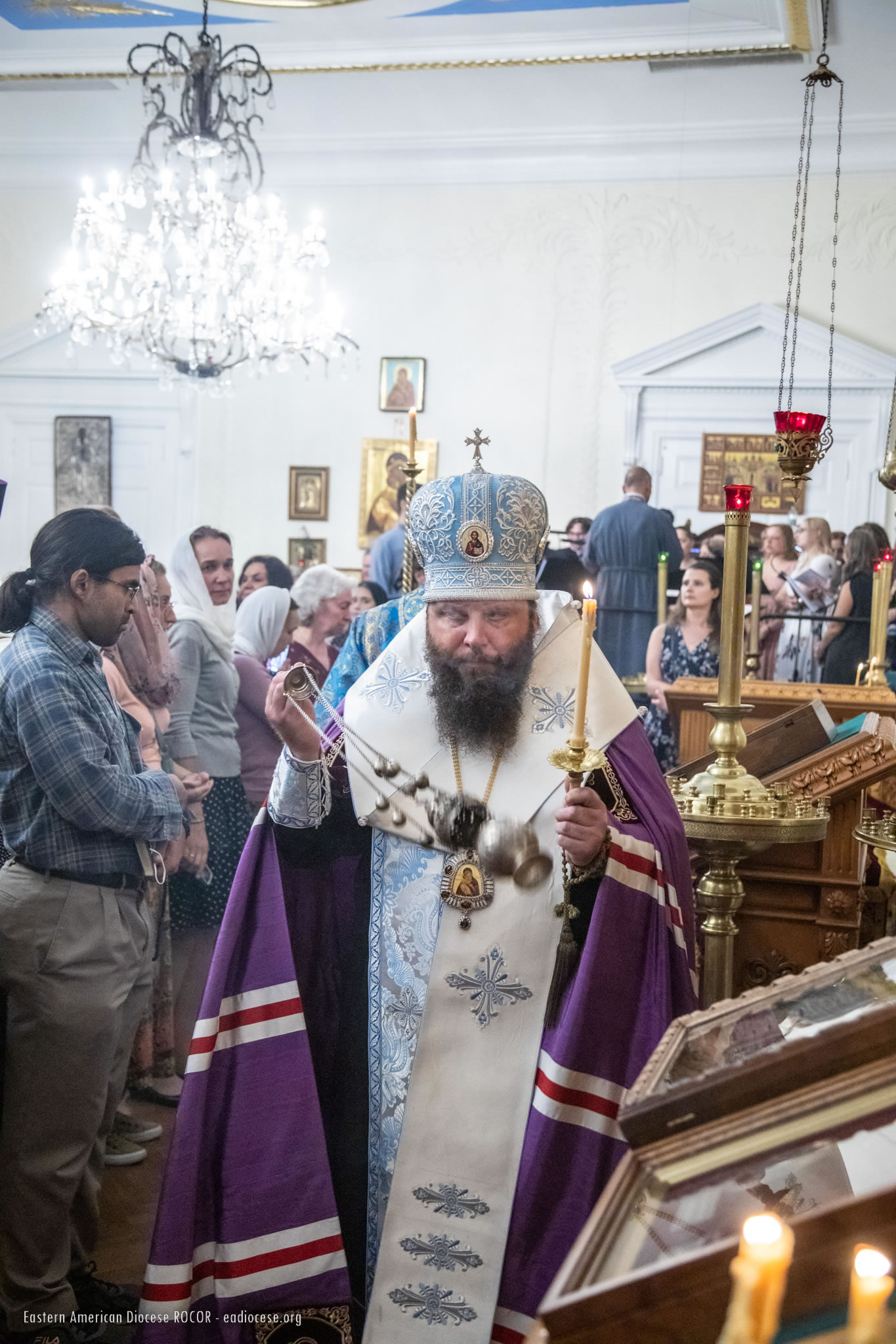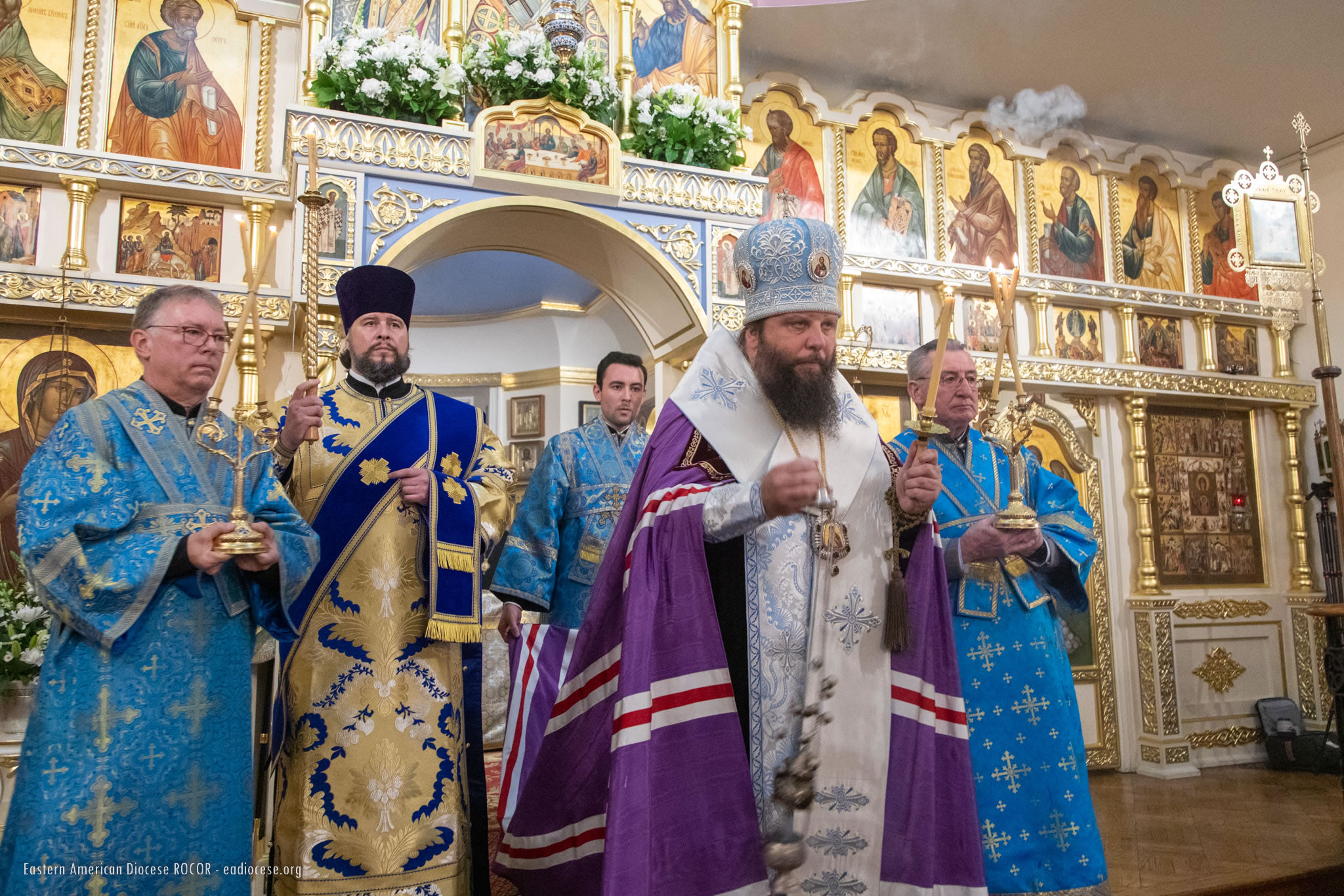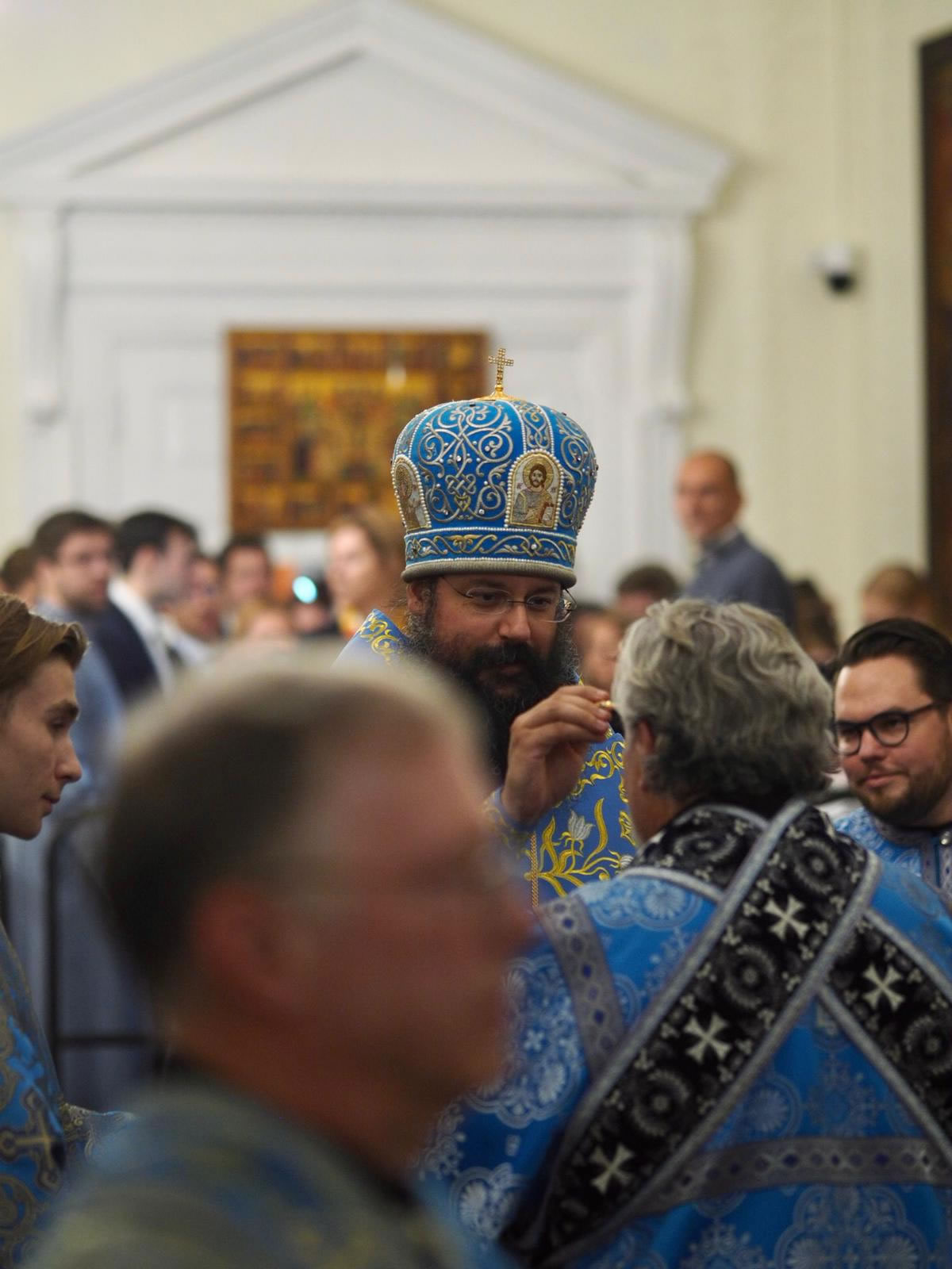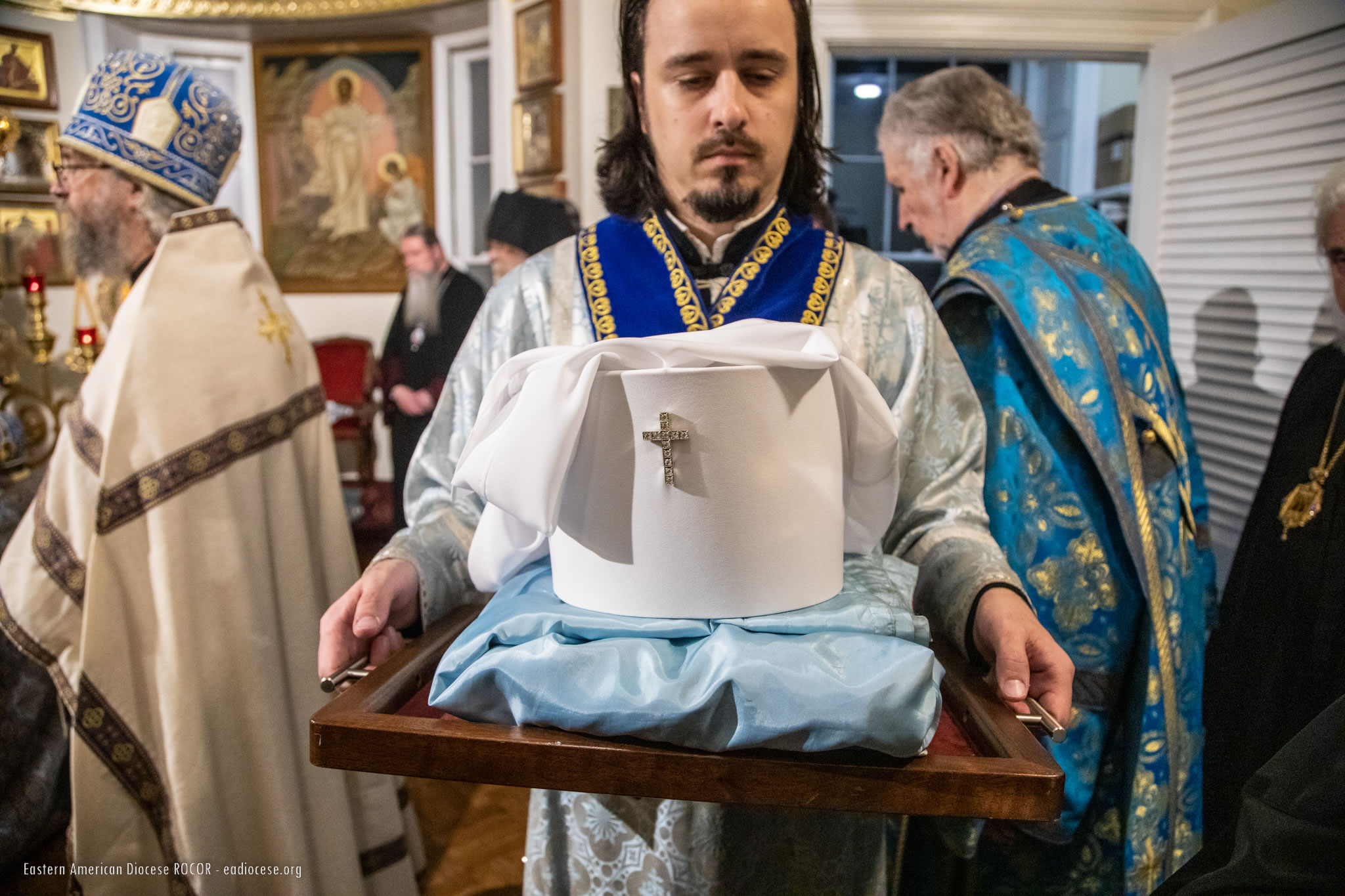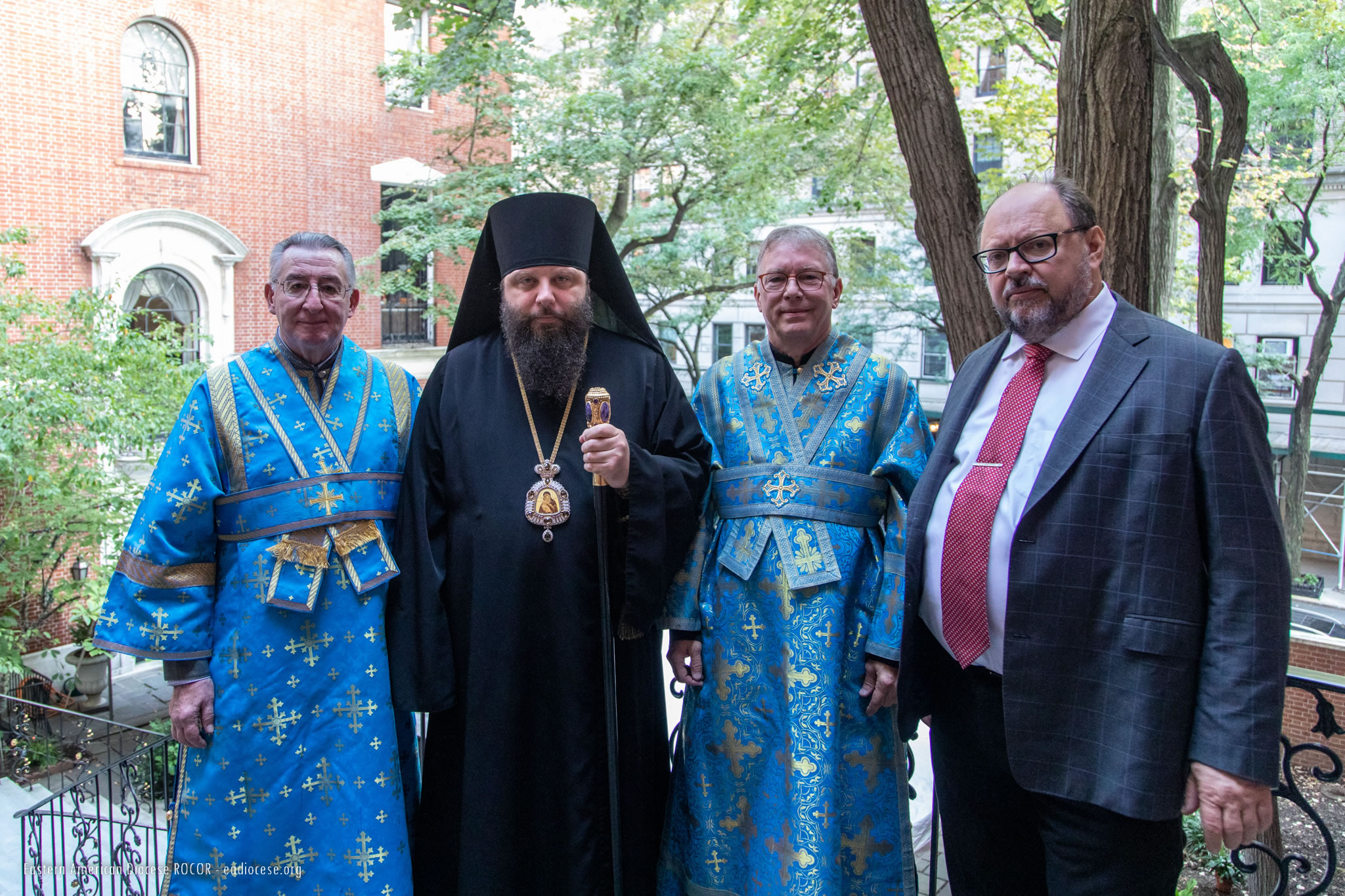 On Saturday, 17 September, 2022, at the end of all-night vigil at the Synodal Cathedral of Our Lady “of the Sign” in New York, His Grace Bishop Nicholas of Manhattan, newly-elected First Hierarch of the Russian Orthodox Church Outside of Russia, emerged through the Royal Doors to the ambo in his black klobuk and common episcopal mantle. His Eminence Metropolitan Mark of Berlin and German and His Eminence Archbishop Kyrill of San Francisco and Western America then endowed the blue mantle and white klobuk to him, which he donned with the aid of attending subdeacons.