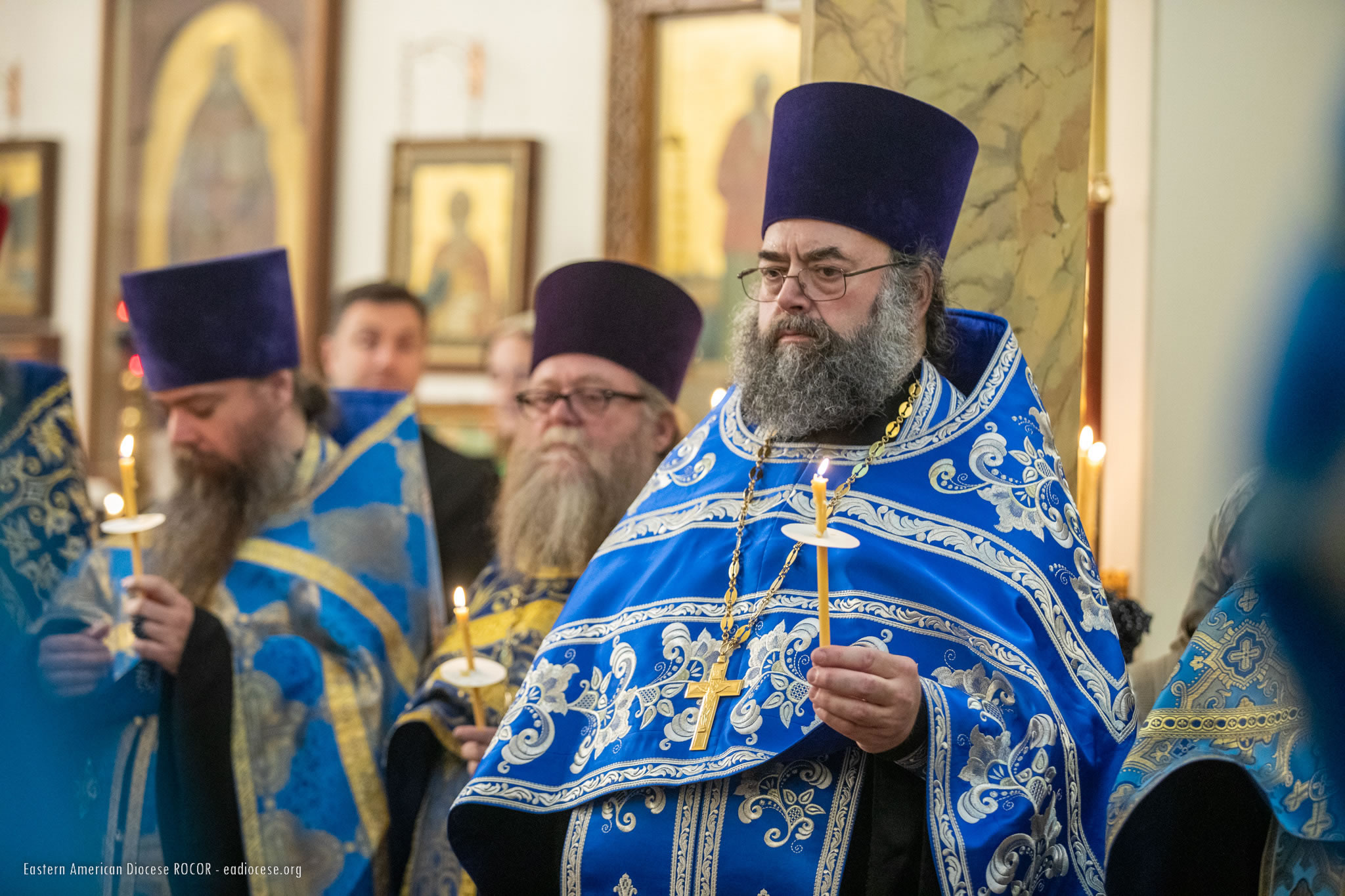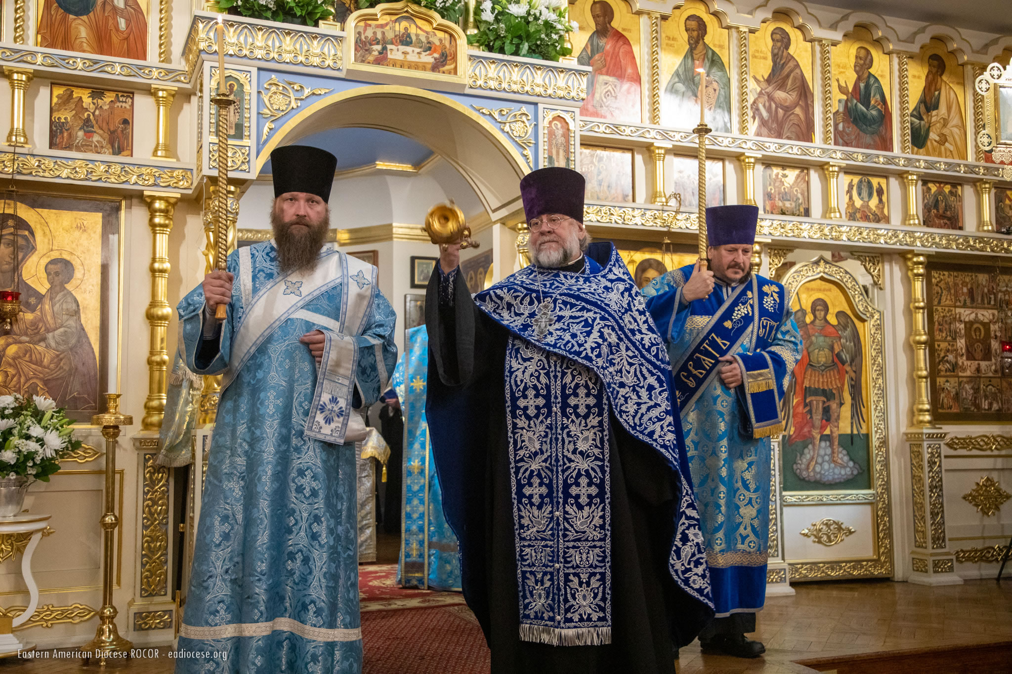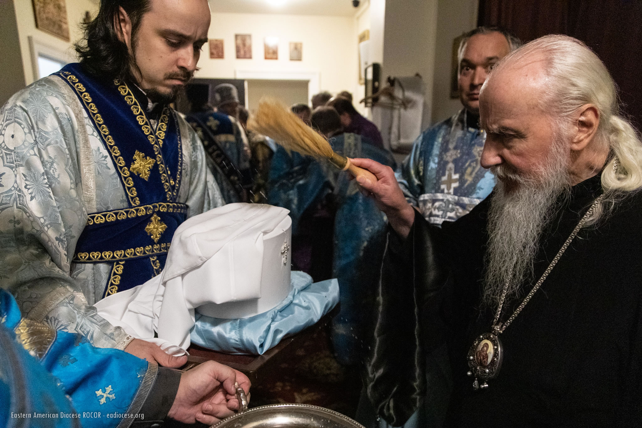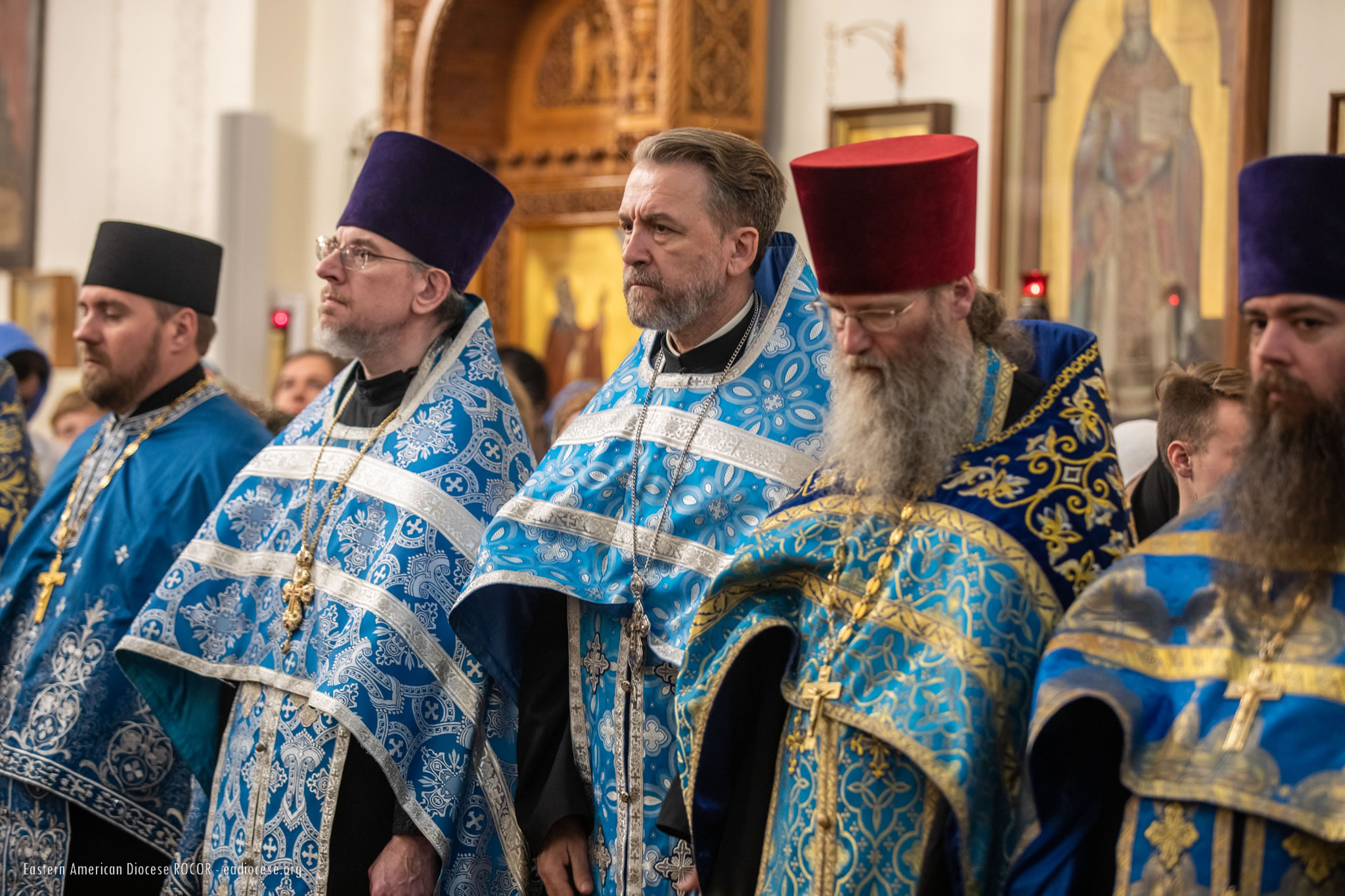 On Saturday, 17 September, 2022, at the end of all-night vigil at the Synodal Cathedral of Our Lady “of the Sign” in New York, His Grace Bishop Nicholas of Manhattan, newly-elected First Hierarch of the Russian Orthodox Church Outside of Russia, emerged through the Royal Doors to the ambo in his black klobuk and common episcopal mantle. His Eminence Metropolitan Mark of Berlin and German and His Eminence Archbishop Kyrill of San Francisco and Western America then endowed the blue mantle and white klobuk to him, which he donned with the aid of attending subdeacons.