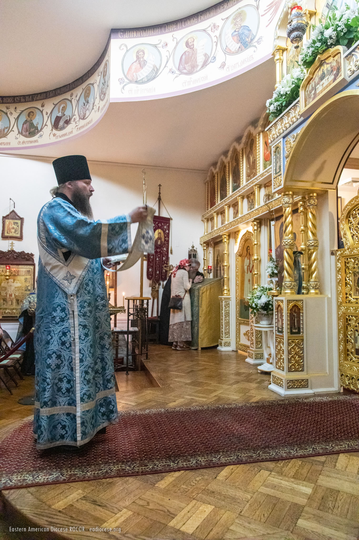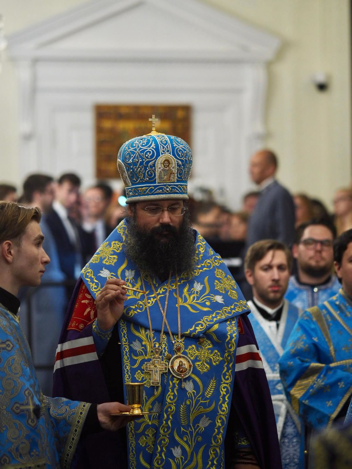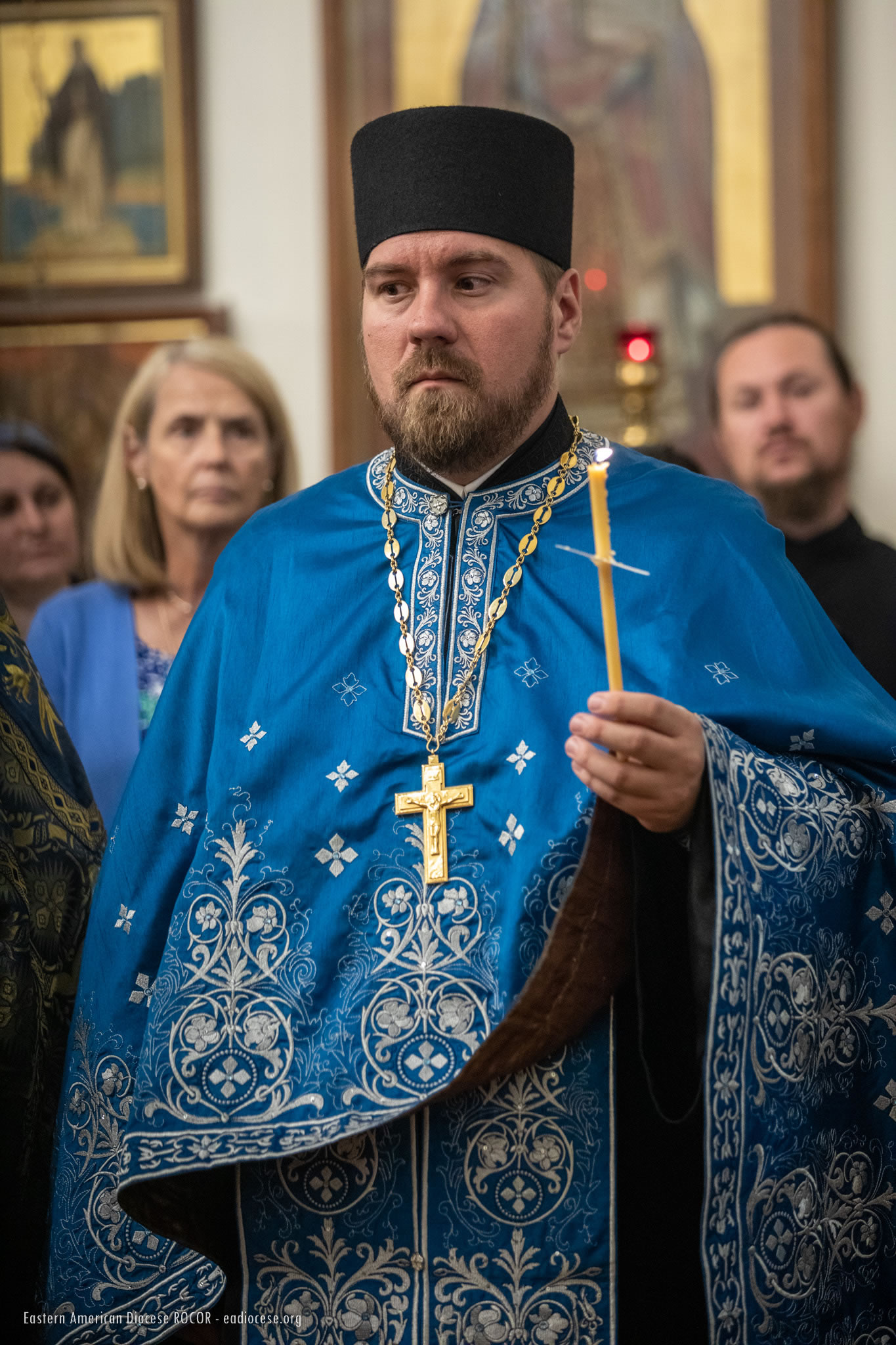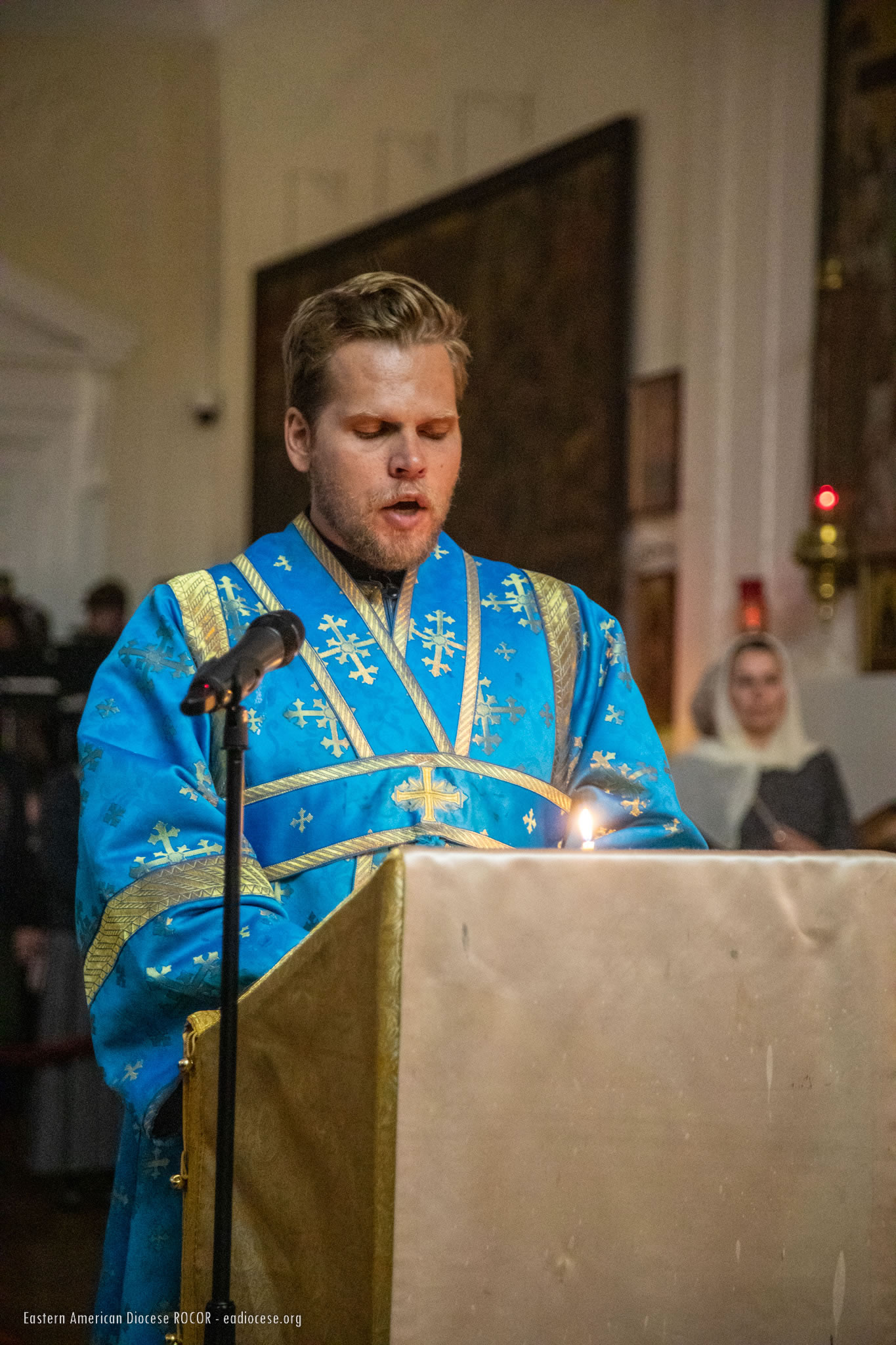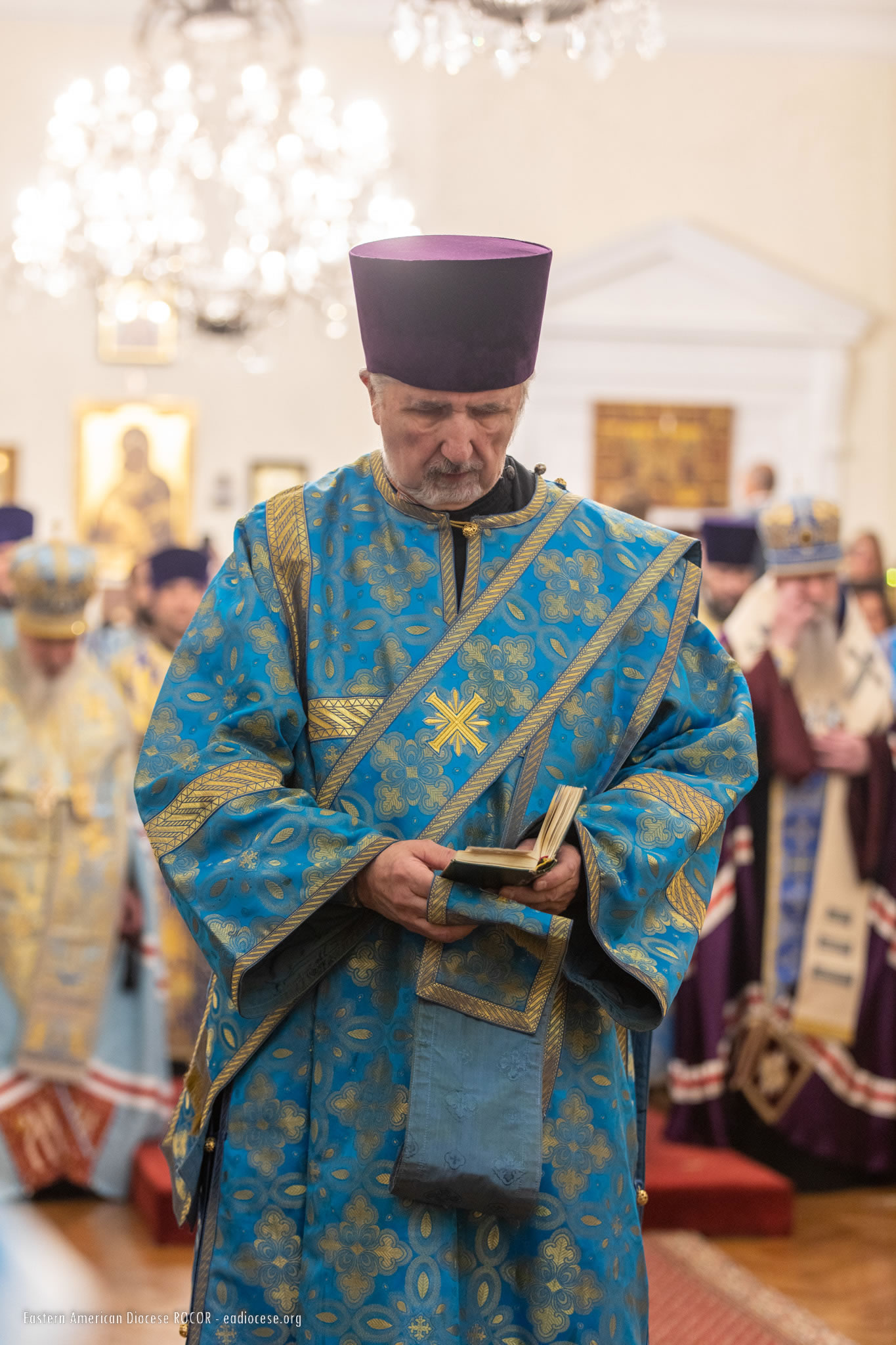 On Saturday, 17 September, 2022, at the end of all-night vigil at the Synodal Cathedral of Our Lady “of the Sign” in New York, His Grace Bishop Nicholas of Manhattan, newly-elected First Hierarch of the Russian Orthodox Church Outside of Russia, emerged through the Royal Doors to the ambo in his black klobuk and common episcopal mantle. His Eminence Metropolitan Mark of Berlin and German and His Eminence Archbishop Kyrill of San Francisco and Western America then endowed the blue mantle and white klobuk to him, which he donned with the aid of attending subdeacons.