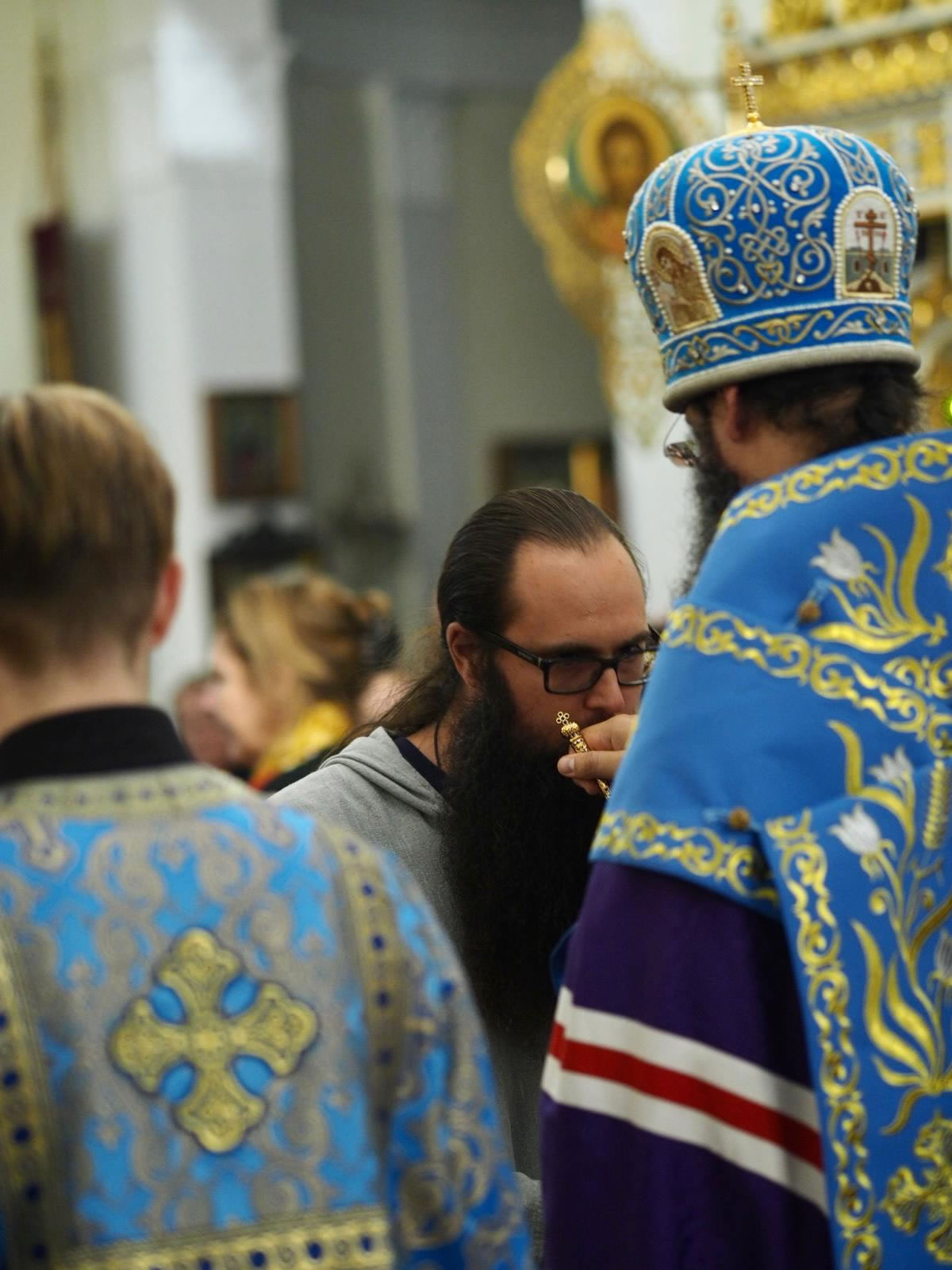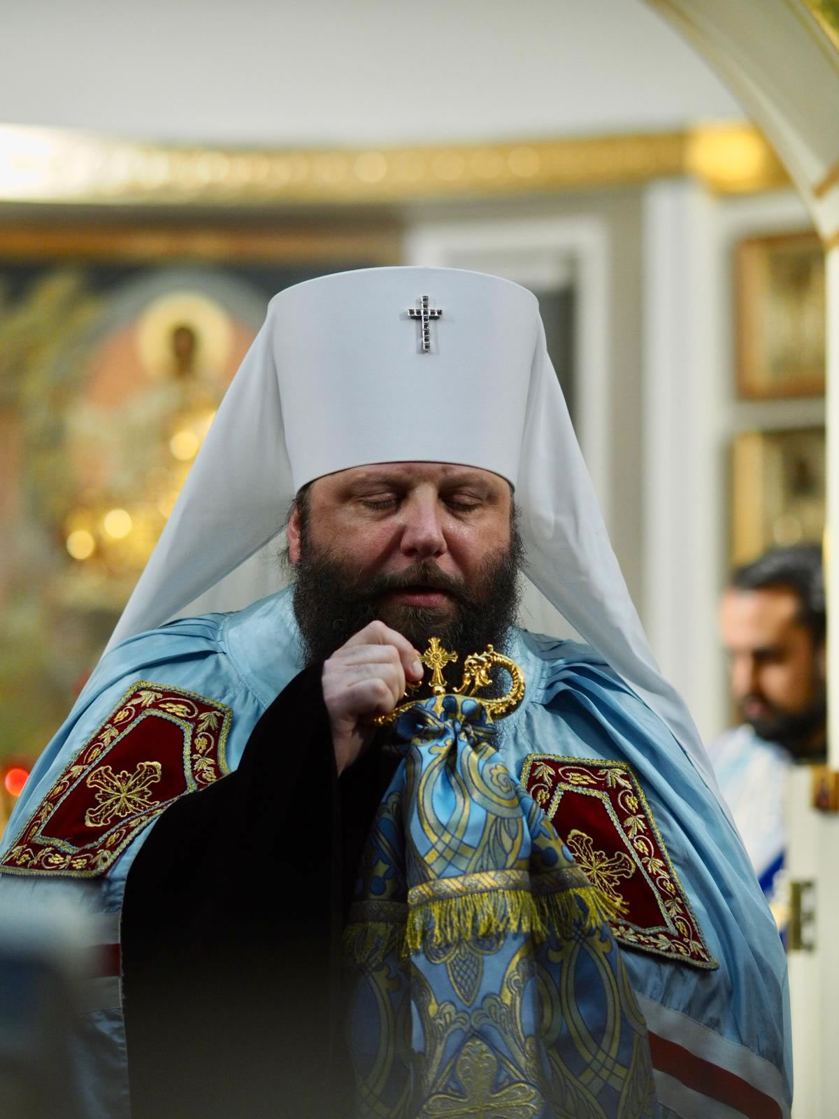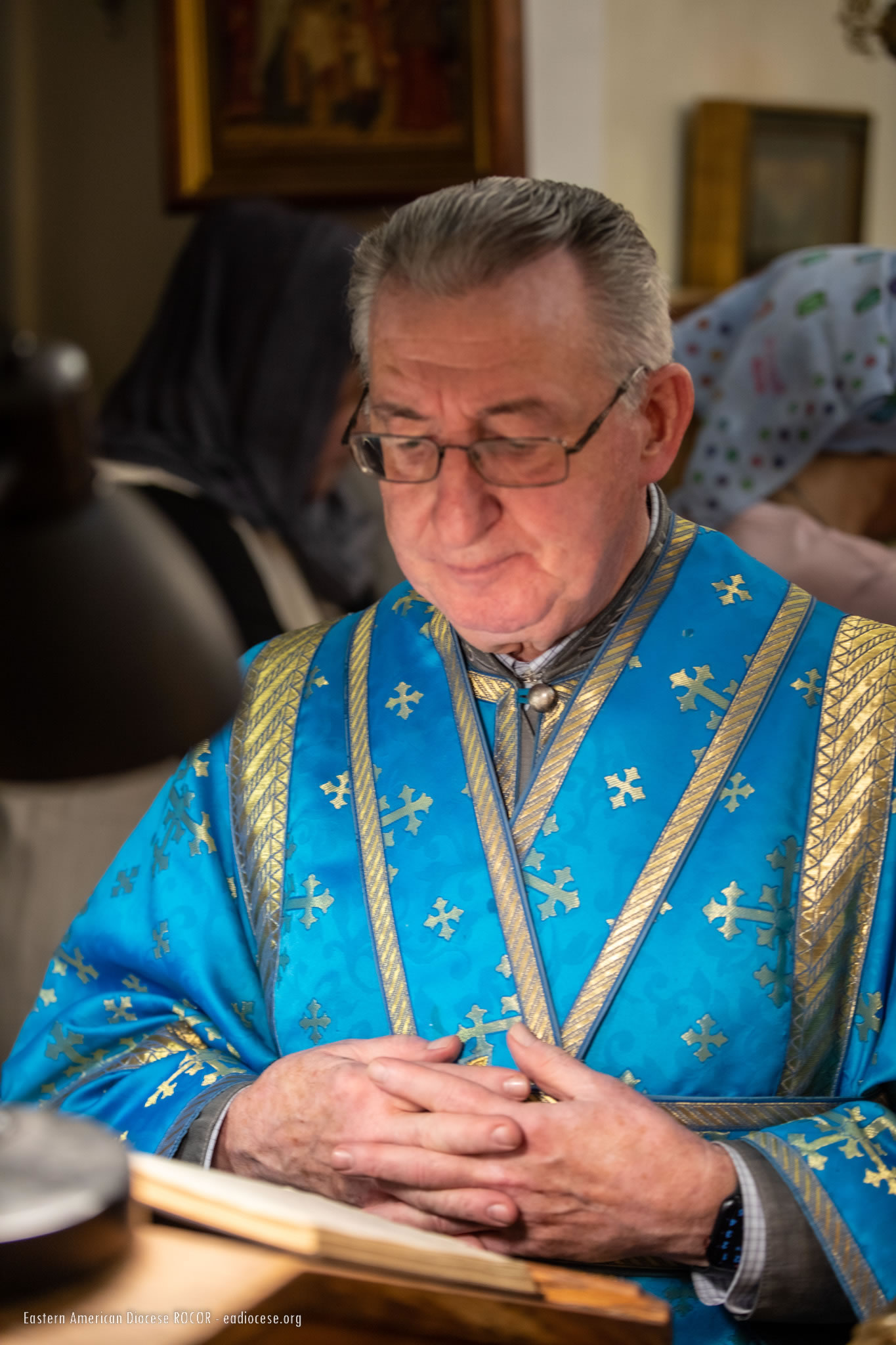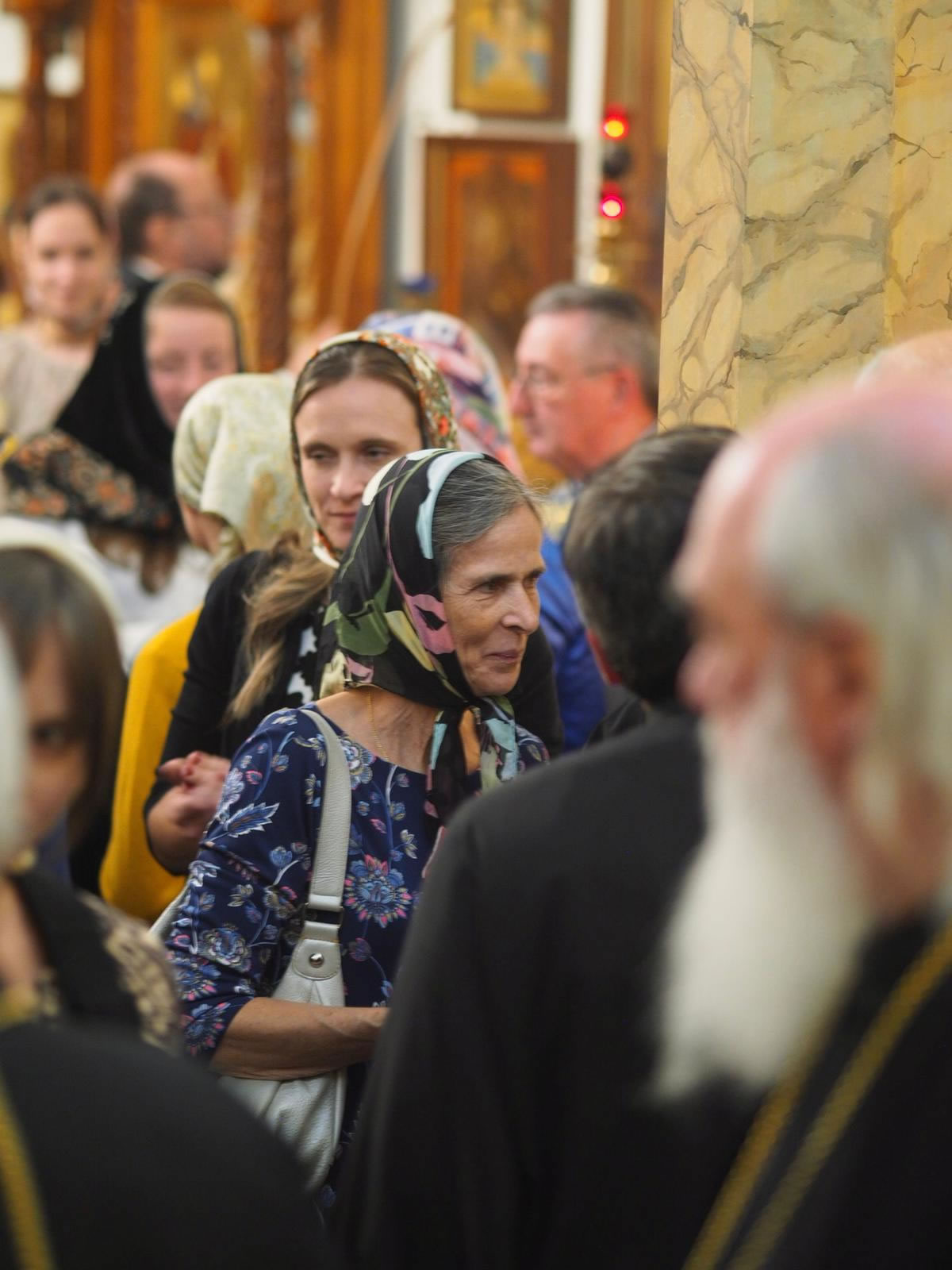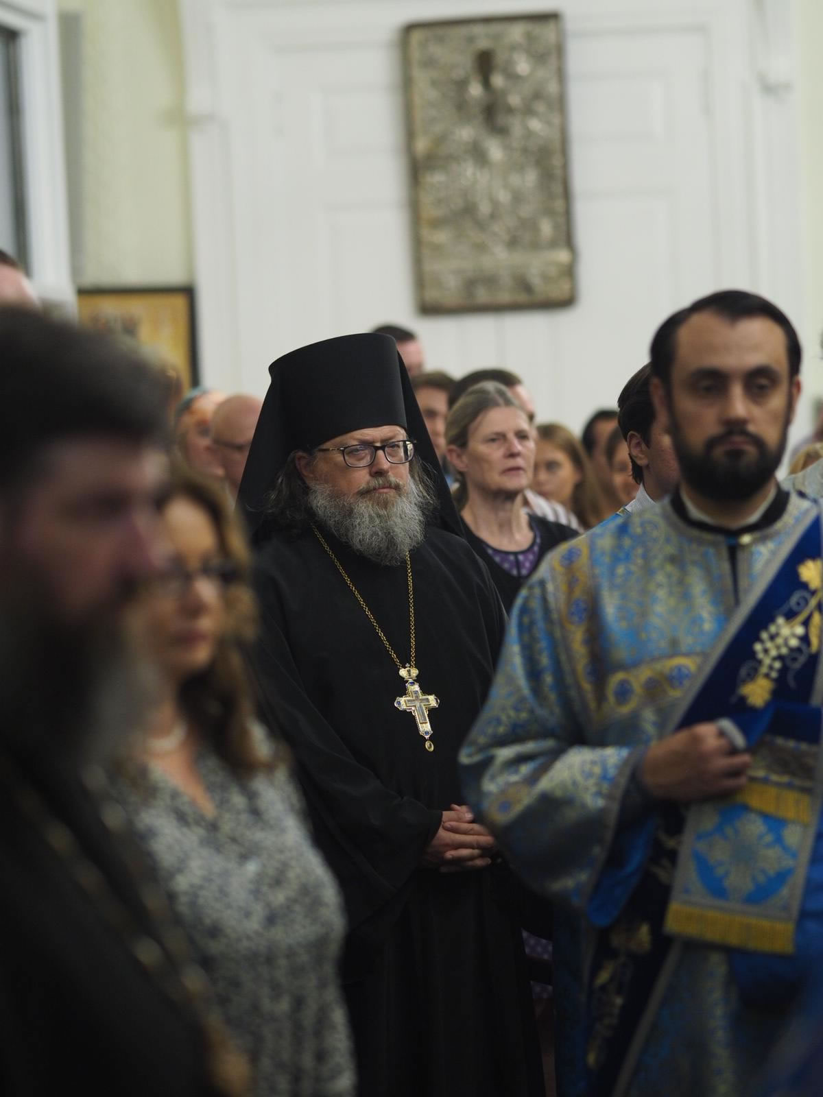 On Saturday, 17 September, 2022, at the end of all-night vigil at the Synodal Cathedral of Our Lady “of the Sign” in New York, His Grace Bishop Nicholas of Manhattan, newly-elected First Hierarch of the Russian Orthodox Church Outside of Russia, emerged through the Royal Doors to the ambo in his black klobuk and common episcopal mantle. His Eminence Metropolitan Mark of Berlin and German and His Eminence Archbishop Kyrill of San Francisco and Western America then endowed the blue mantle and white klobuk to him, which he donned with the aid of attending subdeacons.