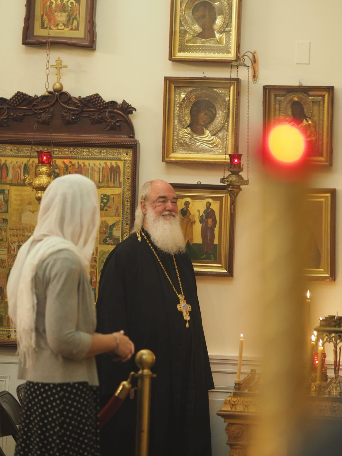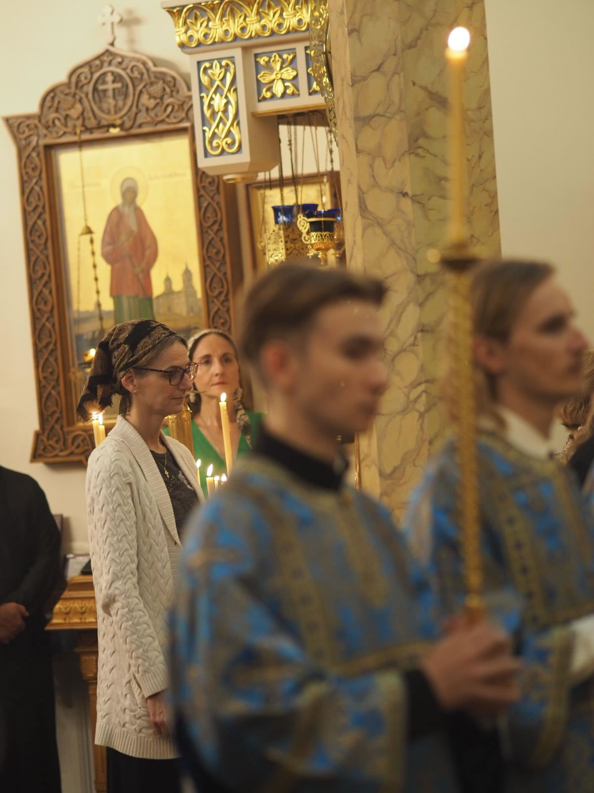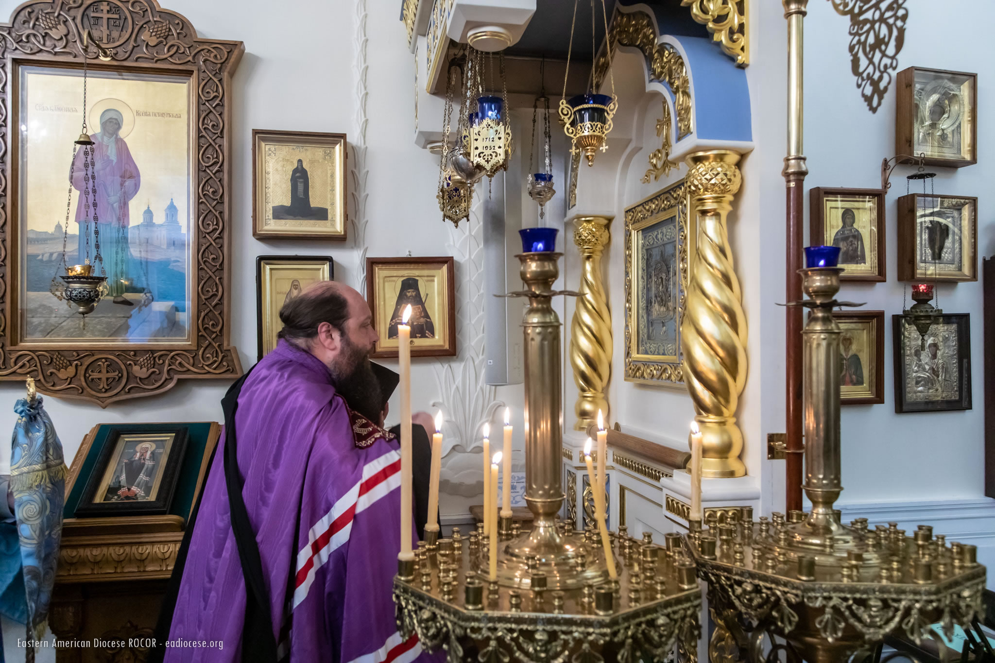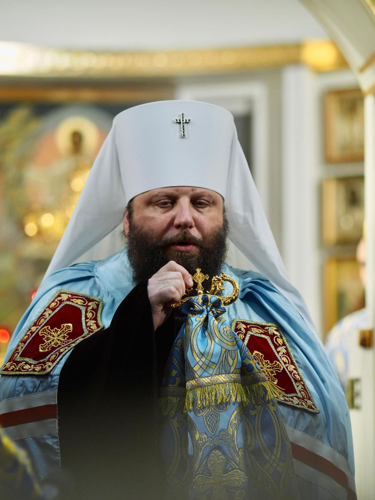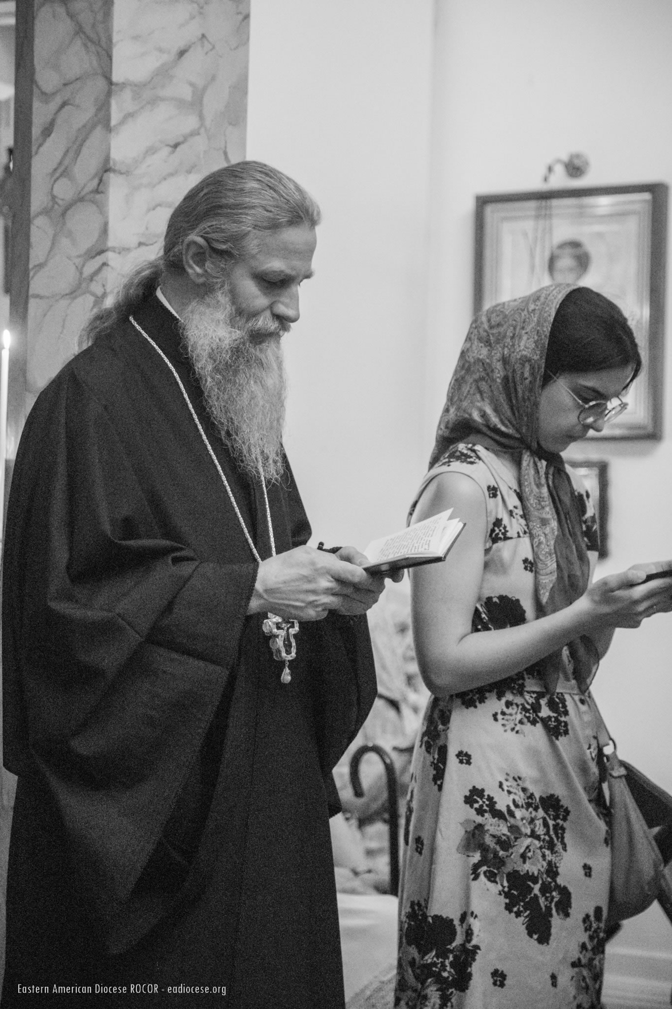 On Saturday, 17 September, 2022, at the end of all-night vigil at the Synodal Cathedral of Our Lady “of the Sign” in New York, His Grace Bishop Nicholas of Manhattan, newly-elected First Hierarch of the Russian Orthodox Church Outside of Russia, emerged through the Royal Doors to the ambo in his black klobuk and common episcopal mantle. His Eminence Metropolitan Mark of Berlin and German and His Eminence Archbishop Kyrill of San Francisco and Western America then endowed the blue mantle and white klobuk to him, which he donned with the aid of attending subdeacons.
