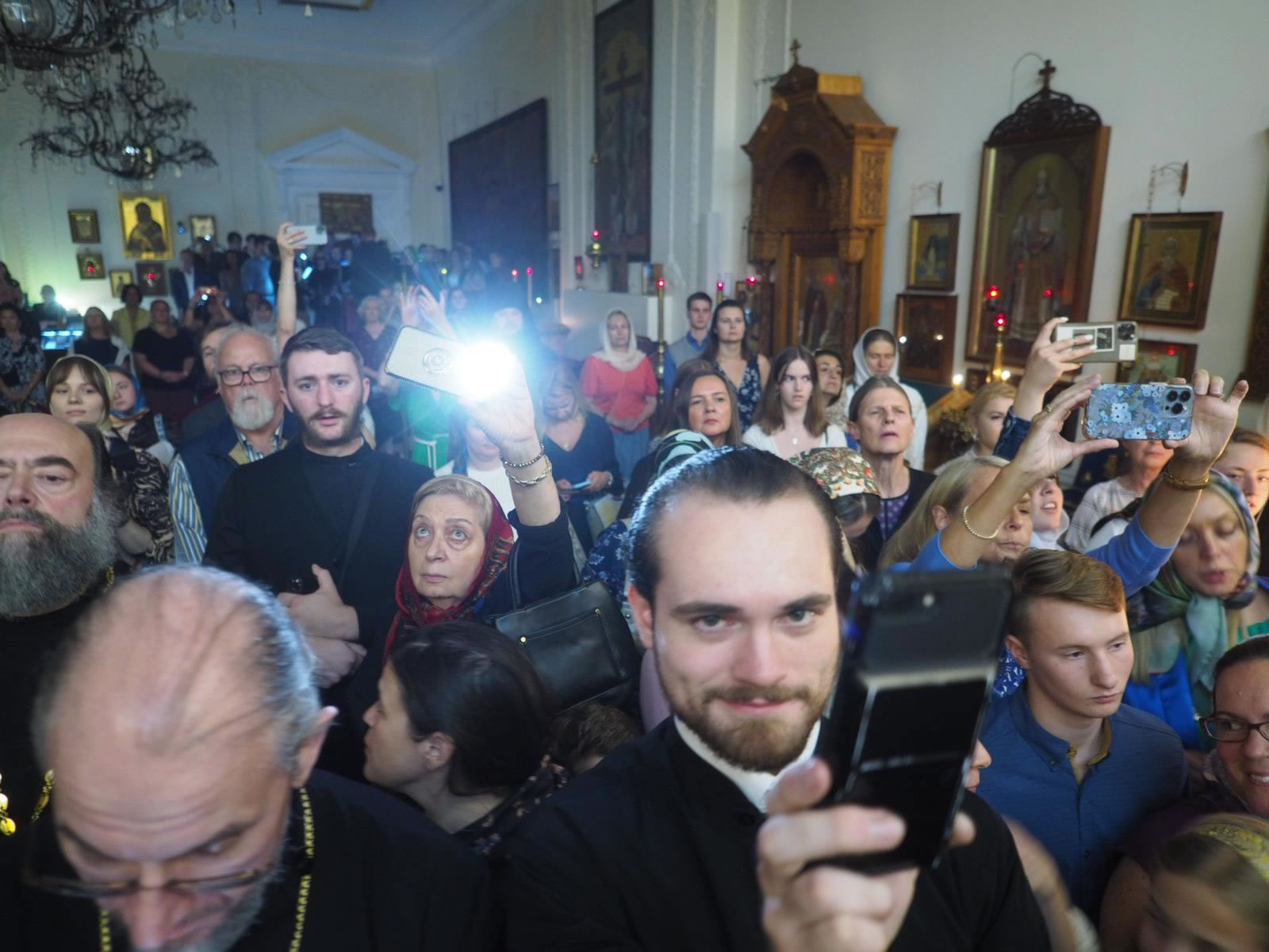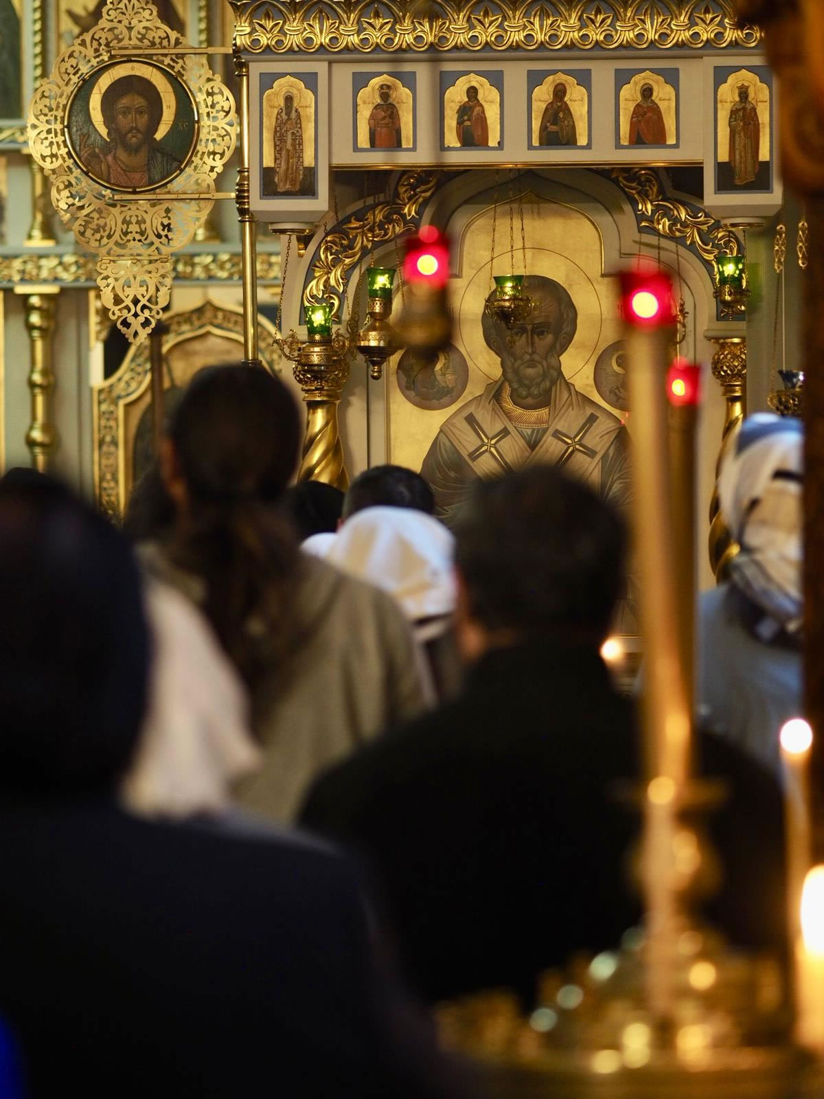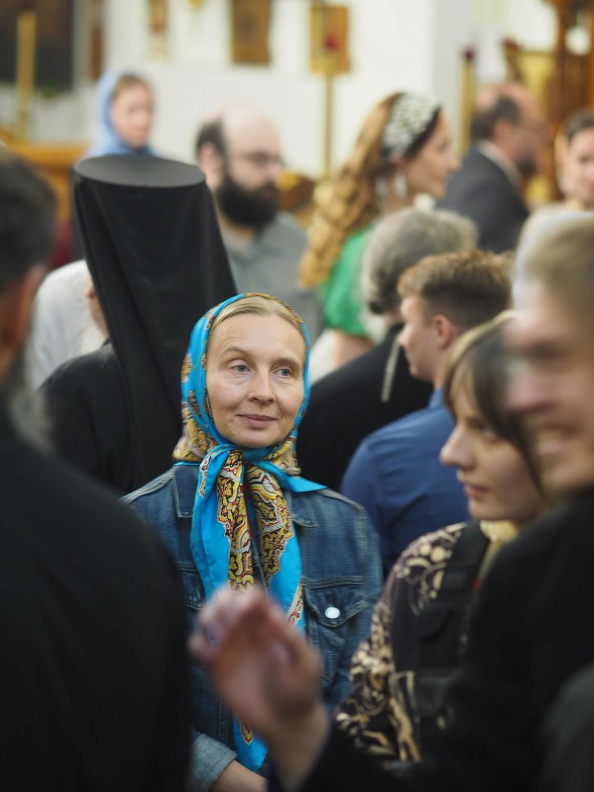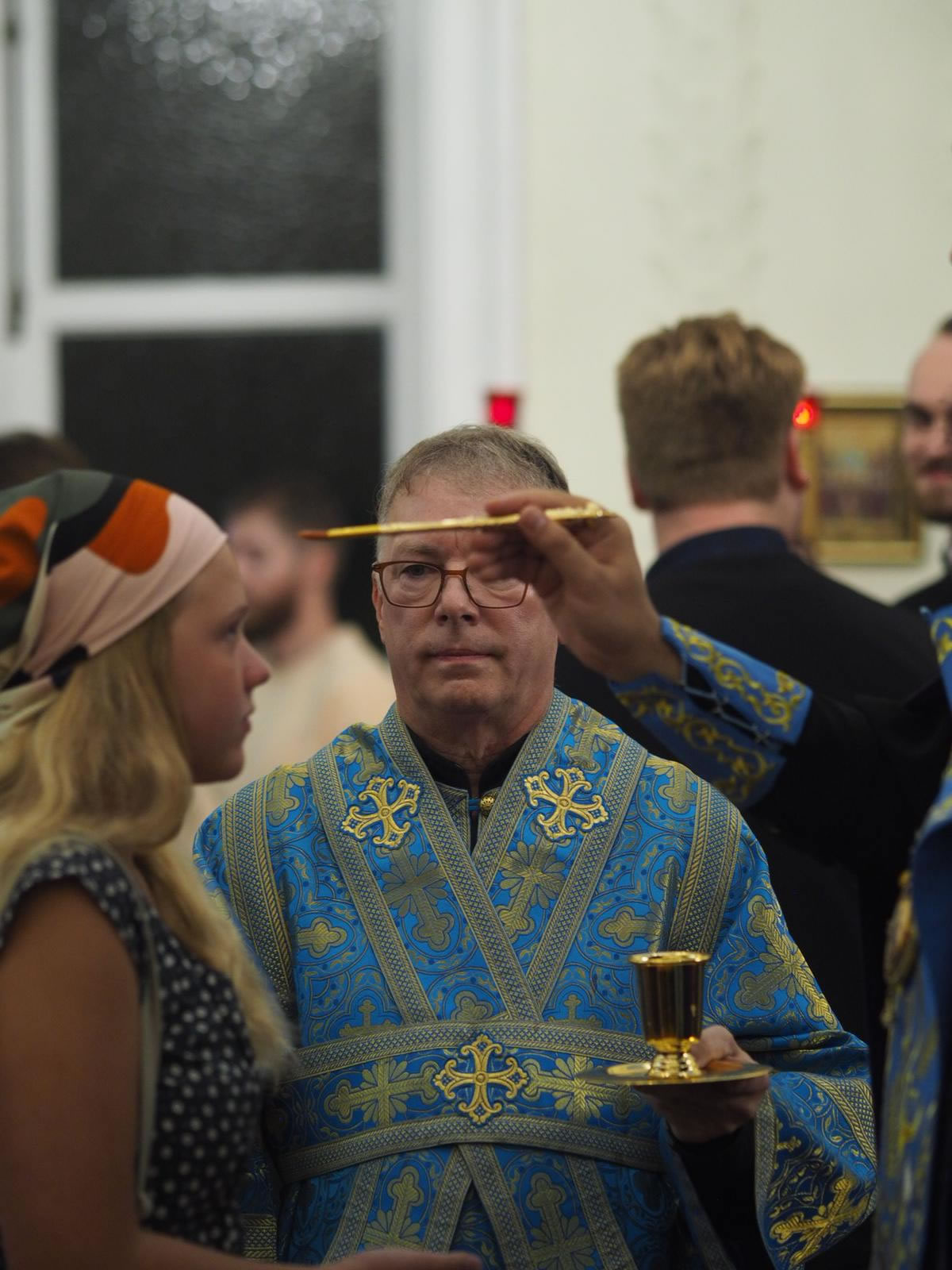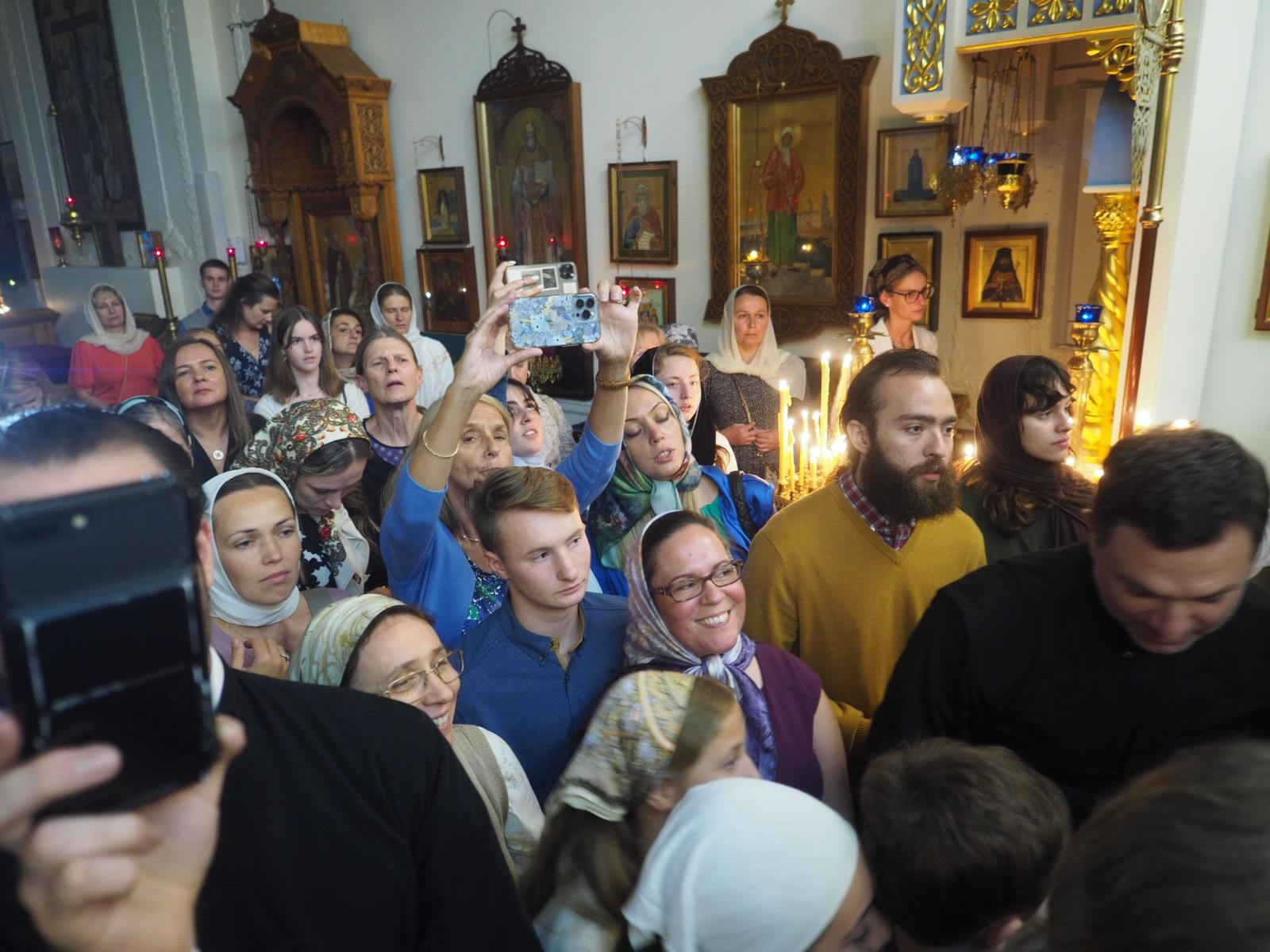 On Saturday, 17 September, 2022, at the end of all-night vigil at the Synodal Cathedral of Our Lady “of the Sign” in New York, His Grace Bishop Nicholas of Manhattan, newly-elected First Hierarch of the Russian Orthodox Church Outside of Russia, emerged through the Royal Doors to the ambo in his black klobuk and common episcopal mantle. His Eminence Metropolitan Mark of Berlin and German and His Eminence Archbishop Kyrill of San Francisco and Western America then endowed the blue mantle and white klobuk to him, which he donned with the aid of attending subdeacons.