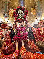 At the conclusion of the Great Doxology of the vigil, Bishop Irenei performed the Rite of the Elevation of the Cross - a special service for the feast, served only in major cathedrals by a Bishop. The precious Cross of Christ, having been solemnly borne into the center of the temple and adorned with beautiful flowers, was, five times, slowly lowered to the earth and then raised high above the heads of all by the Hierarch, as the choir sang "Lord, have mercy" 100 times for each for the five elevations. Throughout, rose-water was poured by the priests upon the Cross in the Bishop’s hands, symbolising the life that flows from the Cross of the Saviour - and this water fell upon flowers that were later distributed to the faithful.
