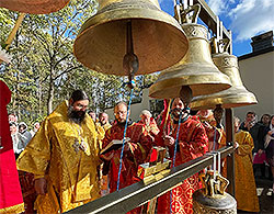 Three years ago, the Parish of Tsarina-Martyr Alexandra of the German Diocese of the Russian Orthodox Church Outside of Russia in Siegen, Germany, acquired a Protestant church building, located on a picturesque hill on the outskirts of town at the end of Zwingli Street. His Grace Bishop Job of Stuttgart visited the parish and officiated at its feast-day celebrations. The parishioners expressed a special devotion and love for the church and its adornment, the details of the festive divine services and the organization of a trapeza luncheon. The church edifice, constructed in the 1980’s, suits the parish’s needs very well. In order to mark the building as an Orthodox church, Vladyka Job consecrated a small cupola crowned with a cross above the entrance, and also a set of bells. Before Divine Liturgy, he ordained the choir director, Alexander Wisner, as a reader. Nine priests and two deacons were in attendance, visiting from neighboring parishes.