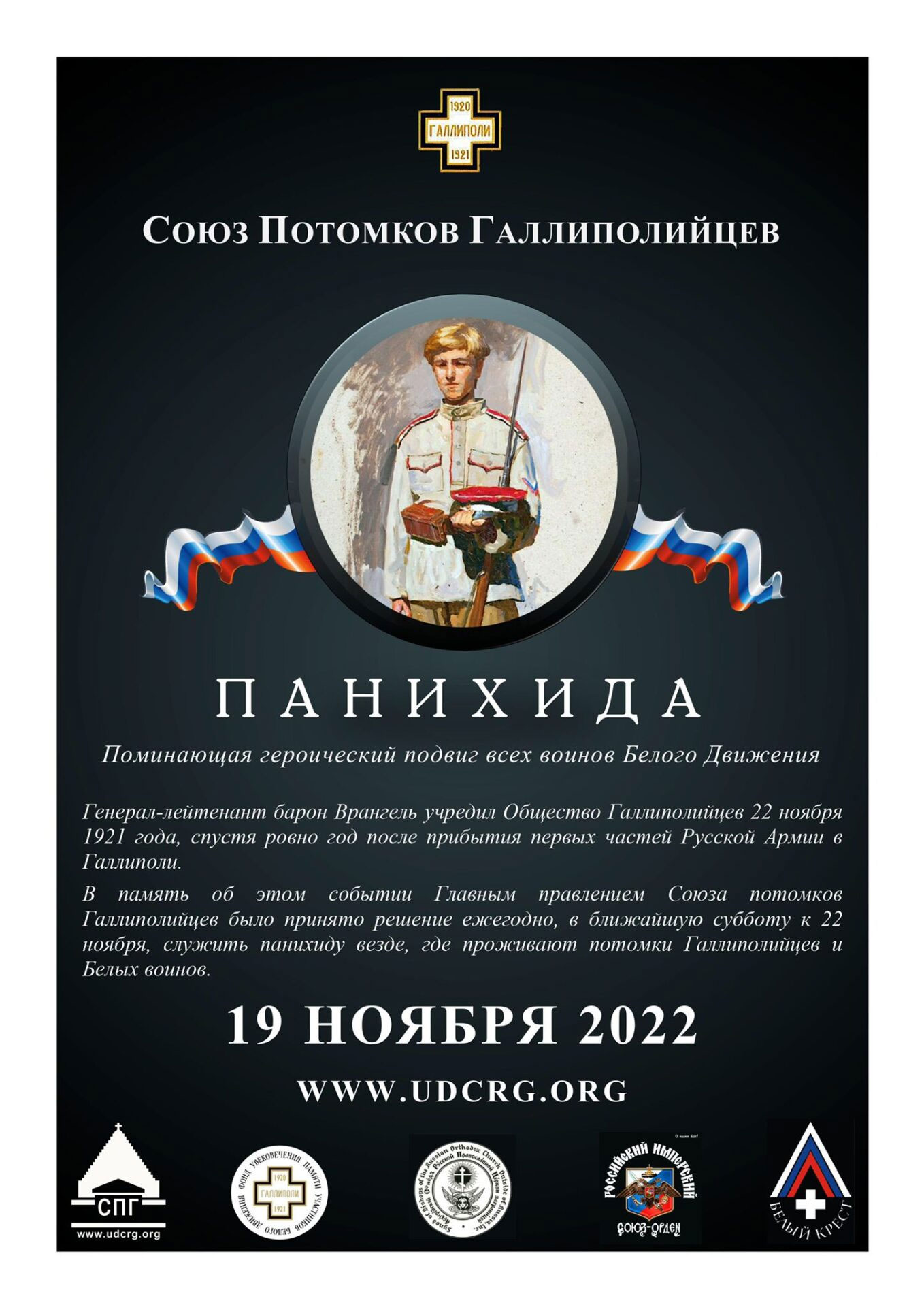 he Administration of the Union of the Descendants of the Combatants of Gallipoli decided that every year, on the Saturday closest to November 22, wherever the descendants of the people of Gallipoli might live, there be a pannikhida served. We ask that such descendants that can arrange such memorial services send details at the following address: contact@udcrg.org
