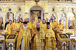 His Eminence then celebrated Divine Liturgy, co-served by: Fr Dimitri, Archpriest Andrei Alexiev (cleric of the Mid-American Diocese; retired), Archpriest Andrew Nelko (OCA cleric; retired), Archpriest Leonid Kalinin (cleric of the Moscow Patriarchate), Priest Joseph Romanchak (Rector of St Basil the Great Church in Belle Vernon, PA), and Deacon Andrei Garine and Deacon Andrew Temple (cleric of Christ the Savior Church in Wayne, WV). Praying in the altar was Archpriest Michael Hatrak (OCA cleric; retired).