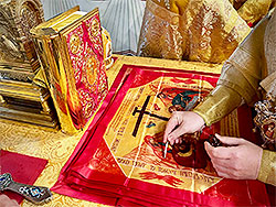 The antimins is the cloth on which every celebration of the Divine Liturgy is served, whether in the smallest Orthodox chapel or the grandest cathedral. It is a square cloth on which is depicted an icon of Christ being taken down from the Cross, and into which are sealed the sacred relics of martyrs and saints — thus carrying on a practice of Orthodoxy since the first centuries, that the Divine Liturgy is celebrated, literally, on the bones of the martyrs. As each antimins contains such relics within it, this tradition is thus carried forward in every parish throughout the world.